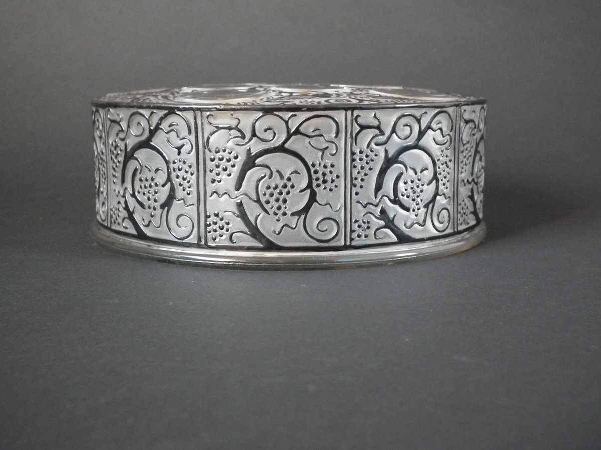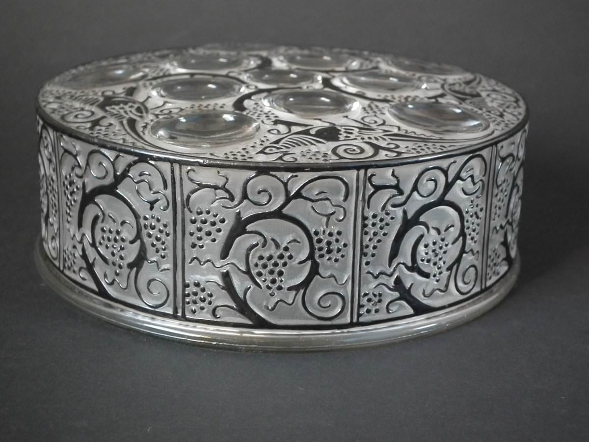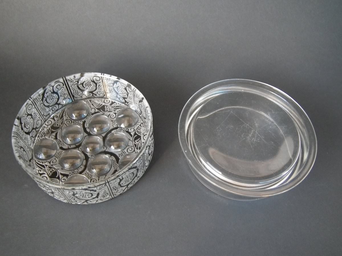 Introduced in 1926. Height: 3.5cm (1.38ins). Width: 13.5cm (5.31ins). Depth: 13.5cm (5.31ins).. Rene Lalique clear and frosted glass box, with black enamelled details. 'Roger' pattern, features stylised fruiting trees and exotic birds.