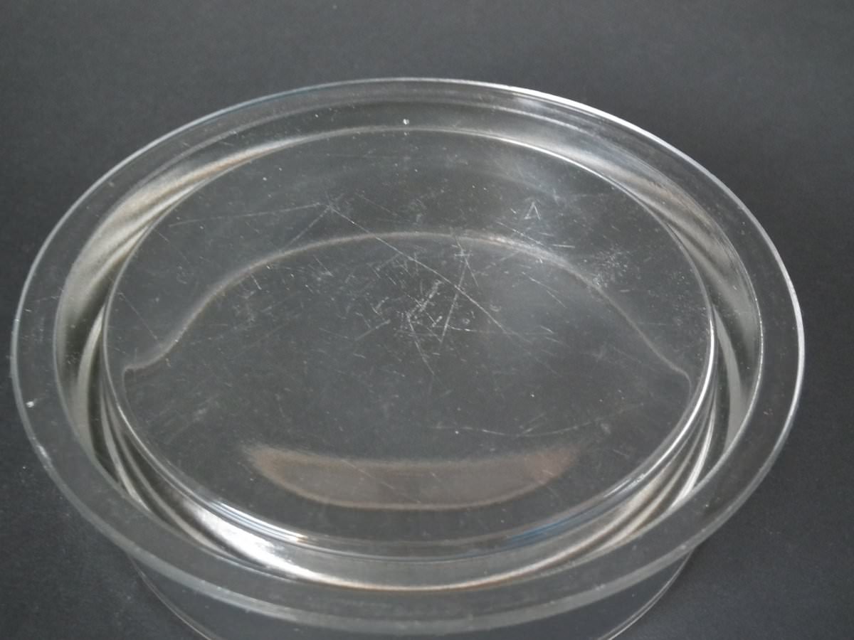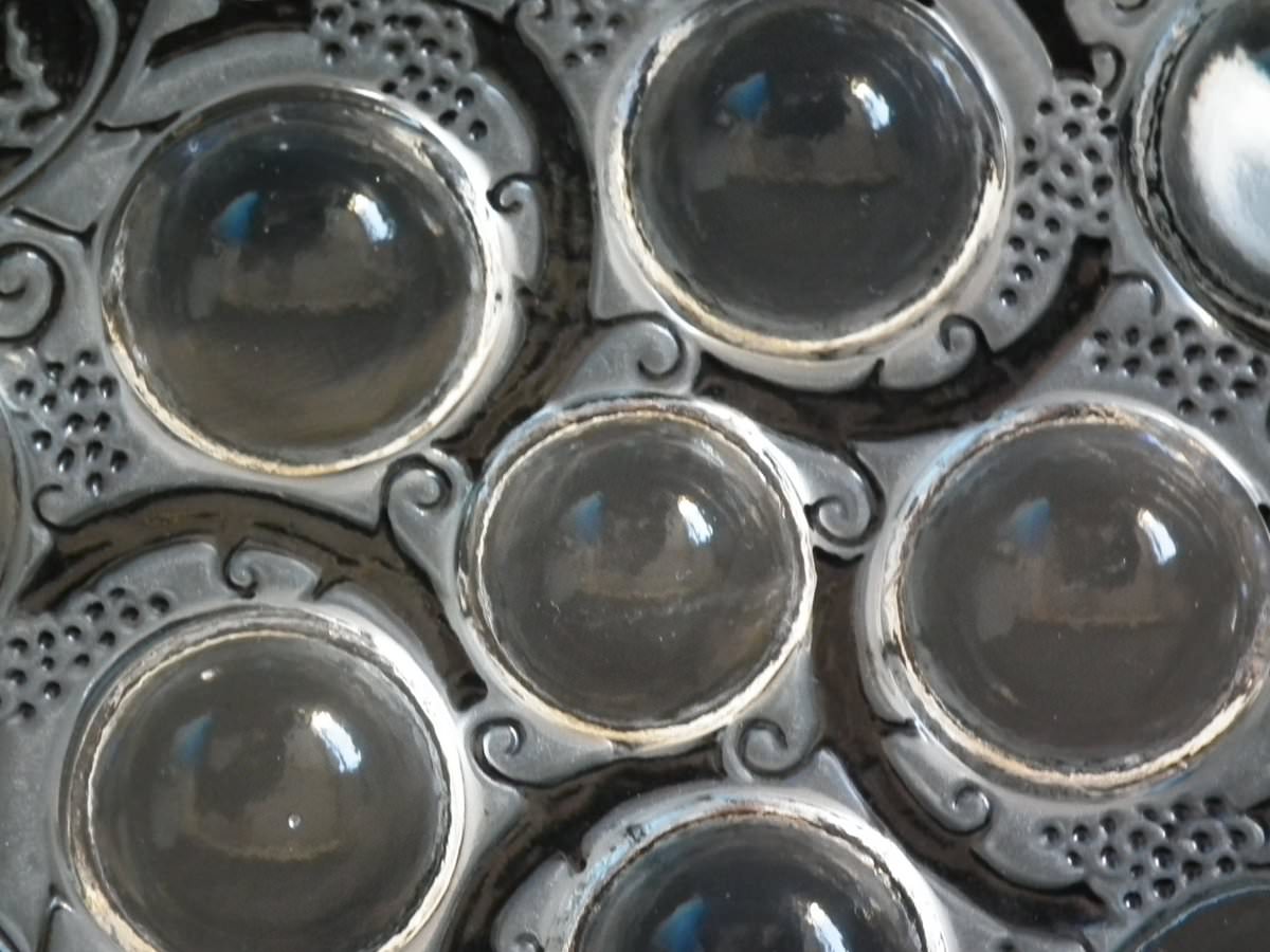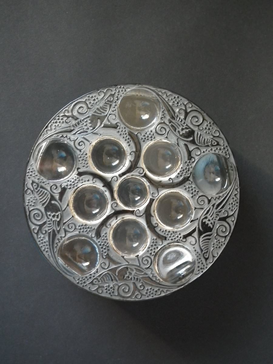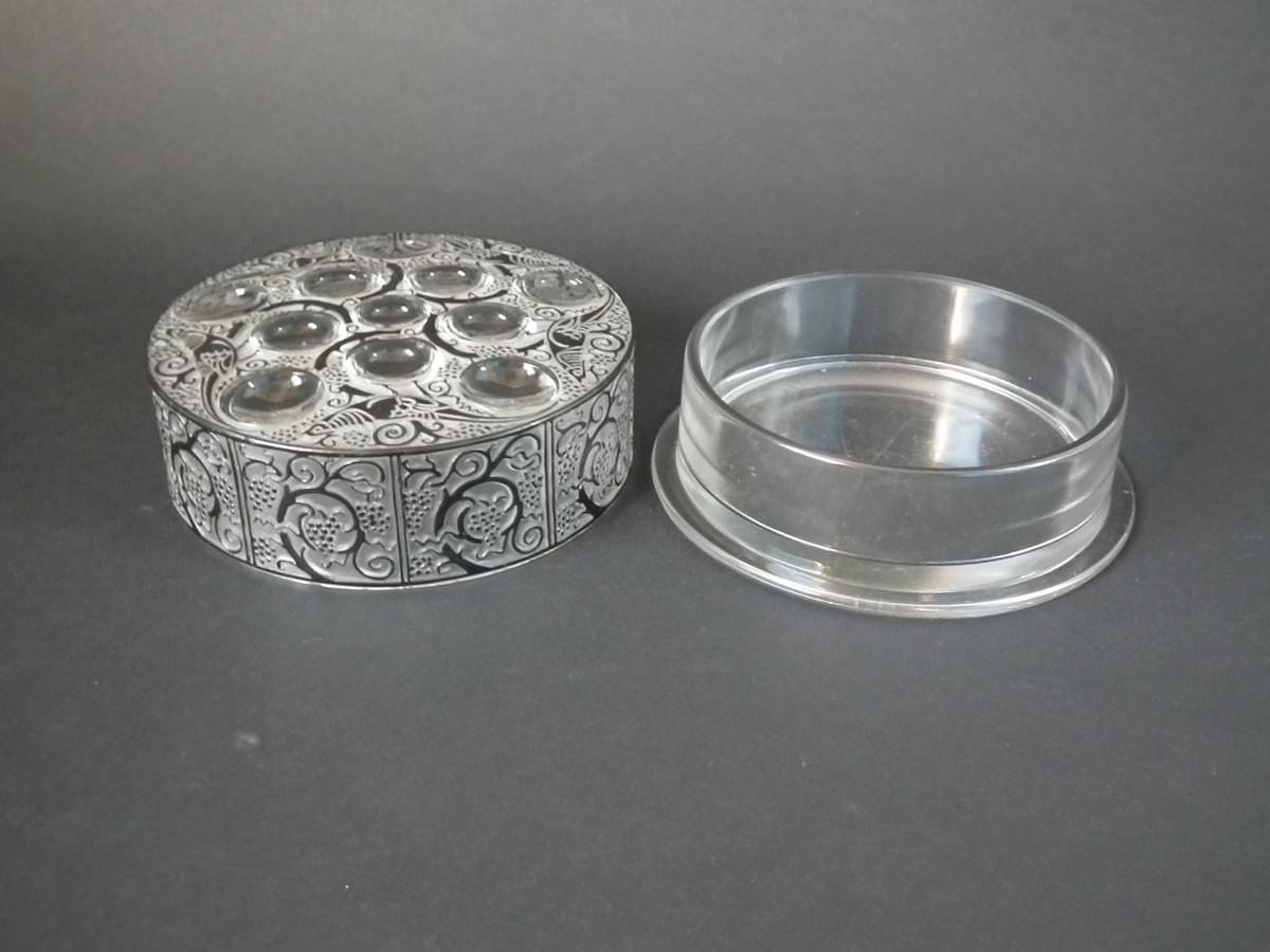 Introduced in 1926. Height: 3.5cm (1.38ins). Width: 13.5cm (5.31ins). Depth: 13.5cm (5.31ins).. Rene Lalique clear and frosted glass box, with black enamelled details. 'Roger' pattern, features stylised fruiting trees and exotic birds.