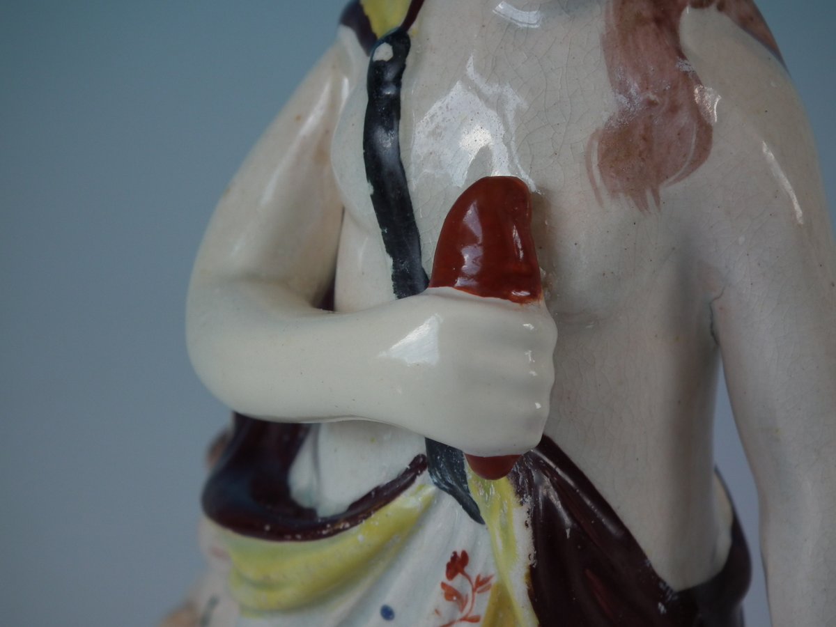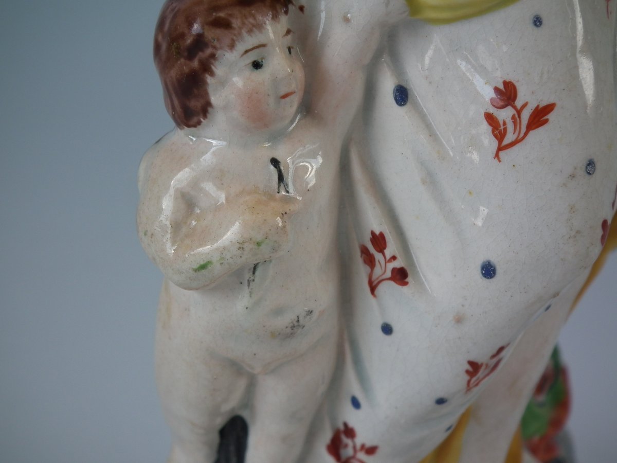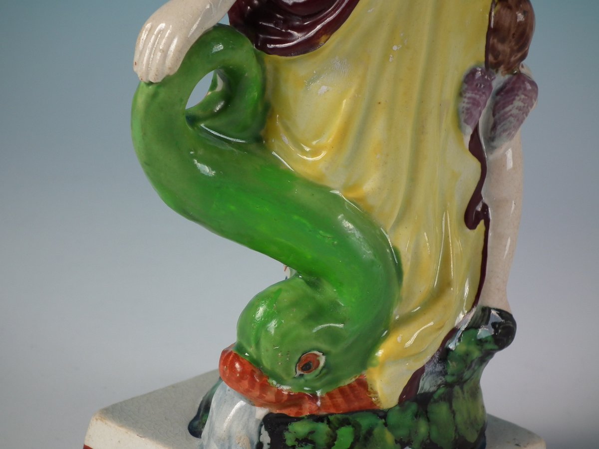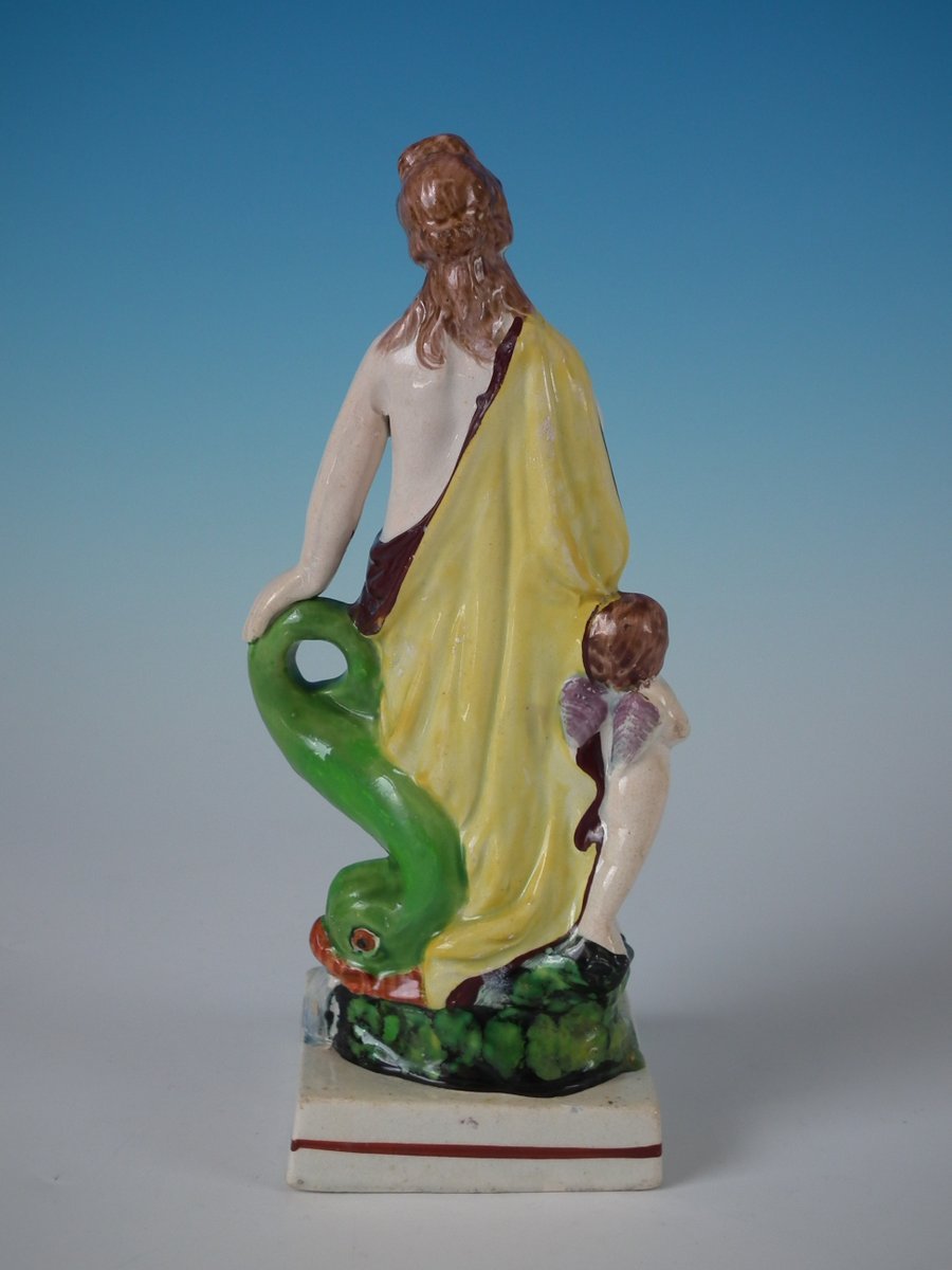 pre-Victorian, circa 1820. 8.7ins high, 4.1ins wide, 3.1ins depth. Staffordshire Pottery pearlware figure with a mythological theme which features Venus
