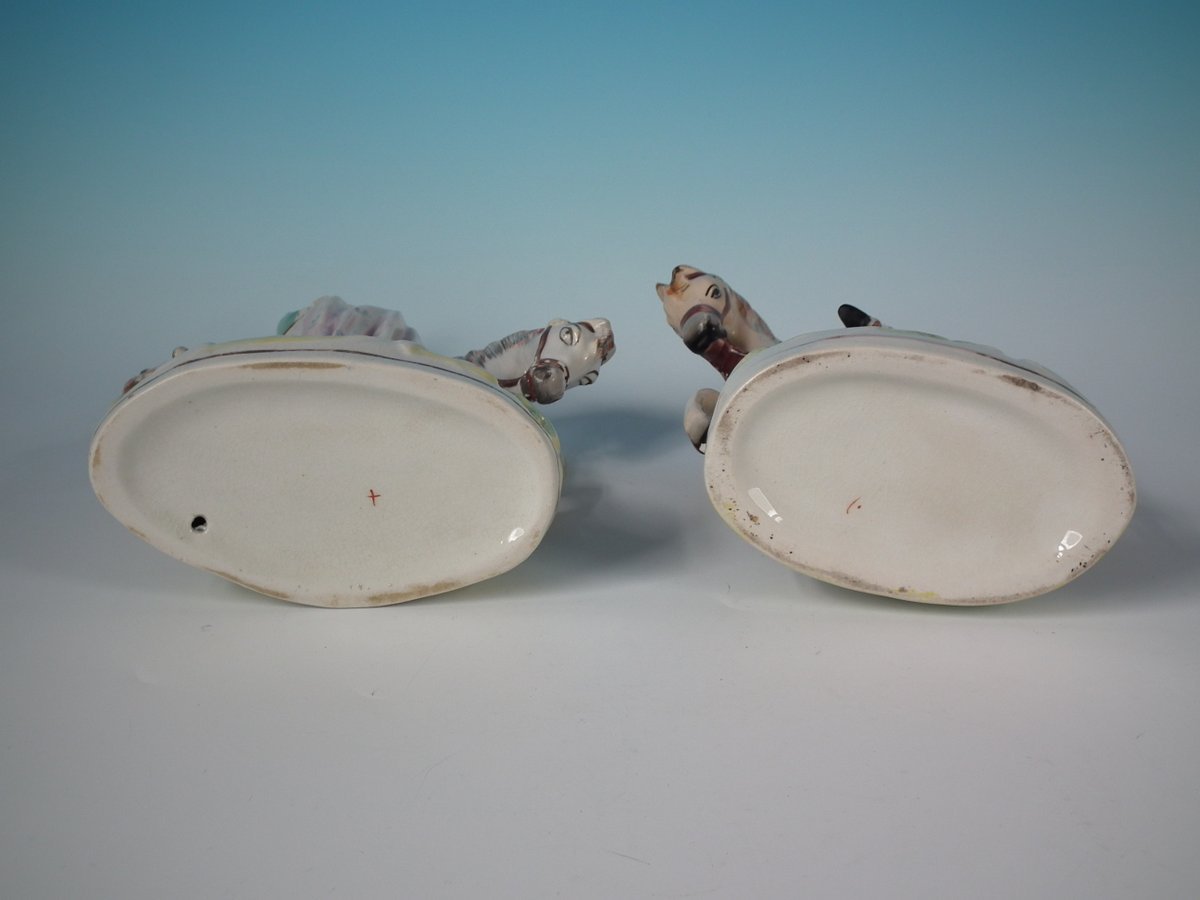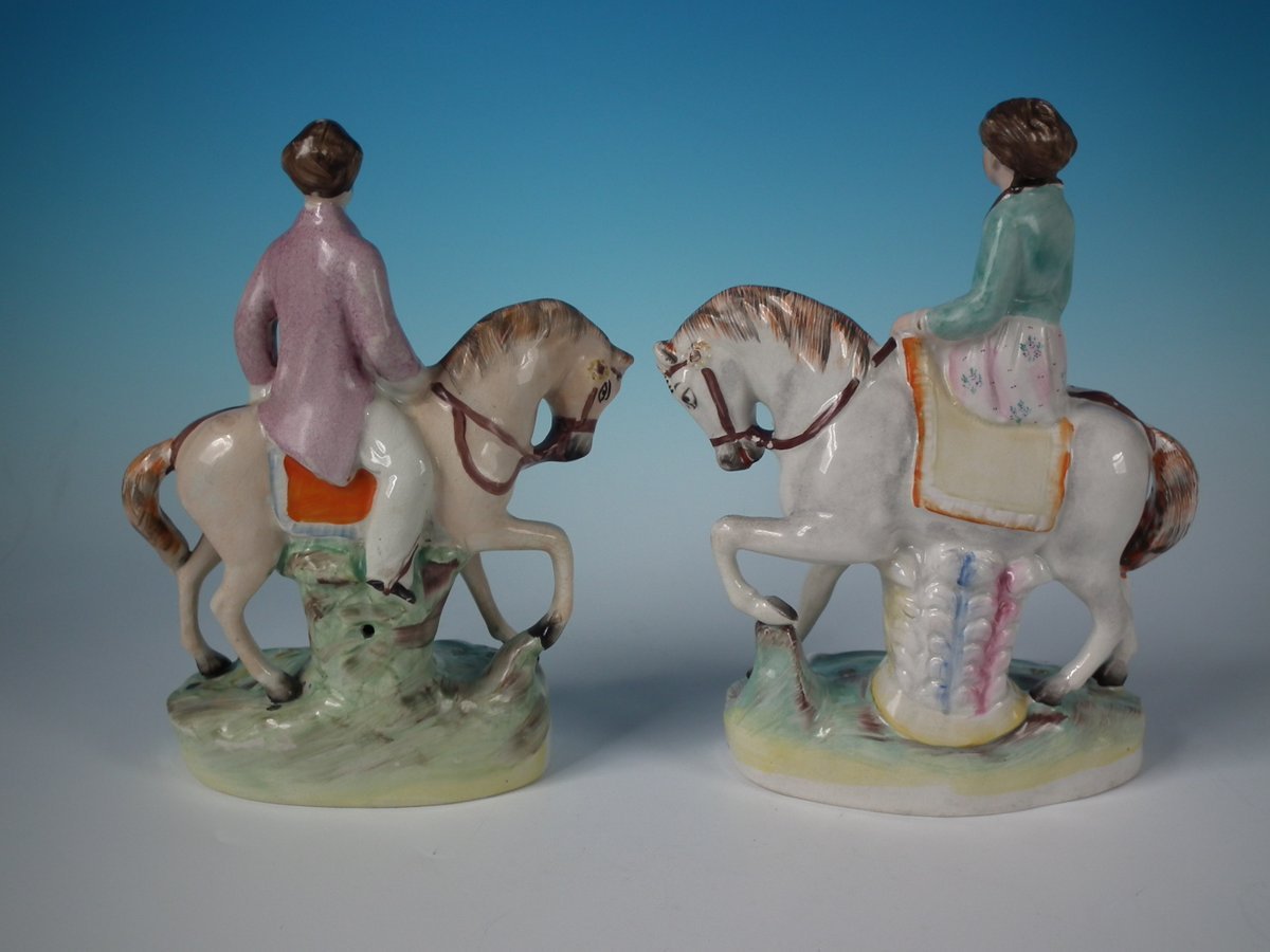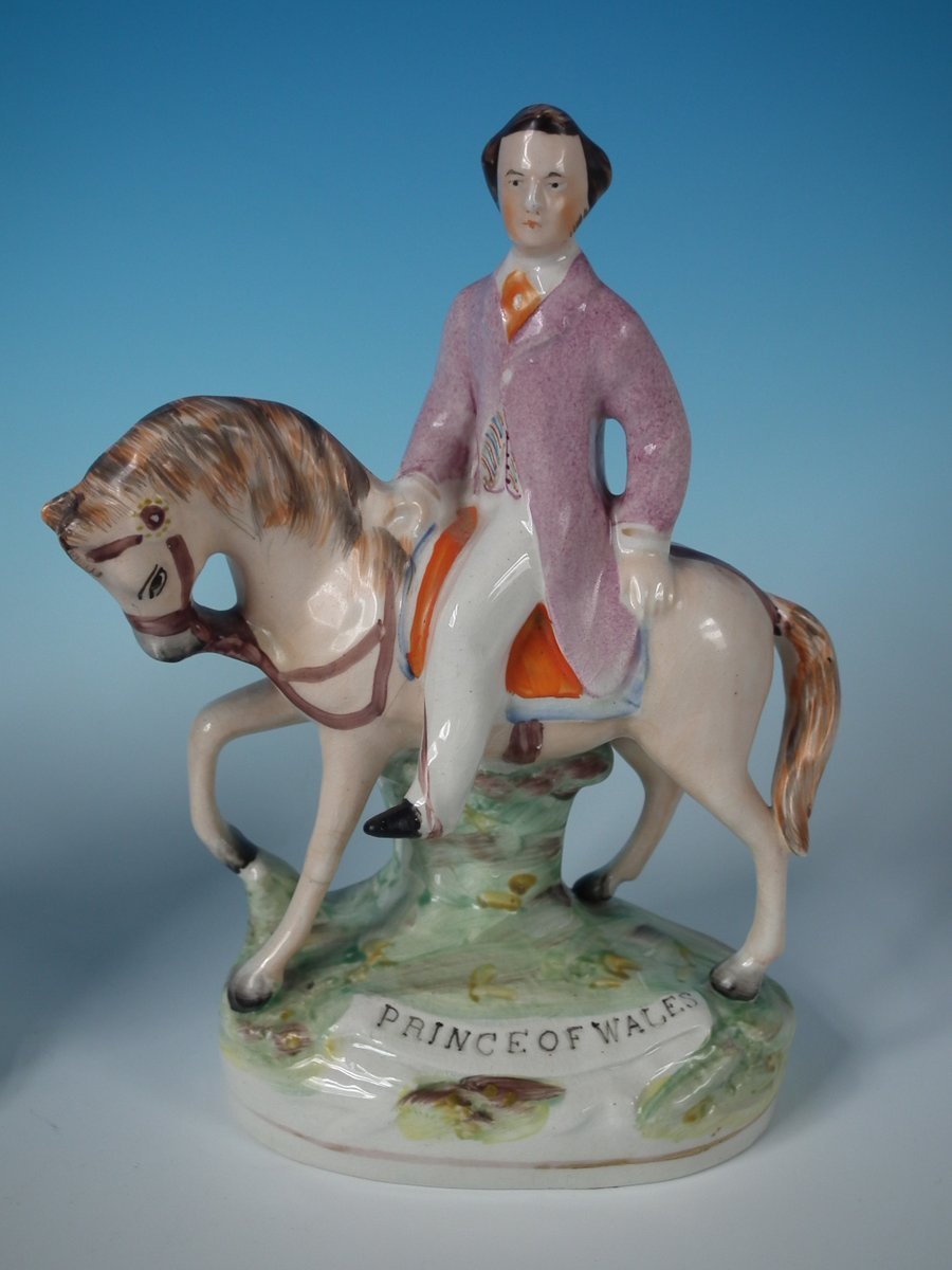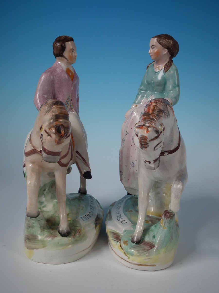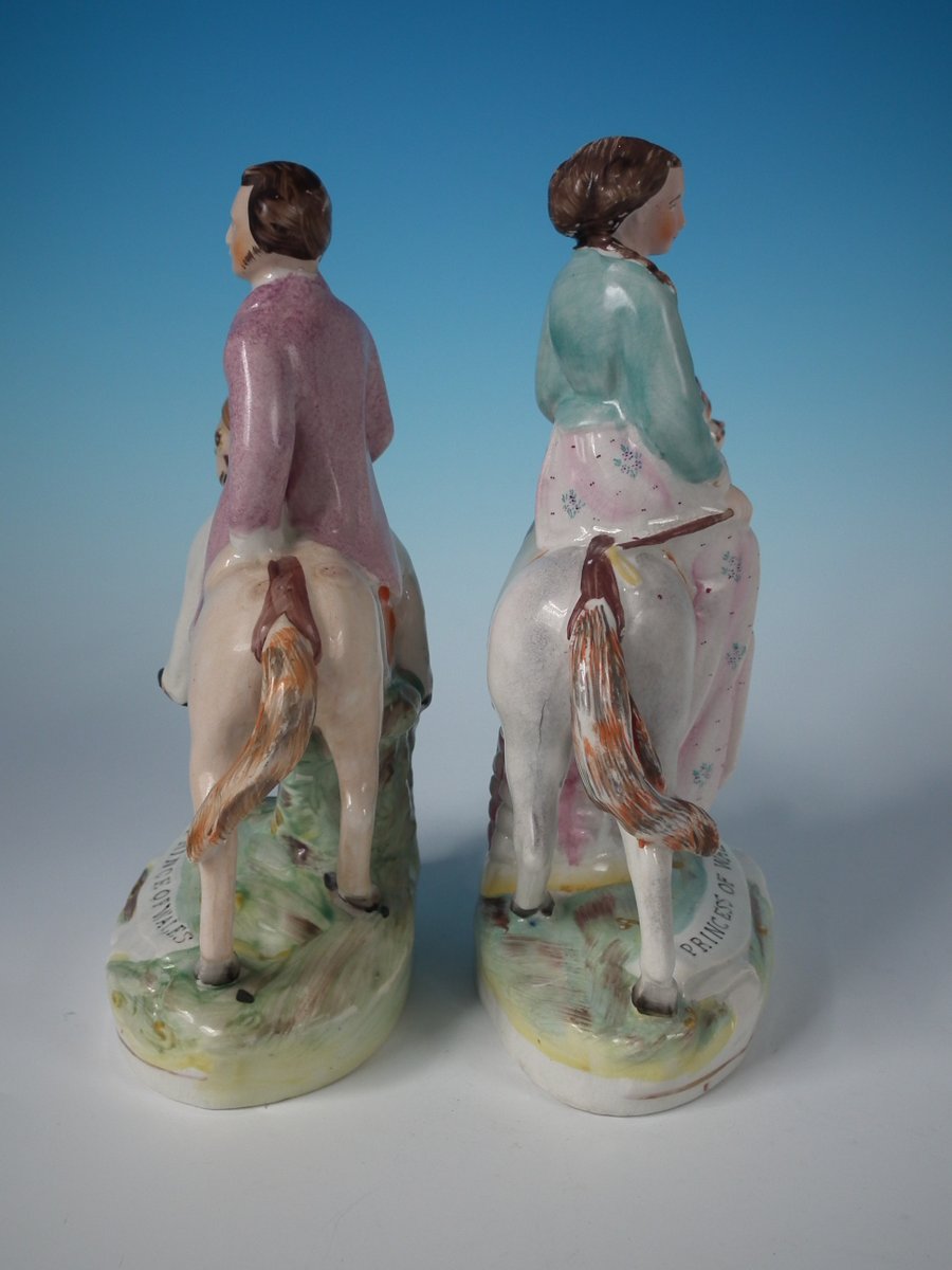 Victorian, circa 1860. Tallest is 8.1ins high, 5.7ins wide, 3ins depth. Pair of Parr Factory Staffordshire Pottery figures with a royalty theme which feature Prince and Princess of Wales on horseback, stood on an oblong base.