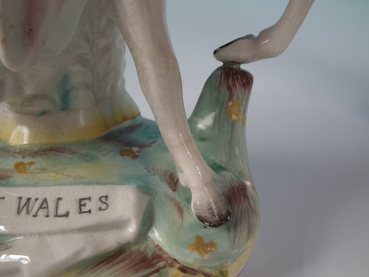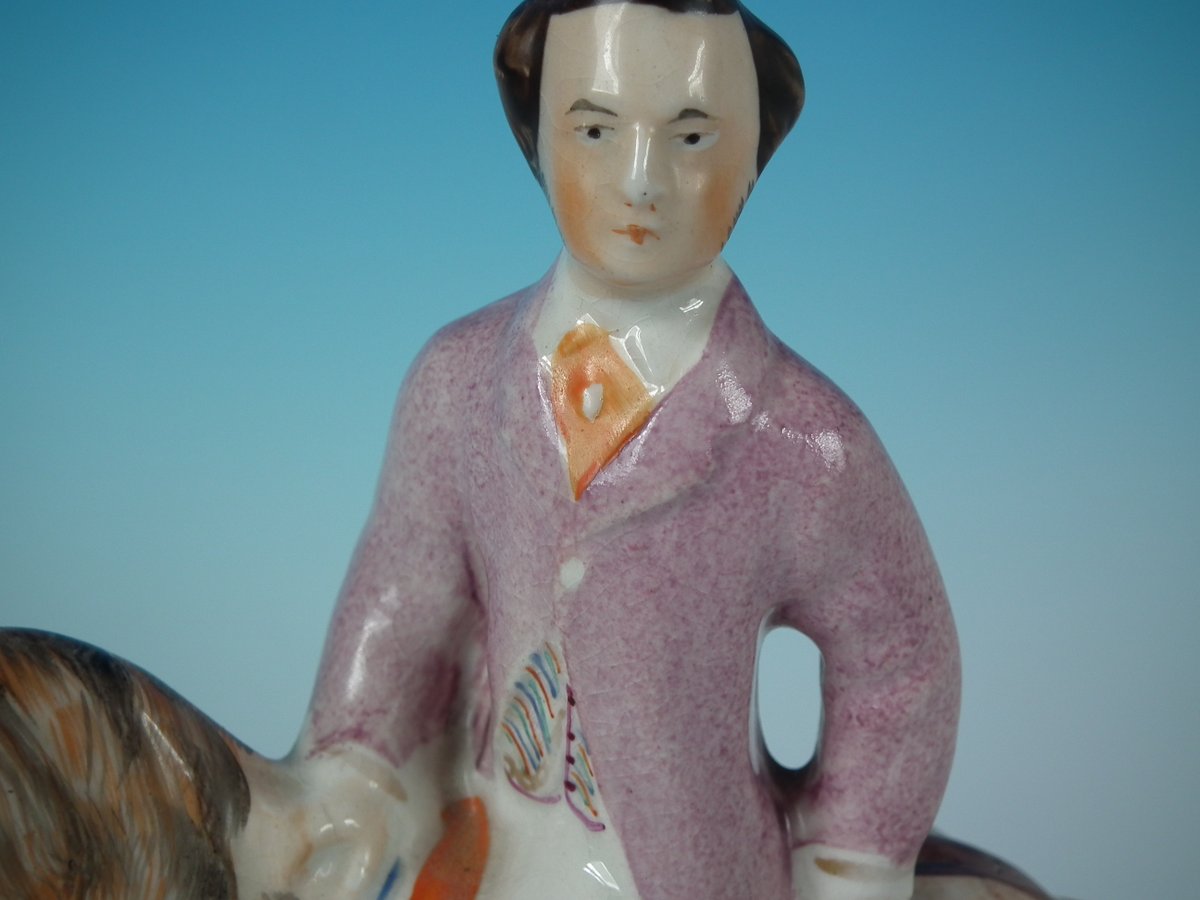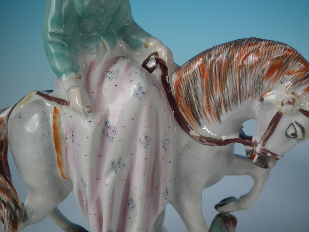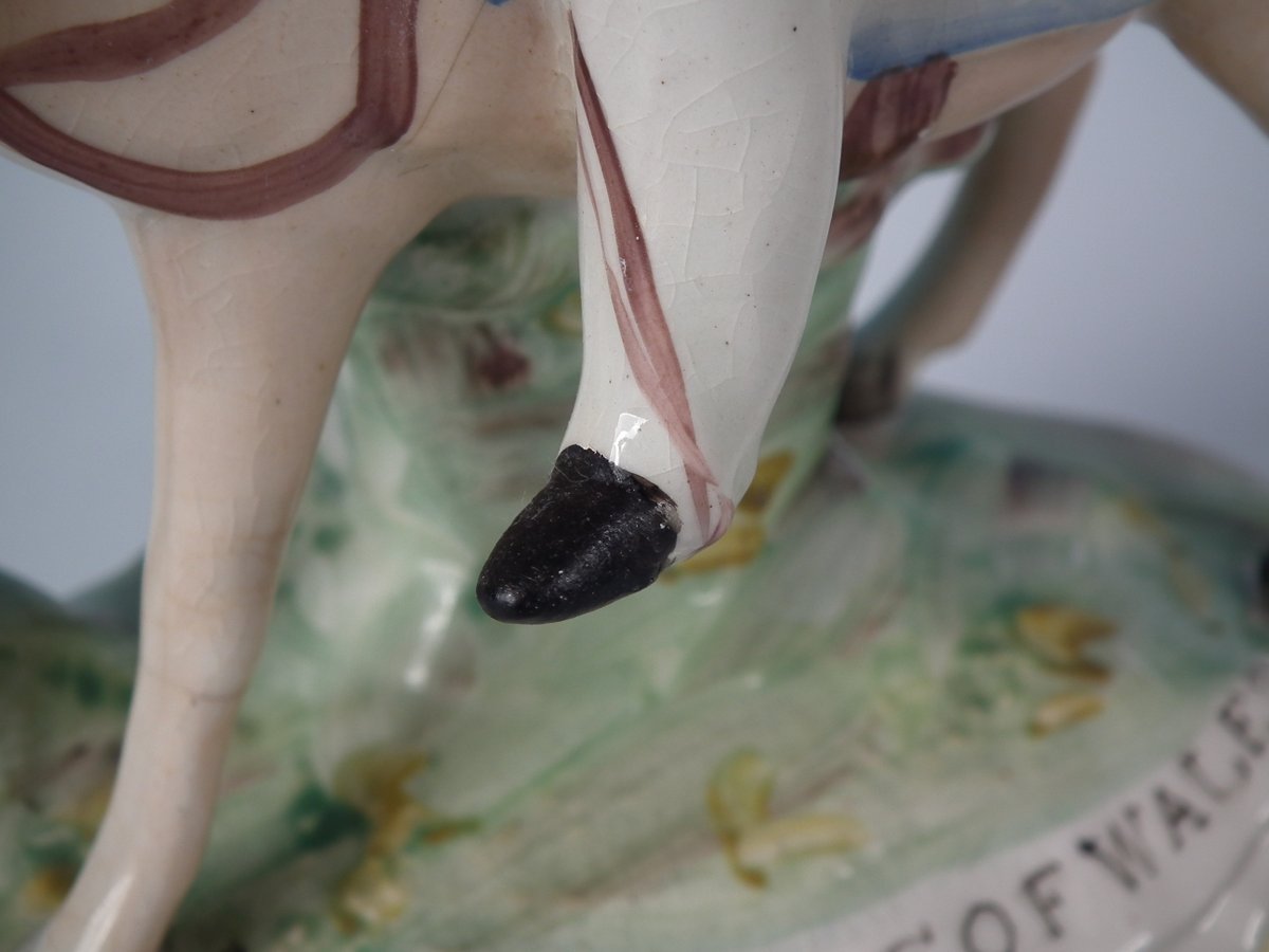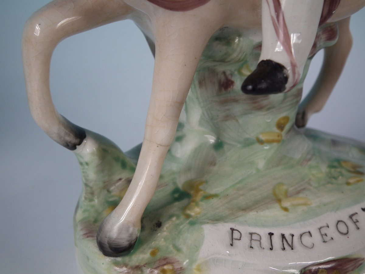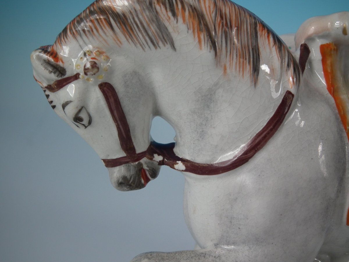 Victorian, circa 1860. Tallest is 8.1ins high, 5.7ins wide, 3ins depth. Pair of Parr Factory Staffordshire Pottery figures with a royalty theme which feature Prince and Princess of Wales on horseback, stood on an oblong base.