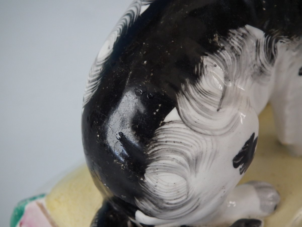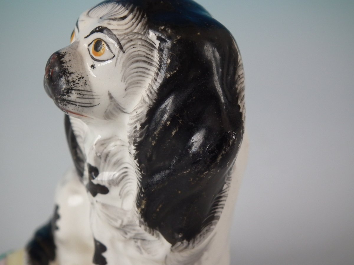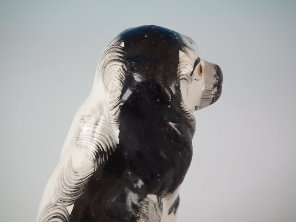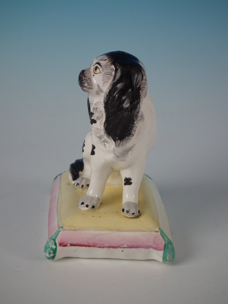 Victorian, circa 1860. 5.1ins high, 4.5ins wide, 3.1ins depth. Staffordshire Pottery figure which features a spaniel,