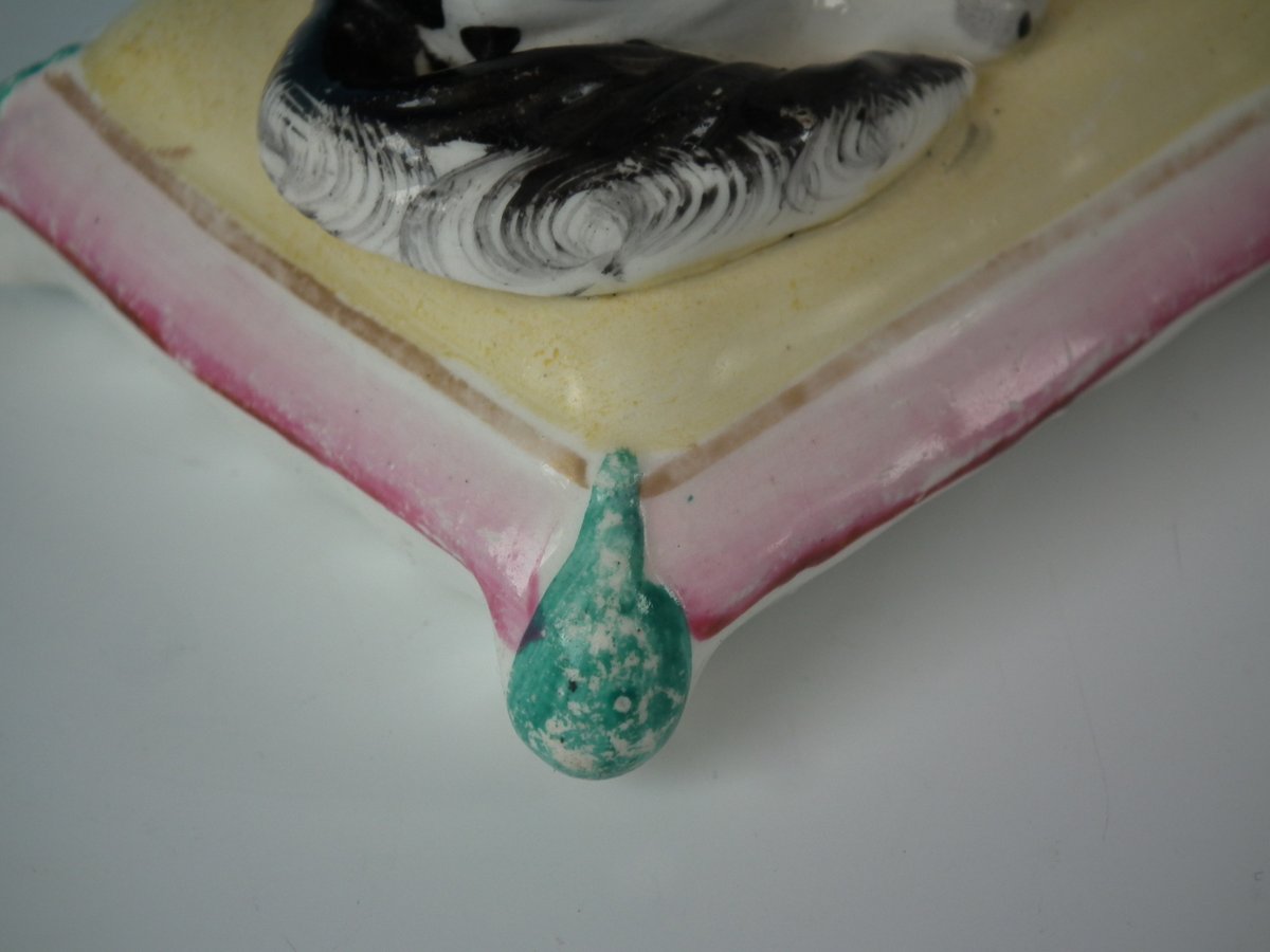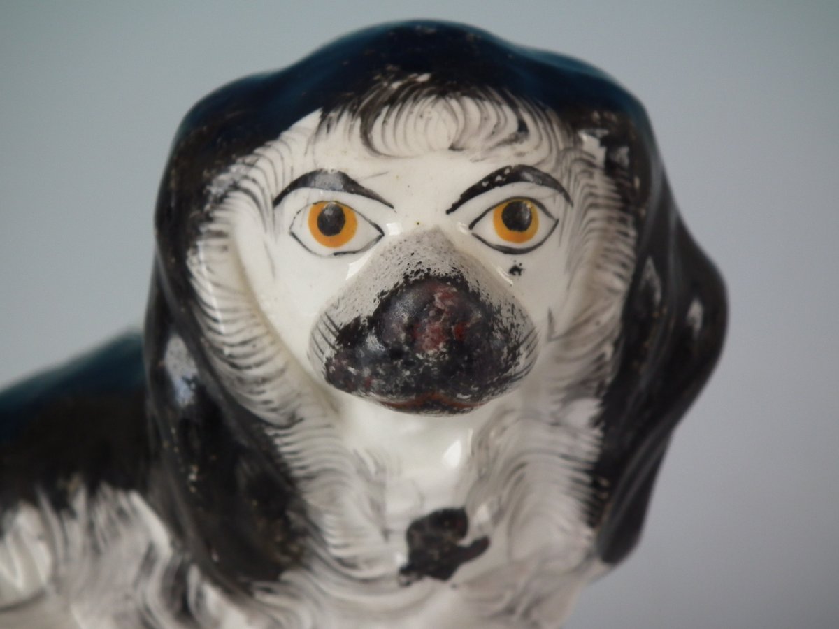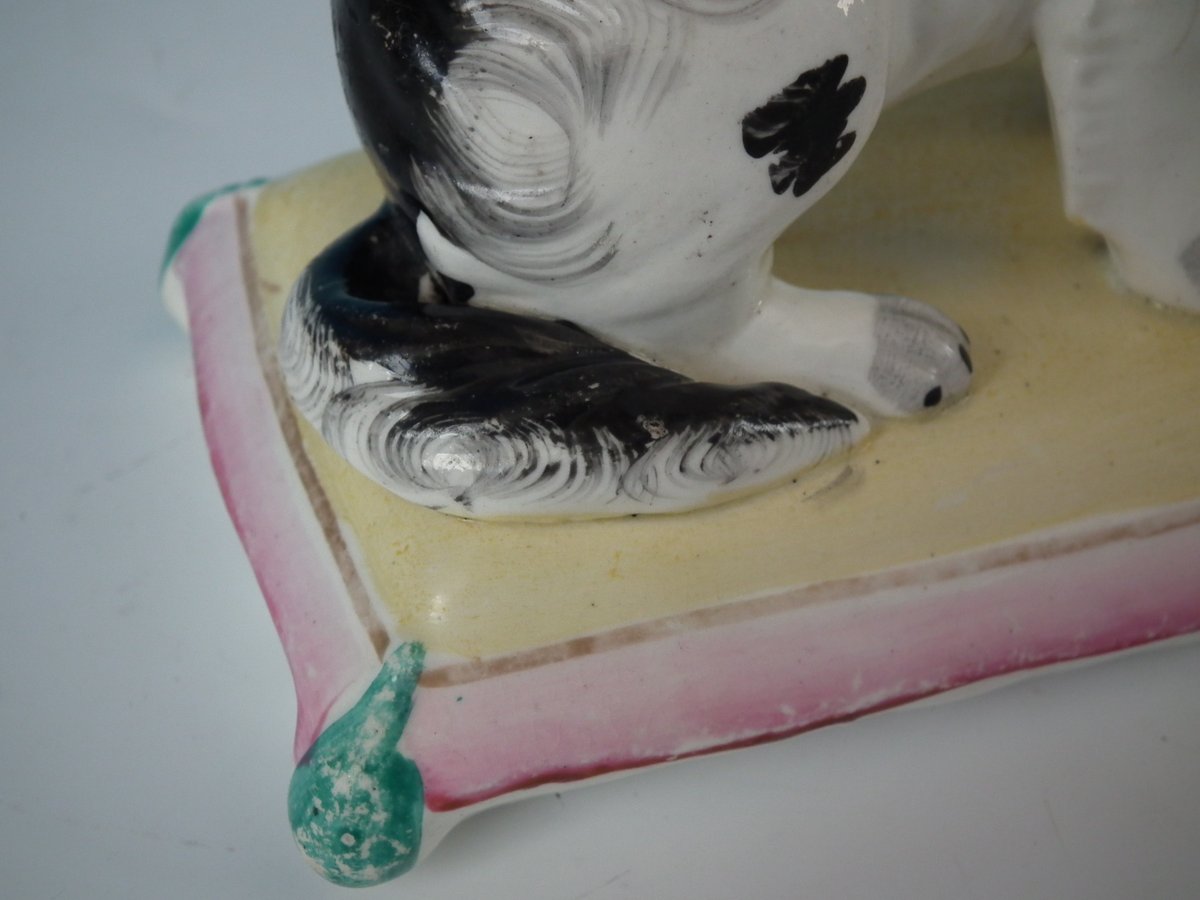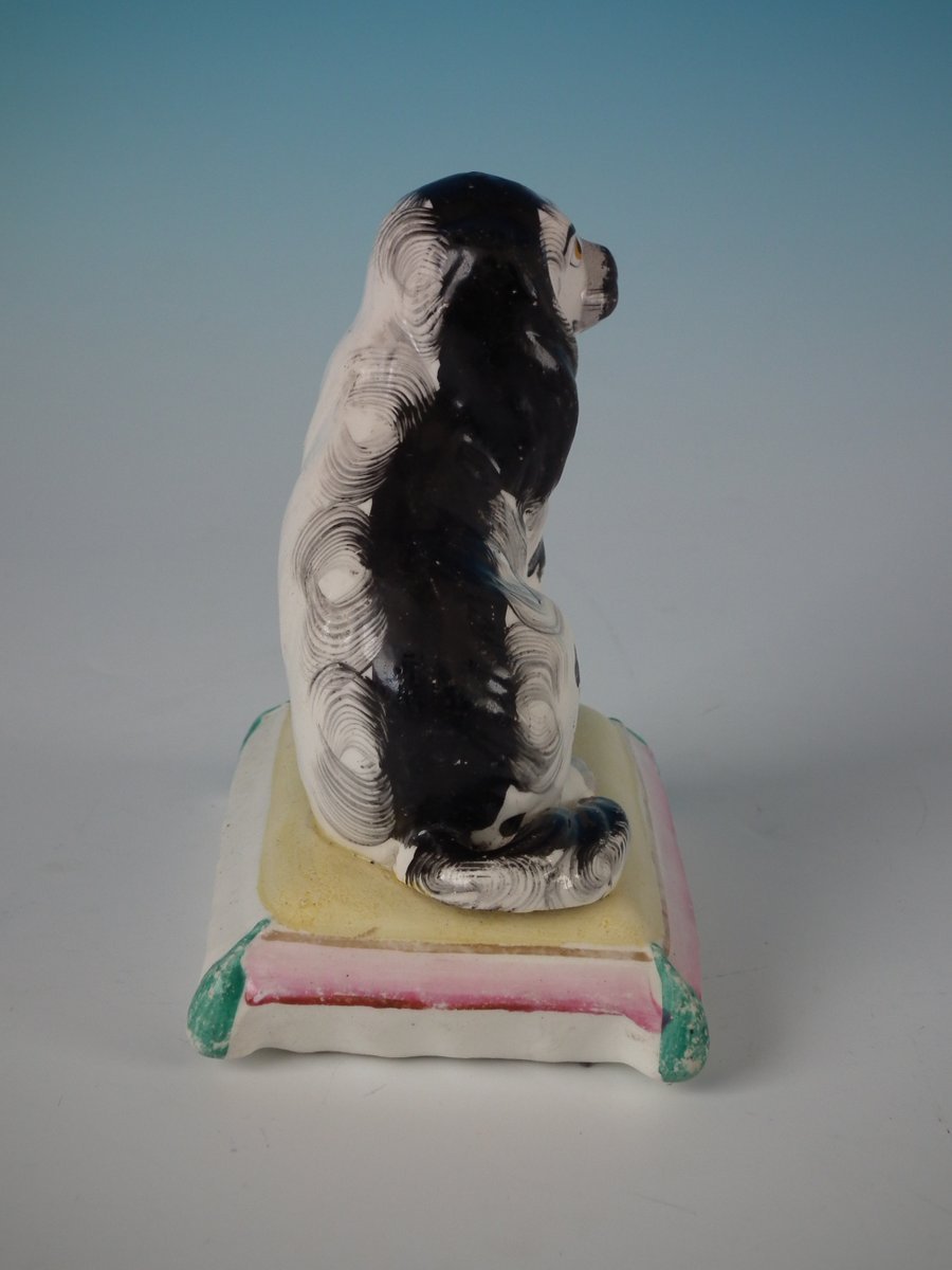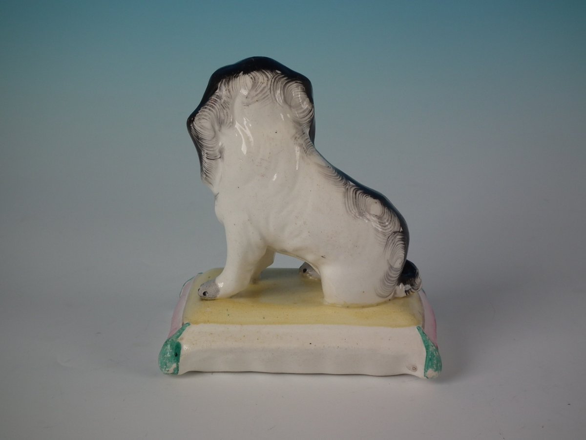 Victorian, circa 1860. 5.1ins high, 4.5ins wide, 3.1ins depth. Staffordshire Pottery figure which features a spaniel,