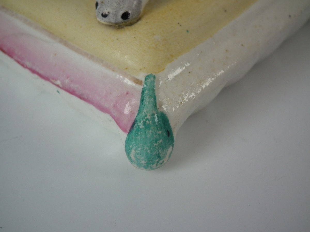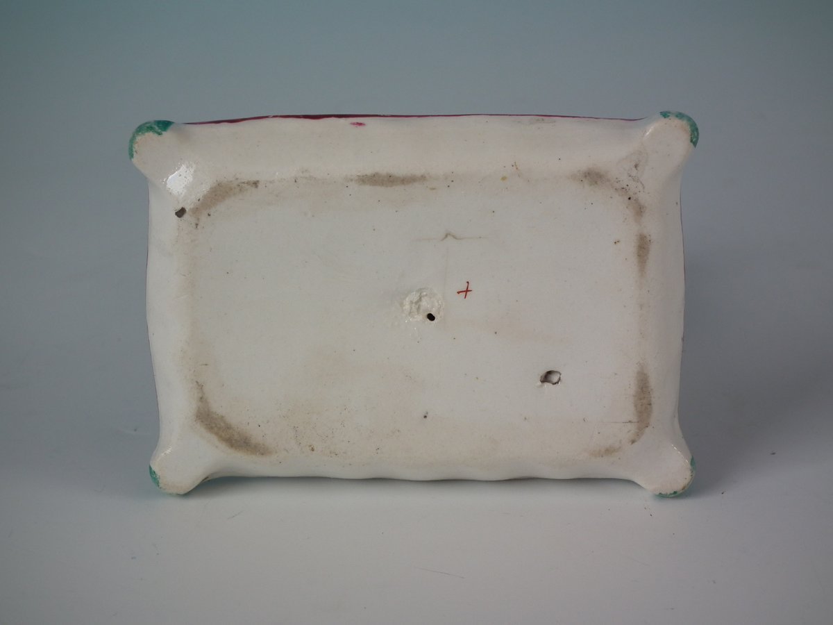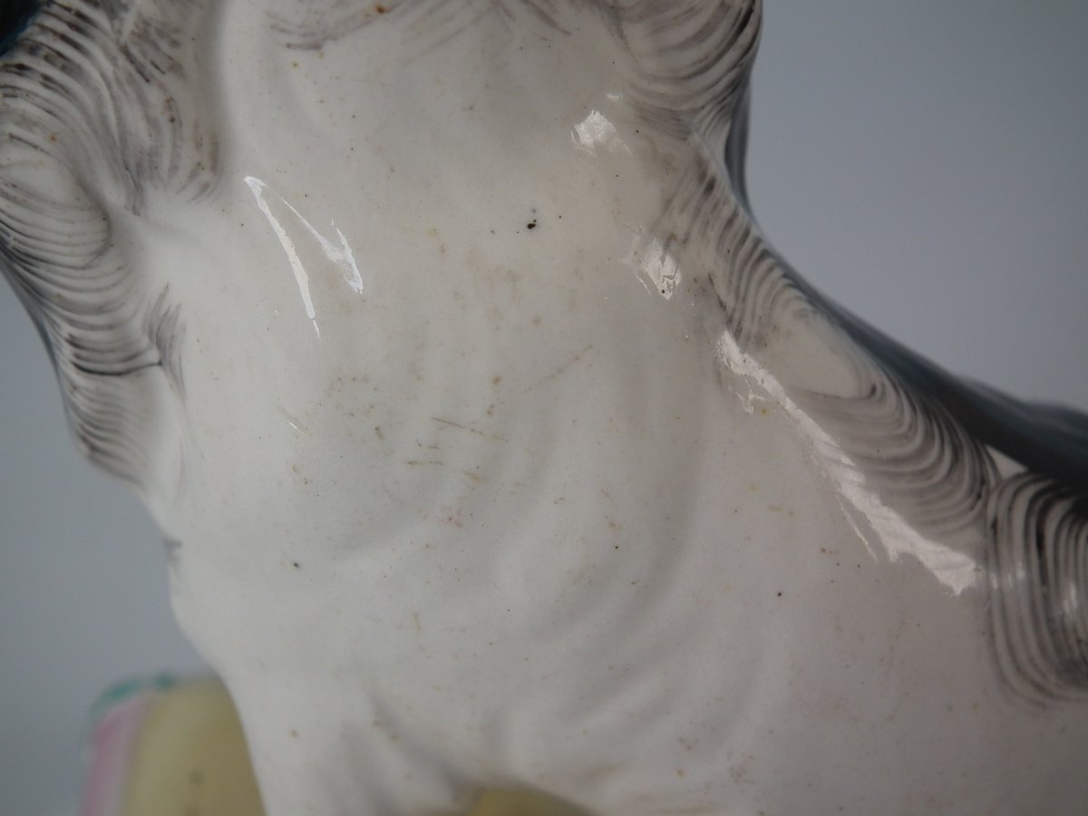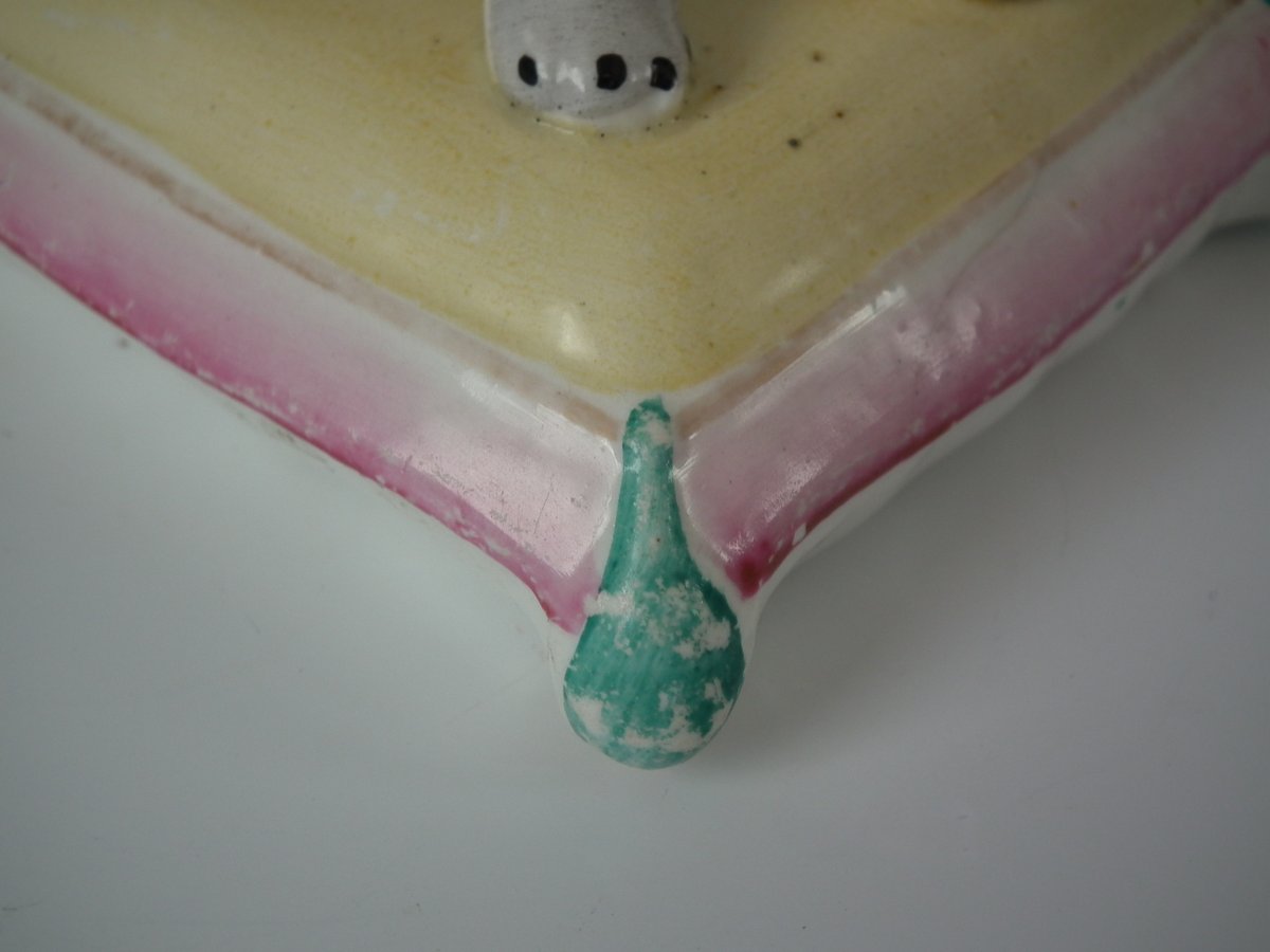 Victorian, circa 1860. 5.1ins high, 4.5ins wide, 3.1ins depth. Staffordshire Pottery figure which features a spaniel,