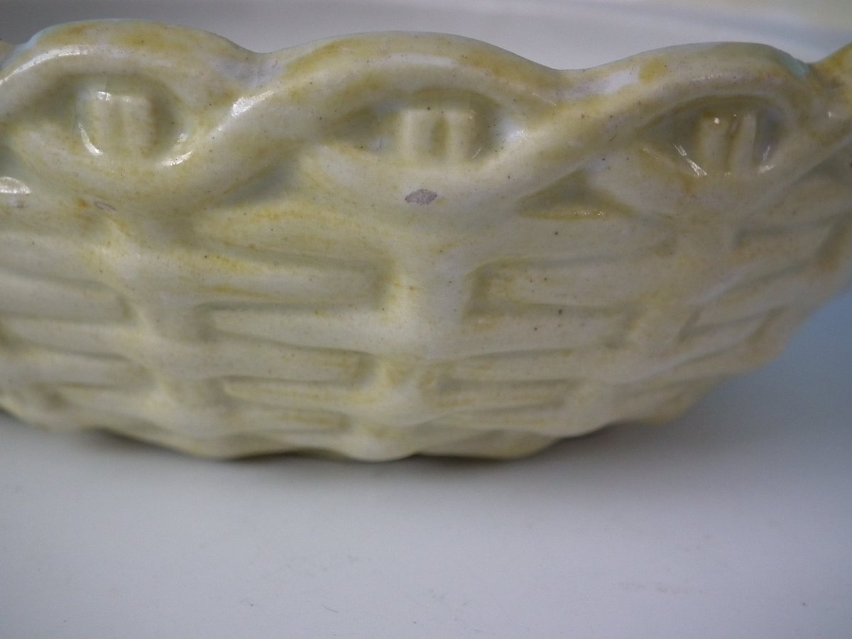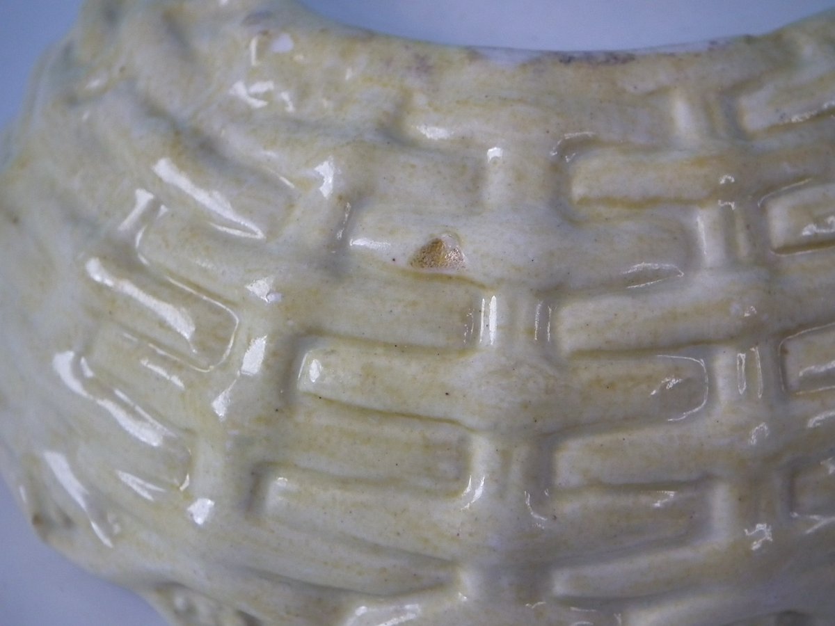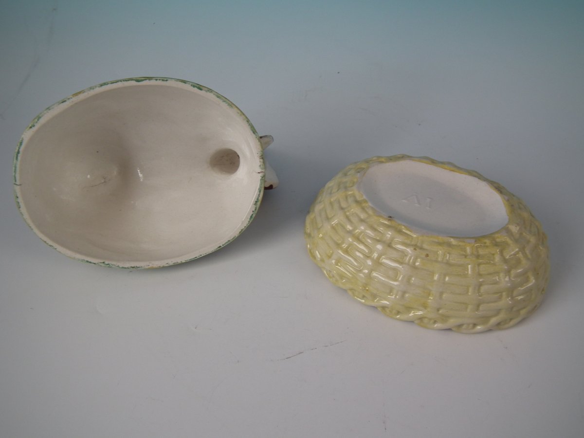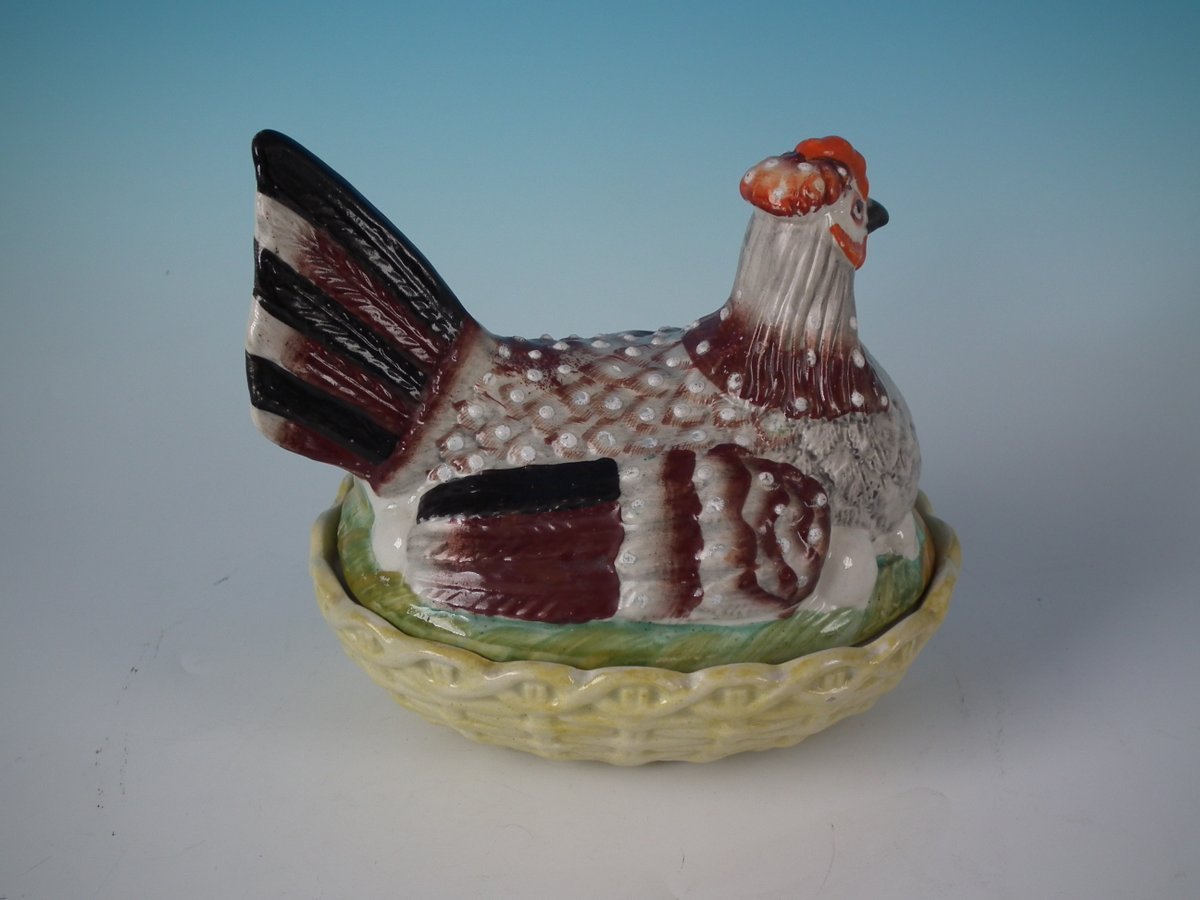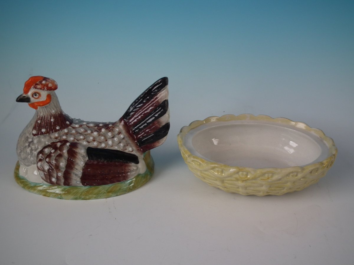 Victorian, circa 1860. 6.1ins high, 6.9ins wide, 5.1ins depth. Staffordshire Pottery tureen with cover which features a hen, seated on a basket base.