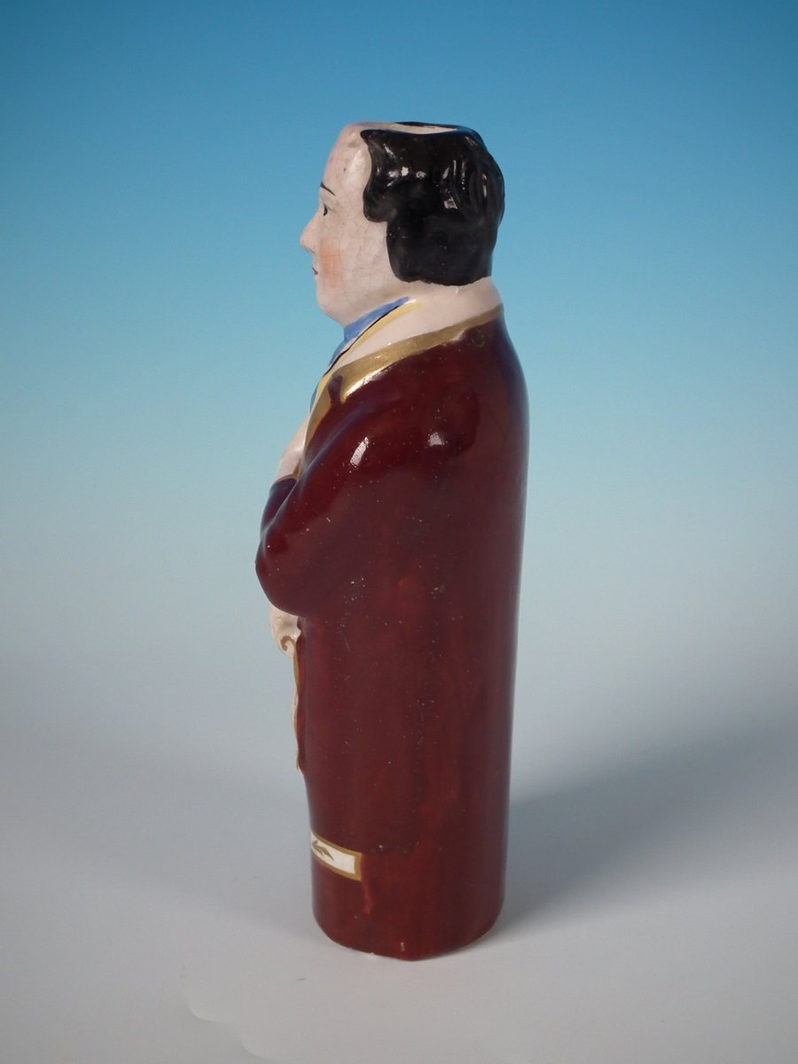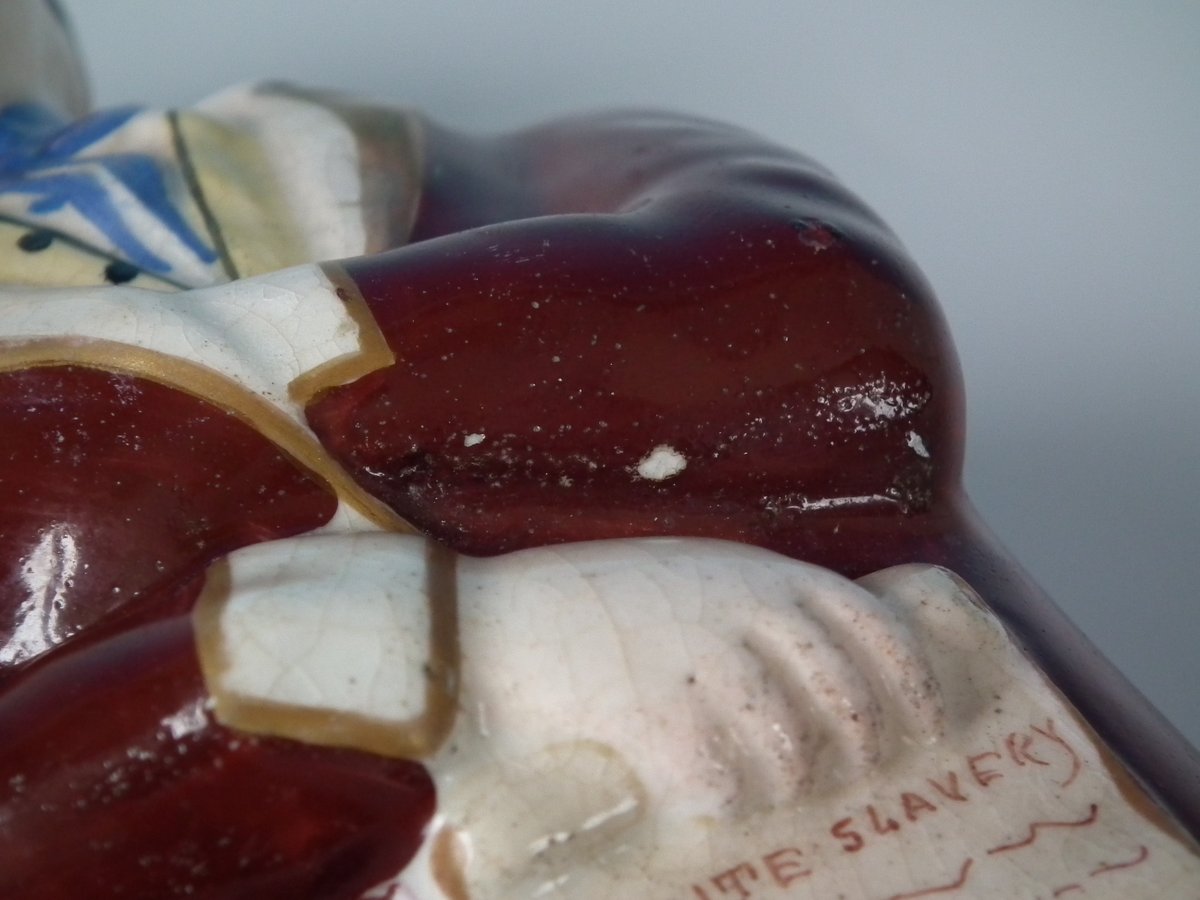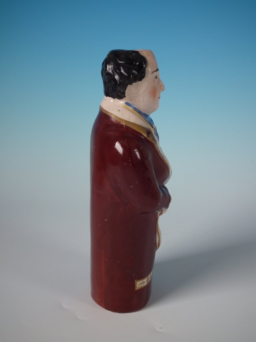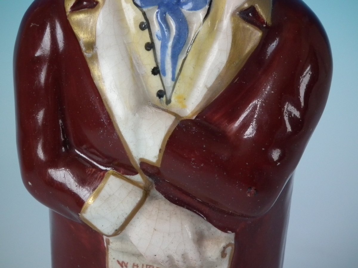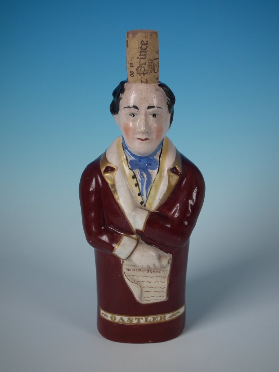Victorian, circa 1860. 8.3ins high, 3.5ins wide, 2.6ins depth. Staffordshire Pottery bottle/flask with a political theme which features a man holding a scroll entitled, 'WHITE SLAVERY', stood directly on the ground, no base.