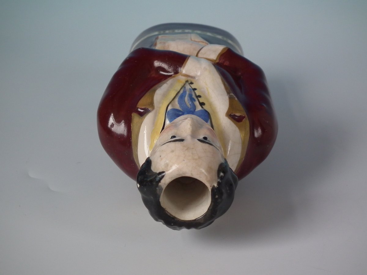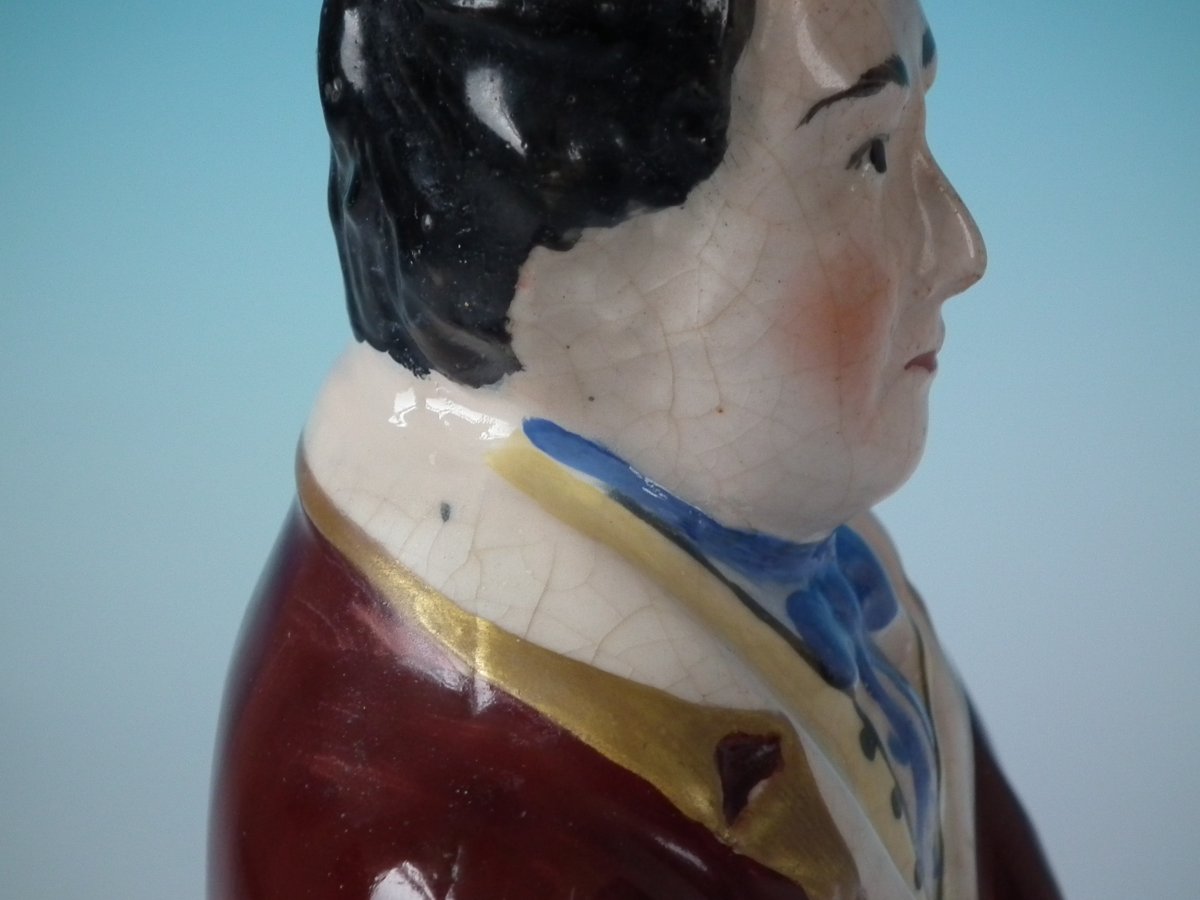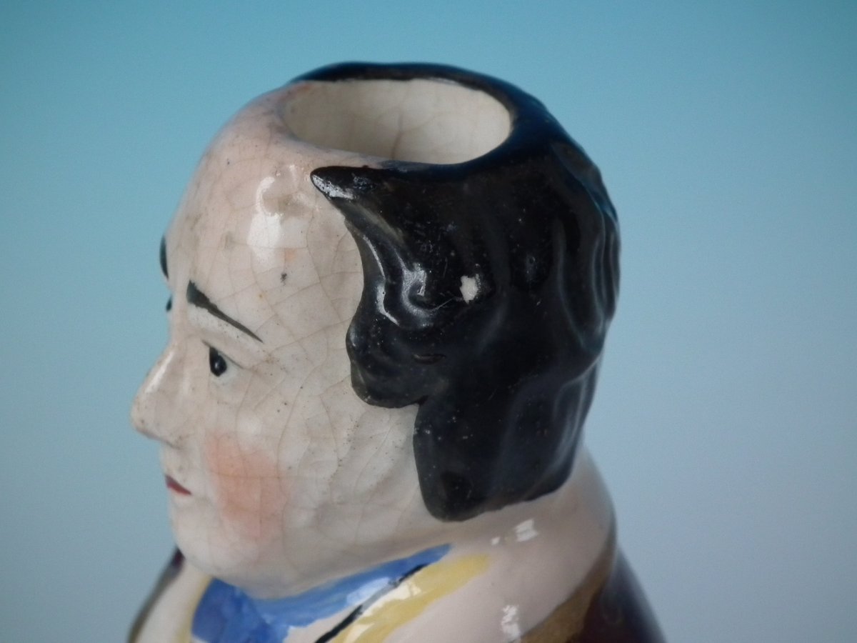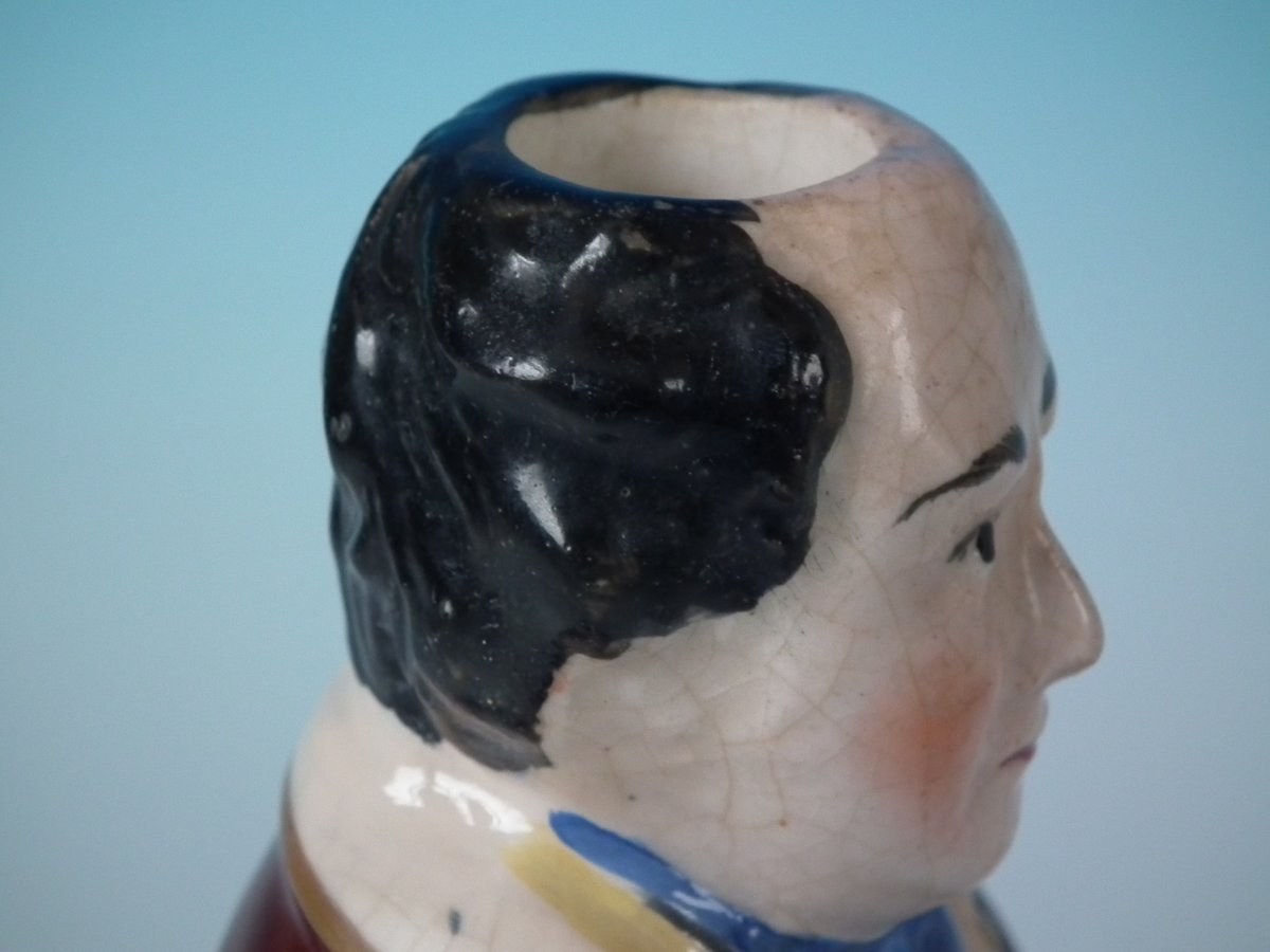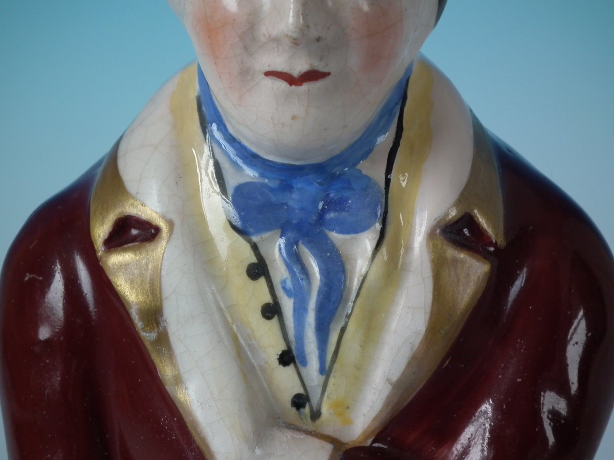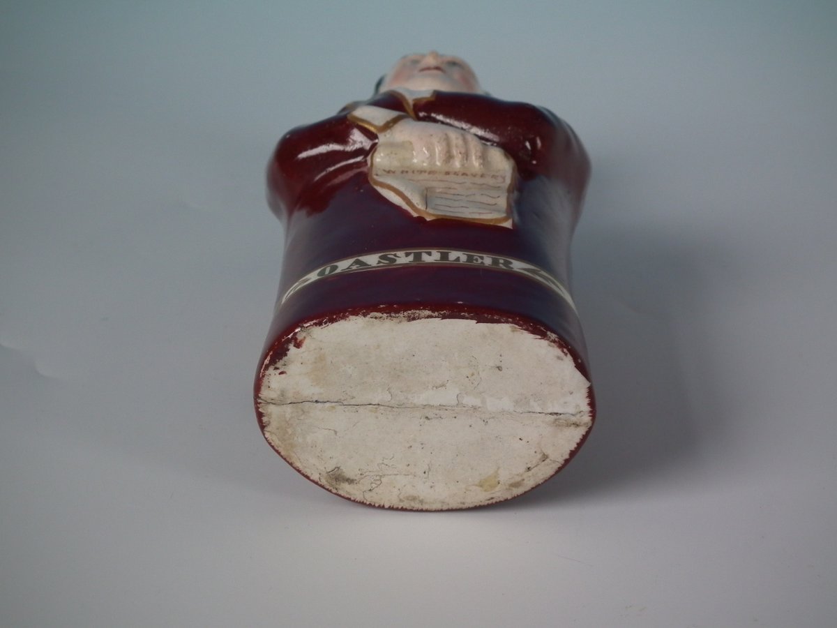 Victorian, circa 1860. 8.3ins high, 3.5ins wide, 2.6ins depth. Staffordshire Pottery bottle/flask with a political theme which features a man holding a scroll entitled, 'WHITE SLAVERY', stood directly on the ground, no base.