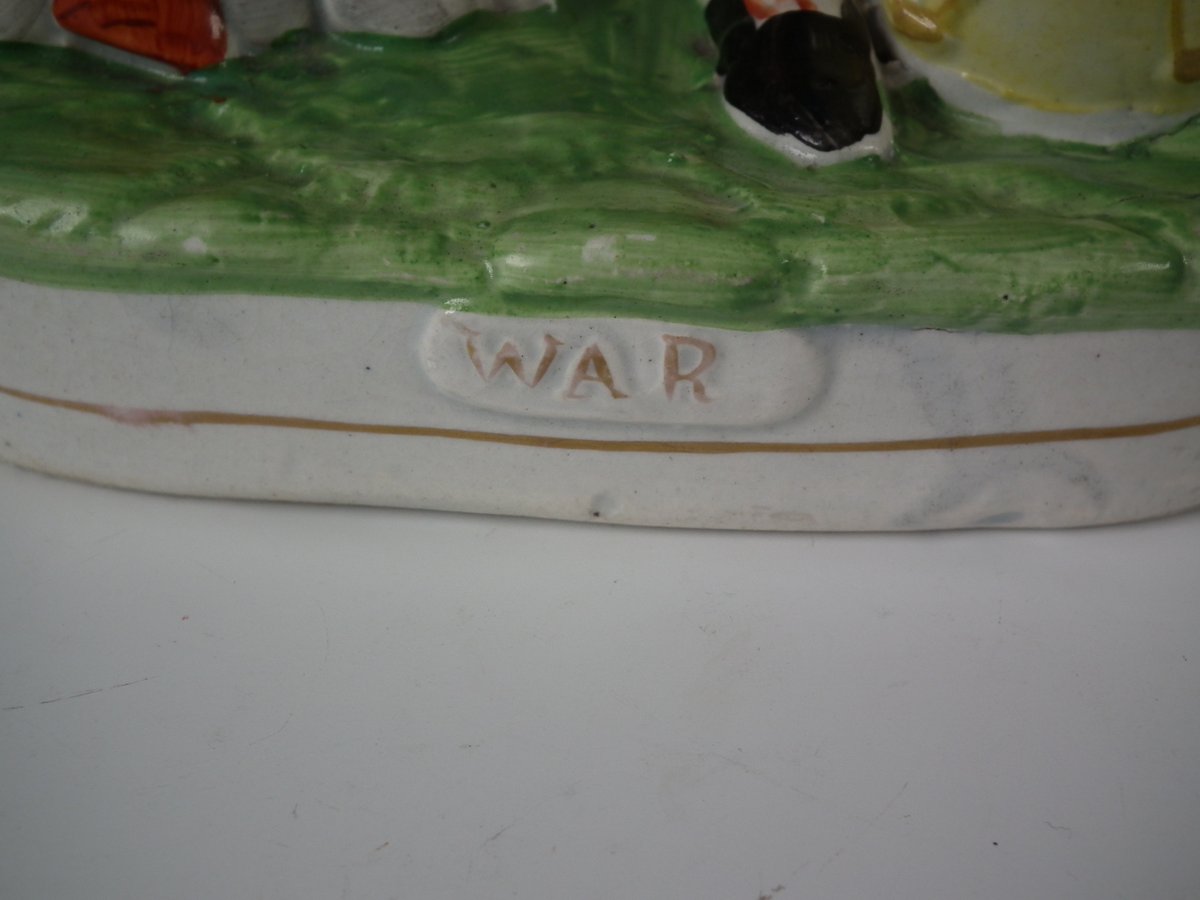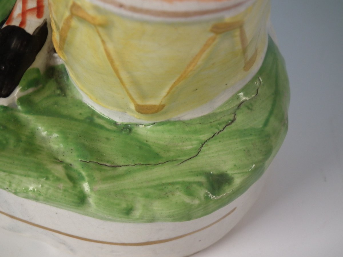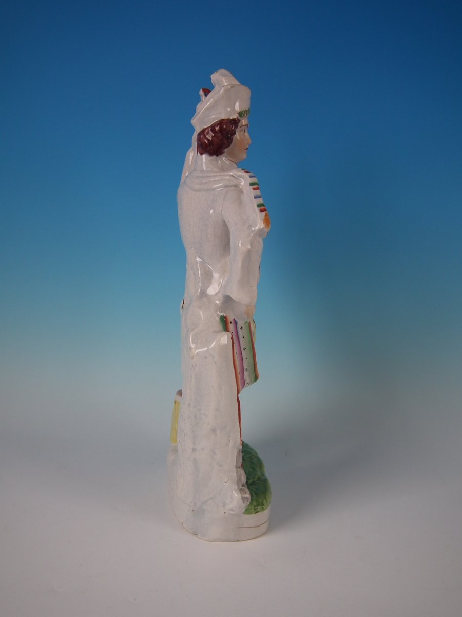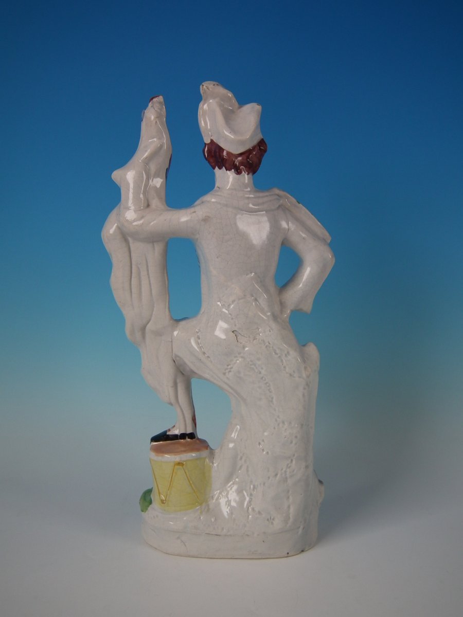 Victorian, circa 1860. 15.7ins high, 7.1ins wide, 3.5ins depth. Staffordshire Pottery figure with a military theme which features a soldier with a gun, a drum and a flag, stood on a shaped base.