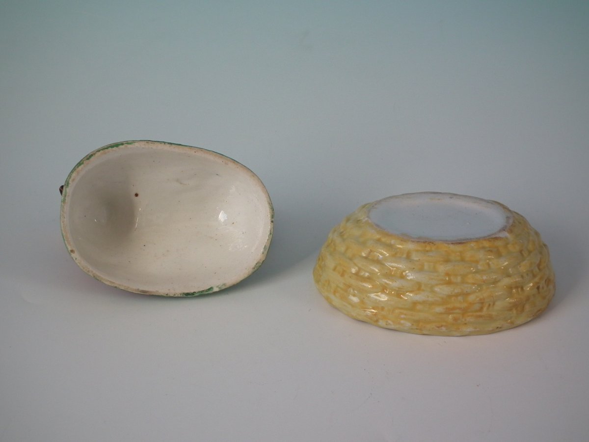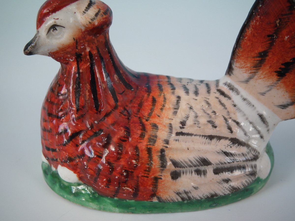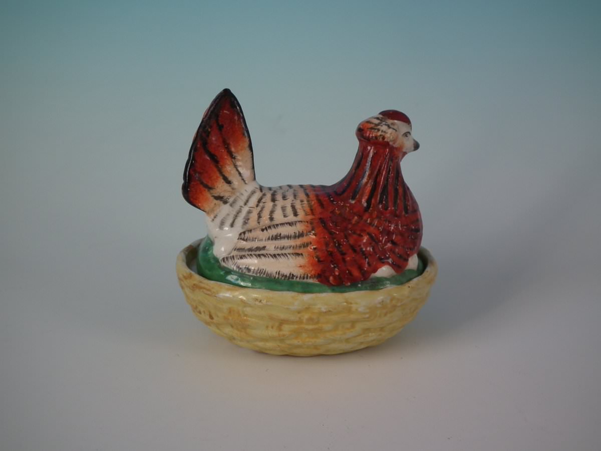 Victorian, circa 1860. 3.5ins high, 3.7ins wide, 3ins depth. Staffordshire Pottery tureen with cover which features a hen, seated on an oval basketweave tureen base.