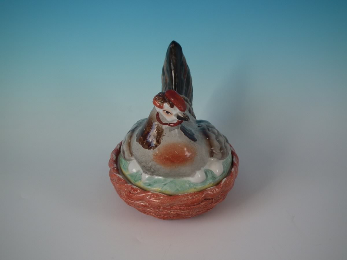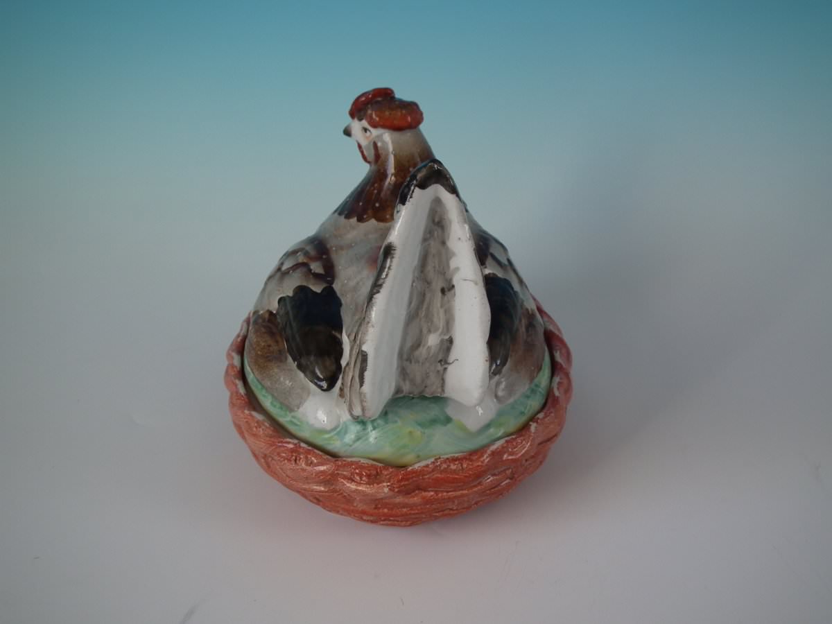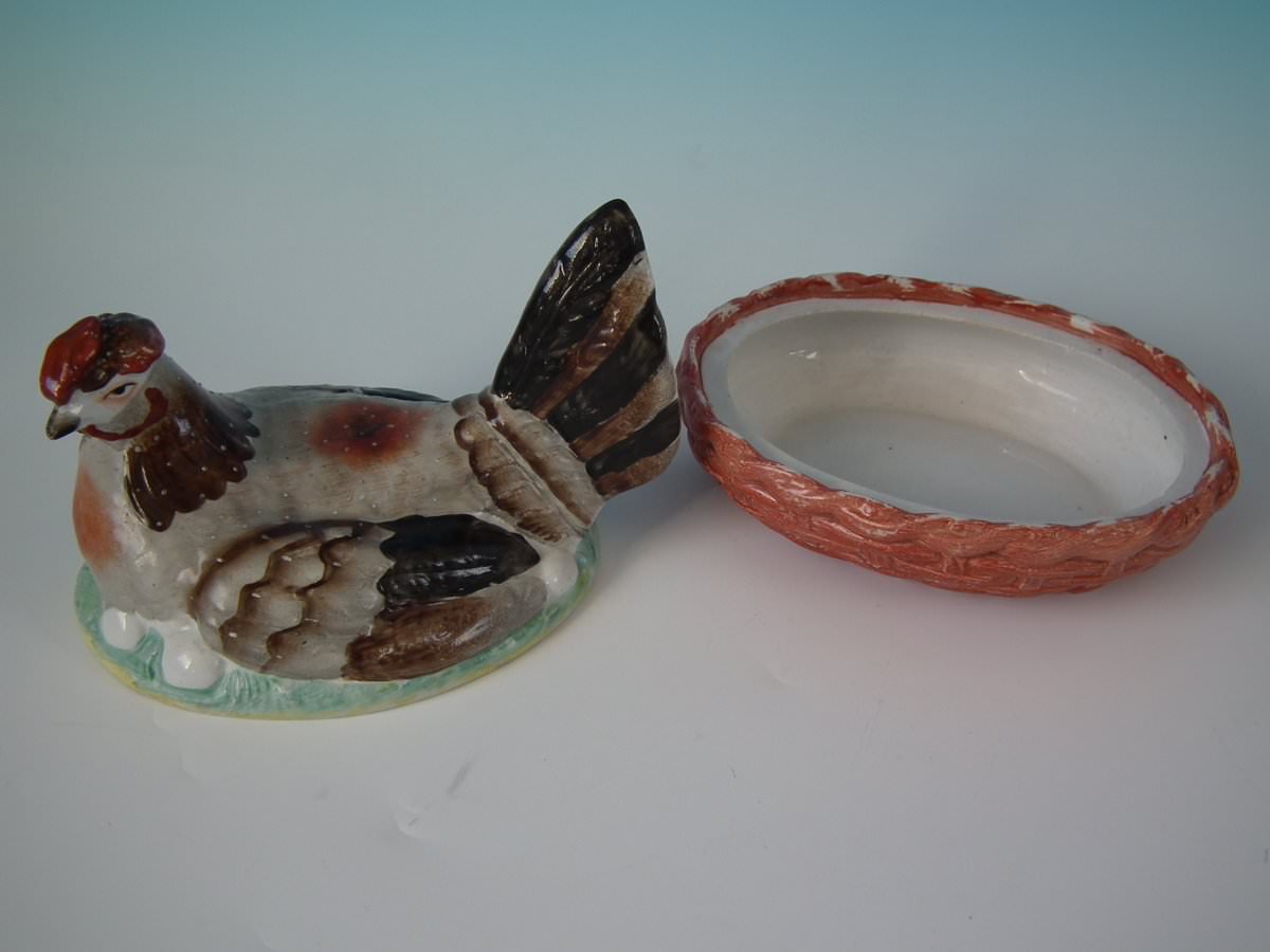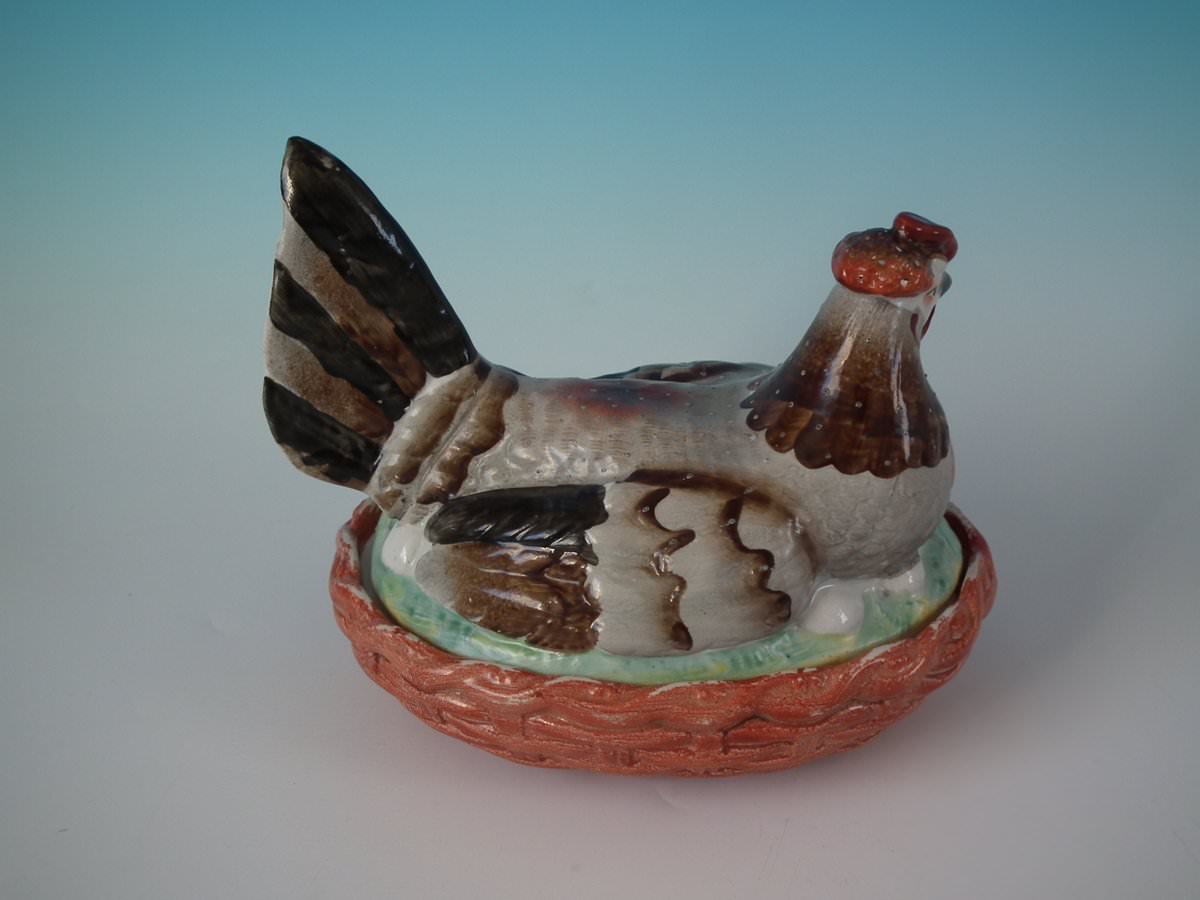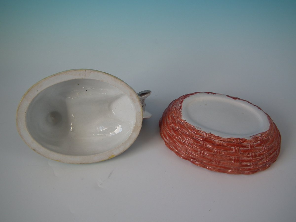 Victorian, circa 1860. 6.1ins high, 7.5ins wide, 5.7ins depth. Staffordshire Pottery egg tureen and cover which features a hen sitting with her eggs, resting on a basketweave oval base.