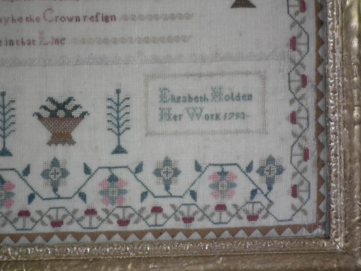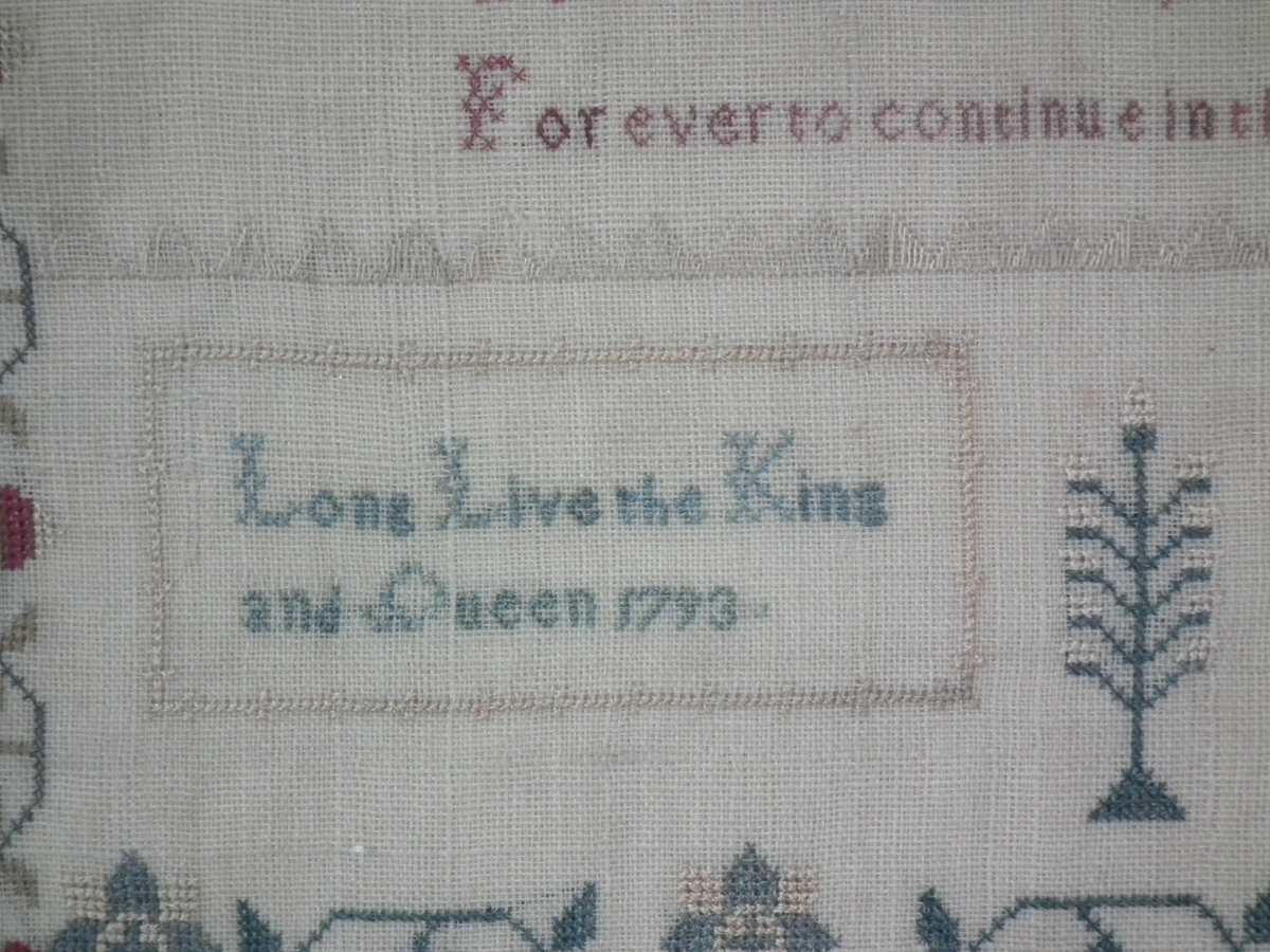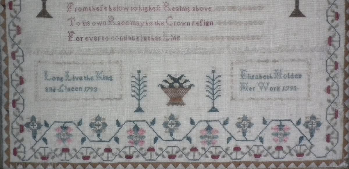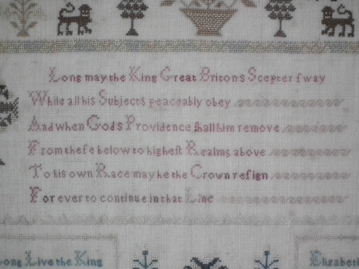 George III, dated 1793. 13ins high by 12.75ins wide. 1793 'Long Live the King and Queen' Commemorative Sampler by Elizabeth Holden.
