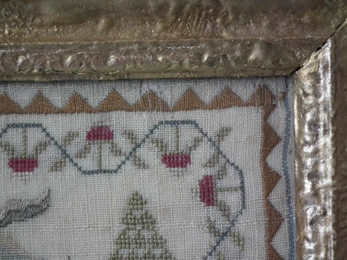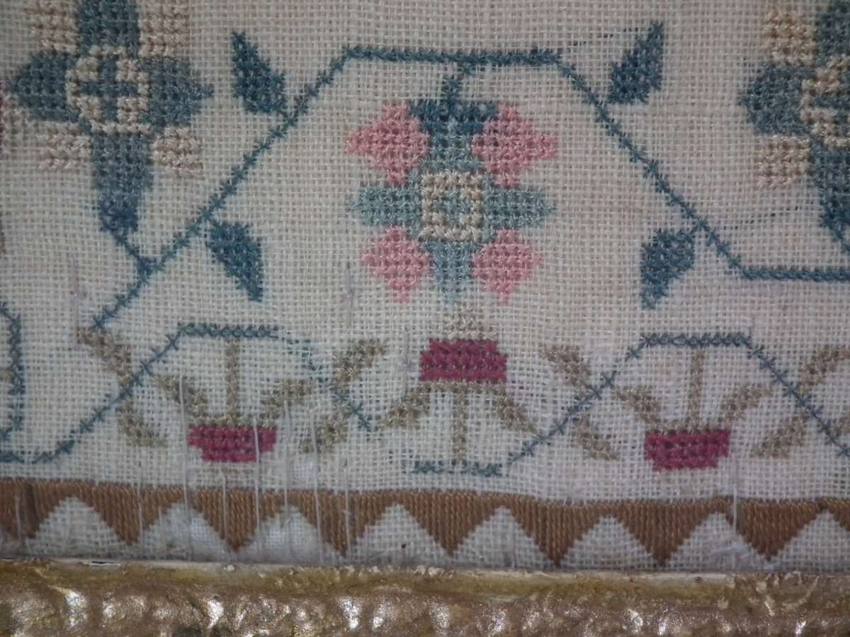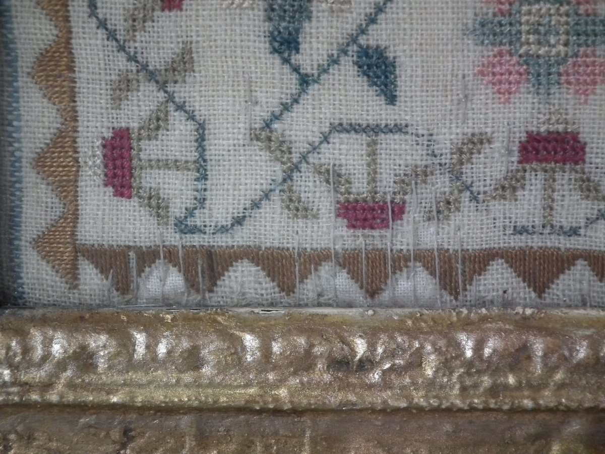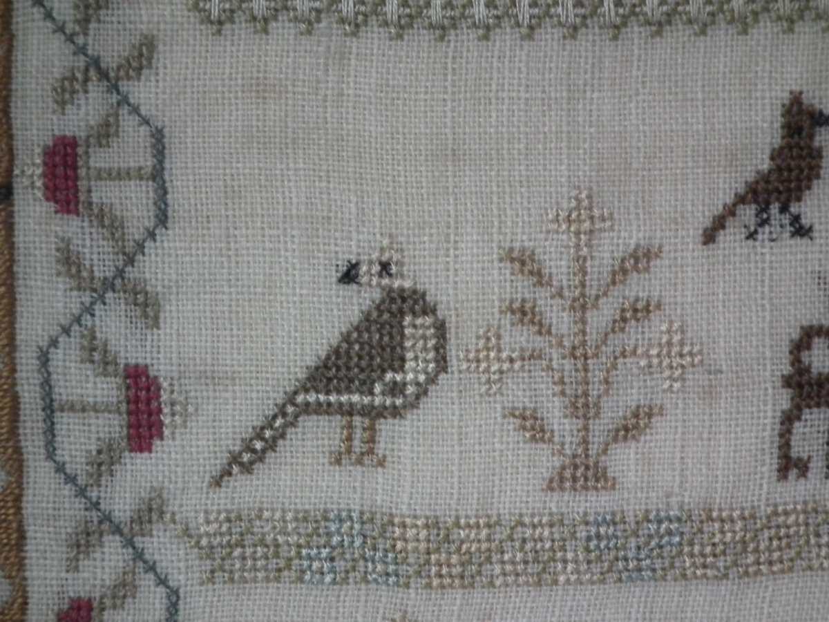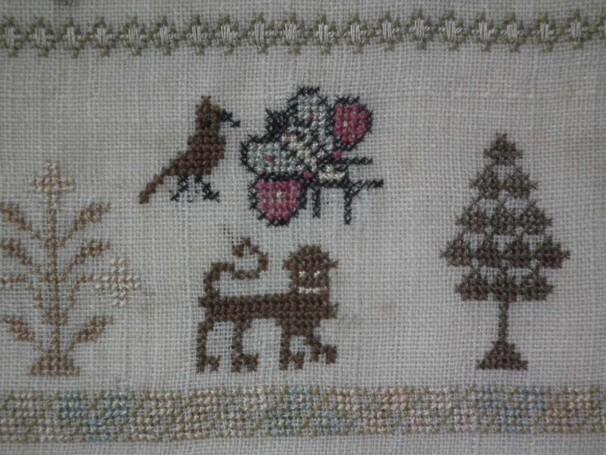 The sampler is worked in silk on a linen ground, in a variety of stitches.
