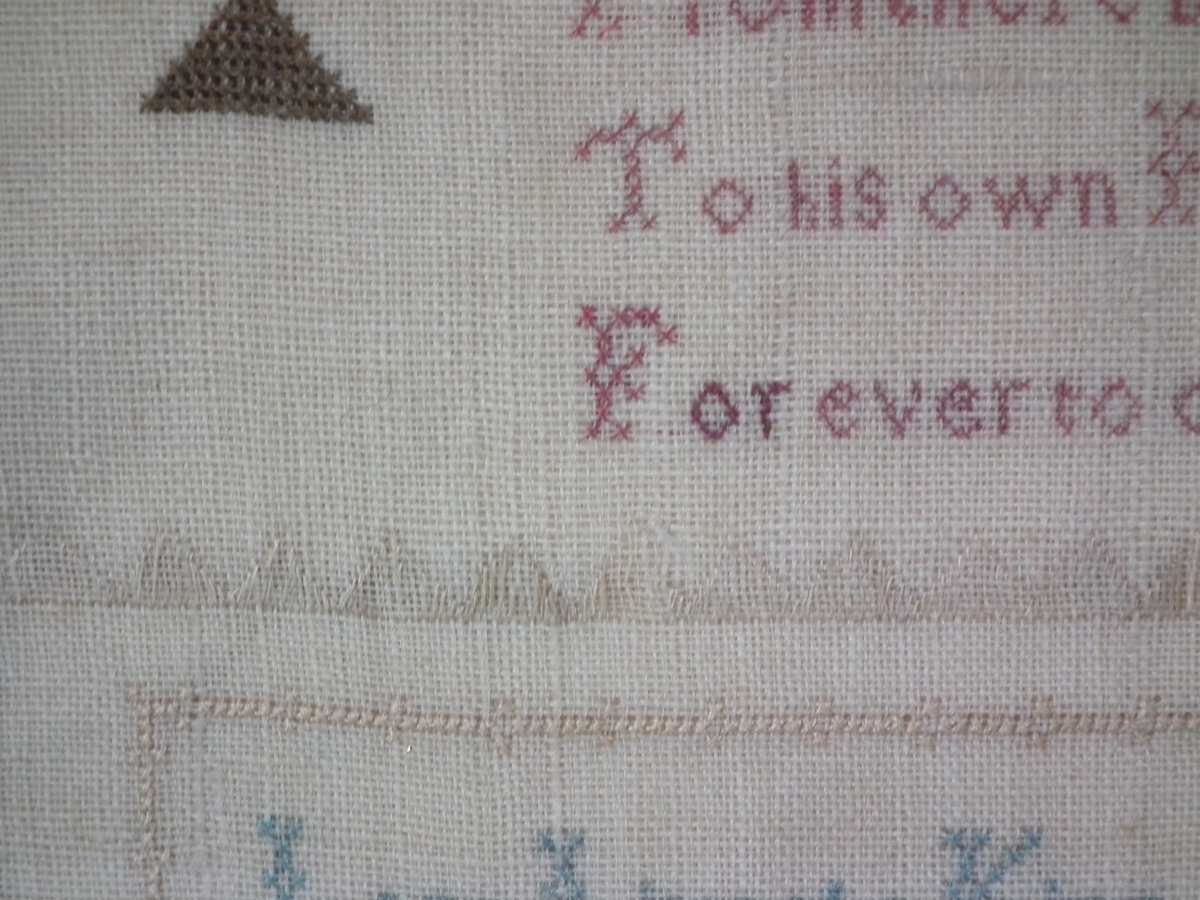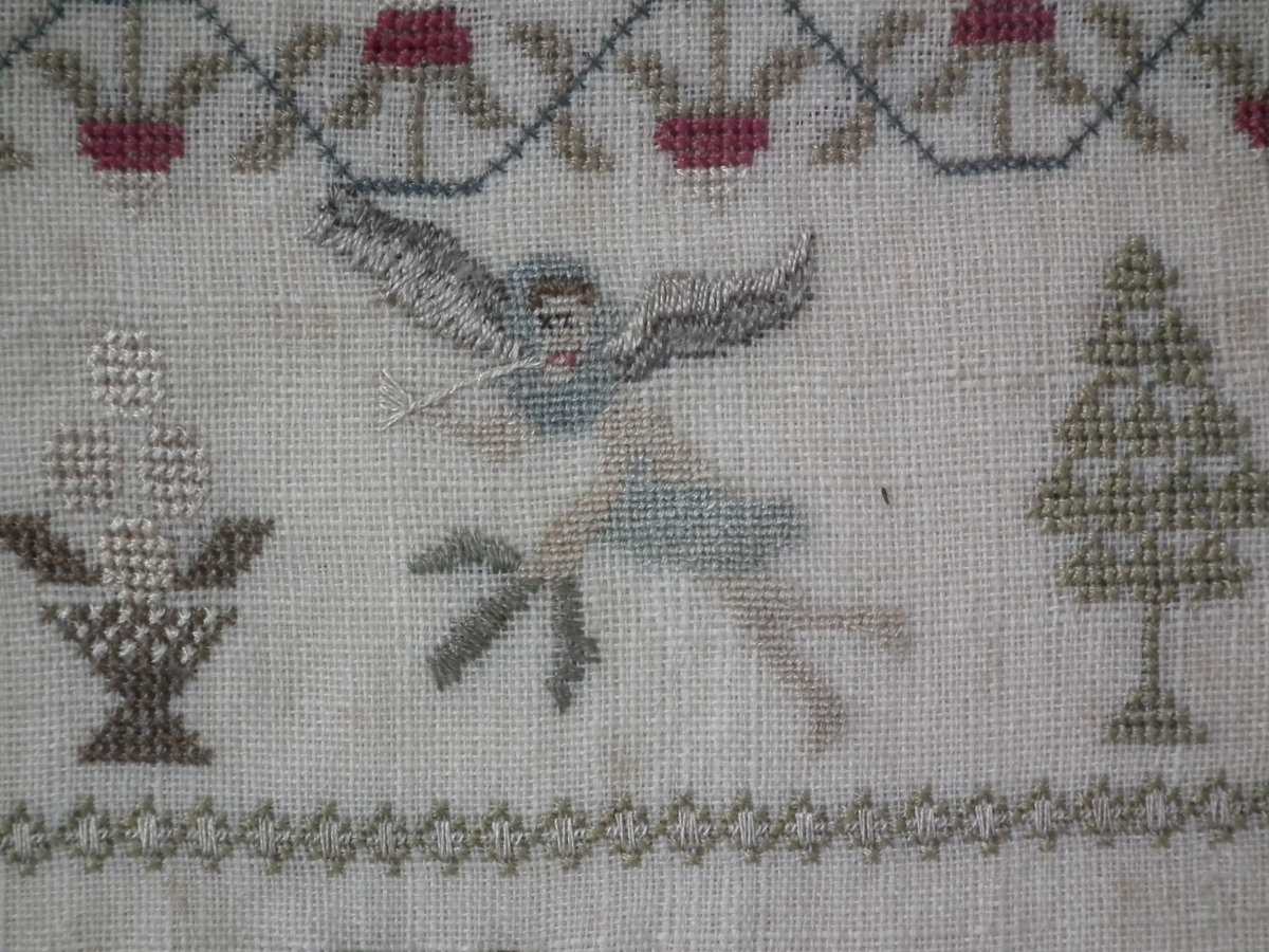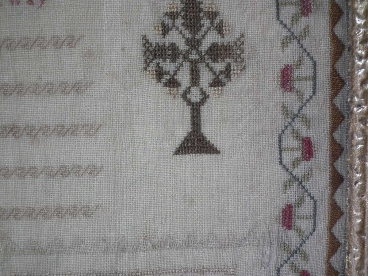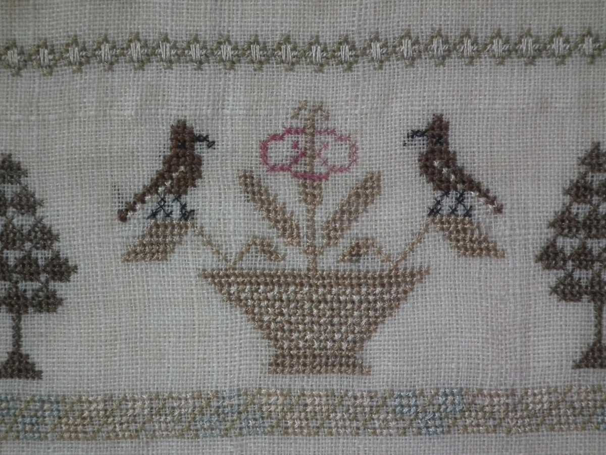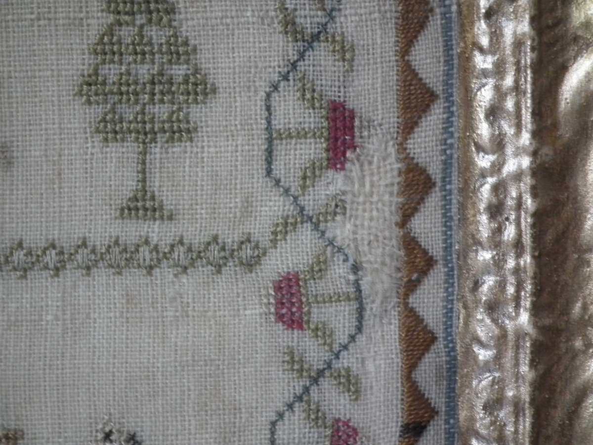 The sampler is worked in silk on a linen ground, in a variety of stitches.
