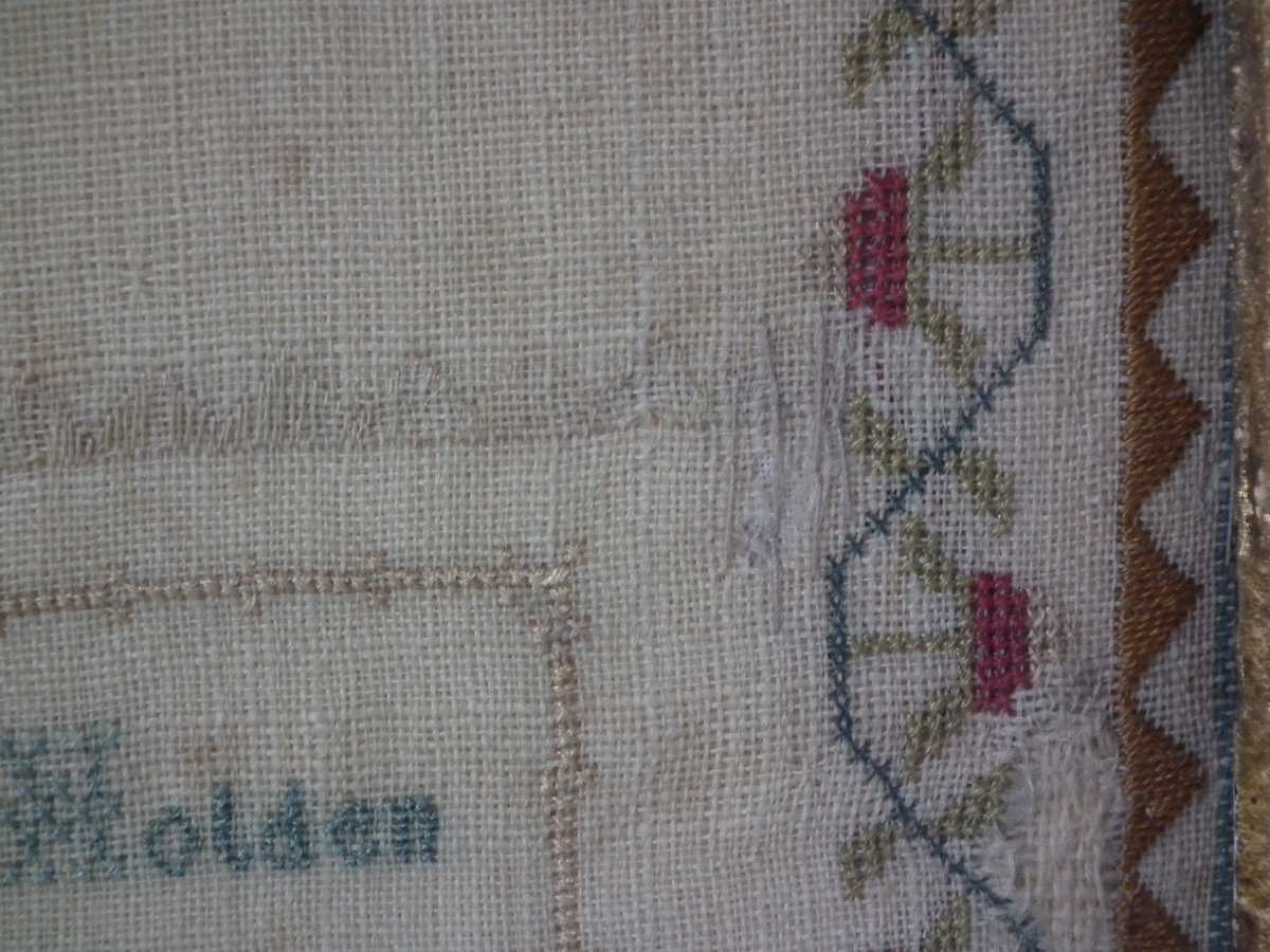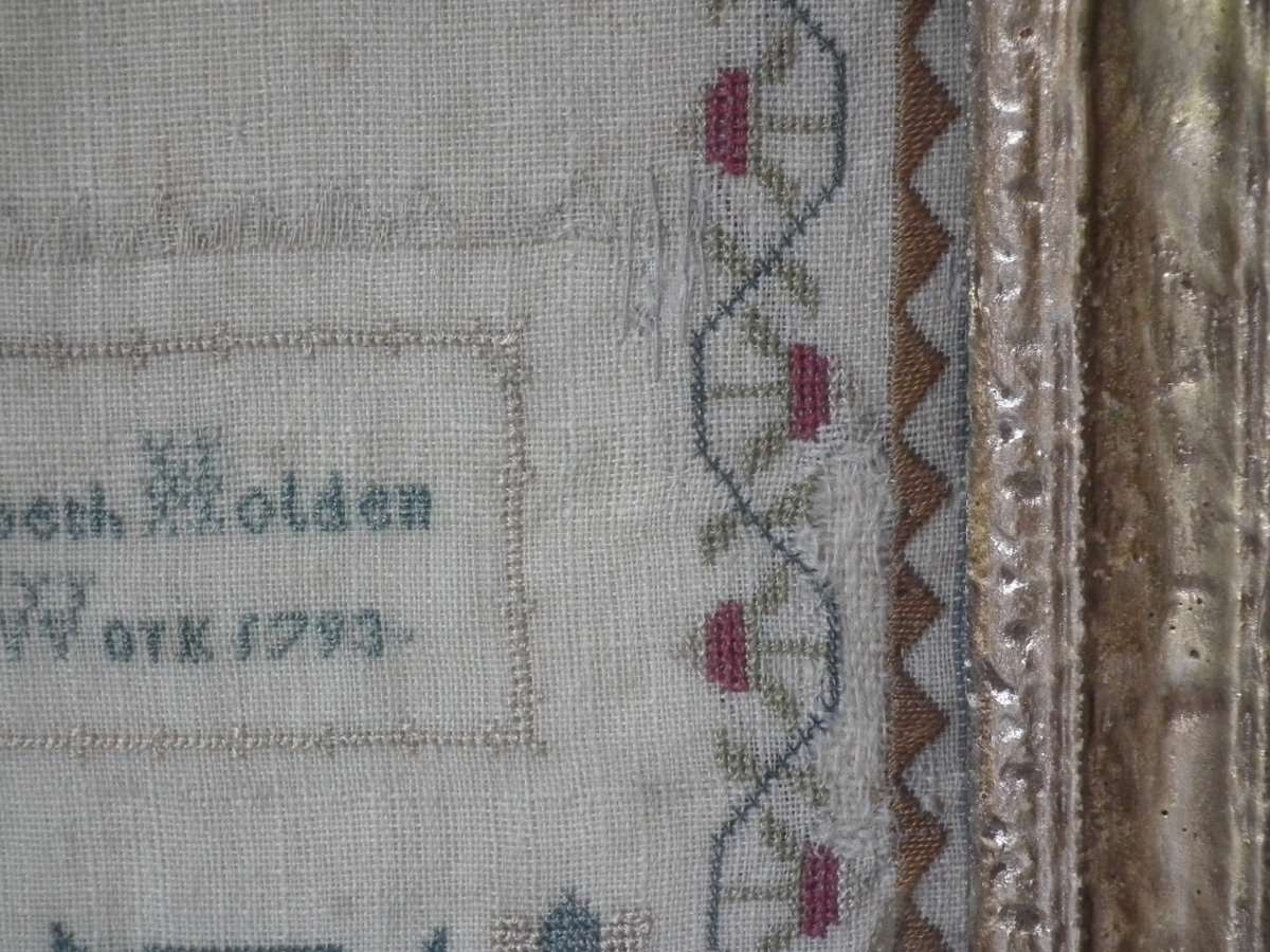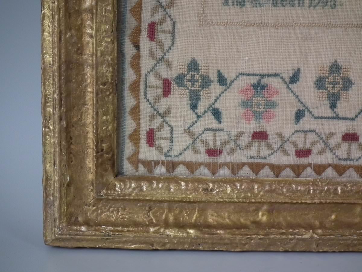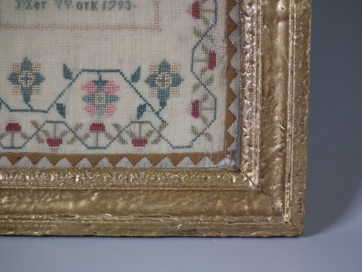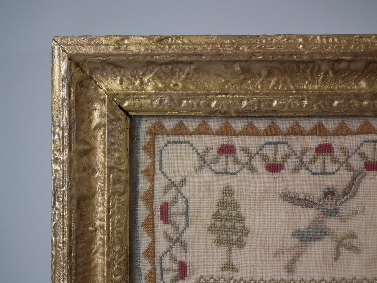 The sampler is worked in silk on a linen ground, in a variety of stitches.