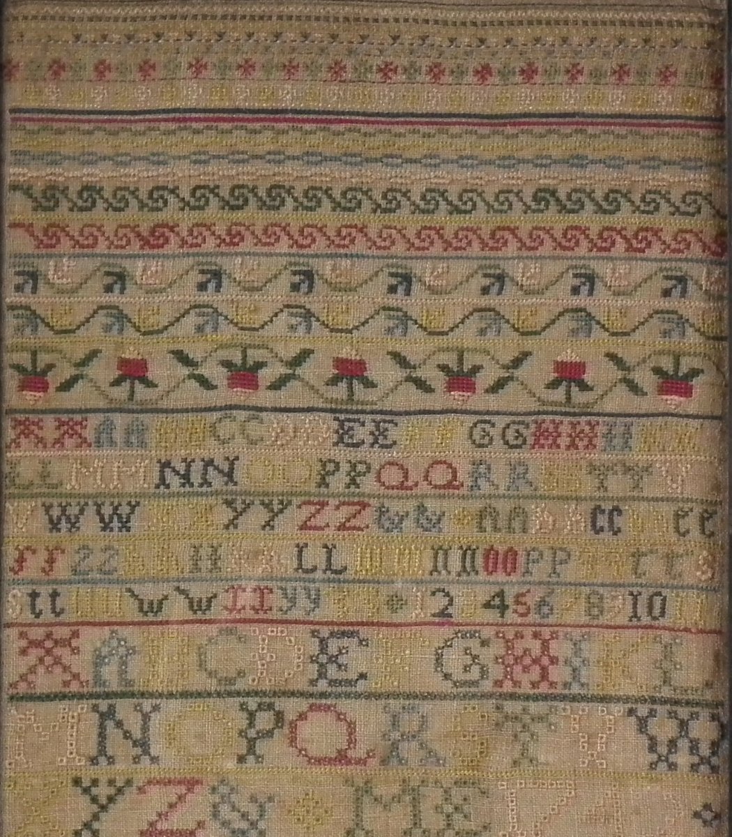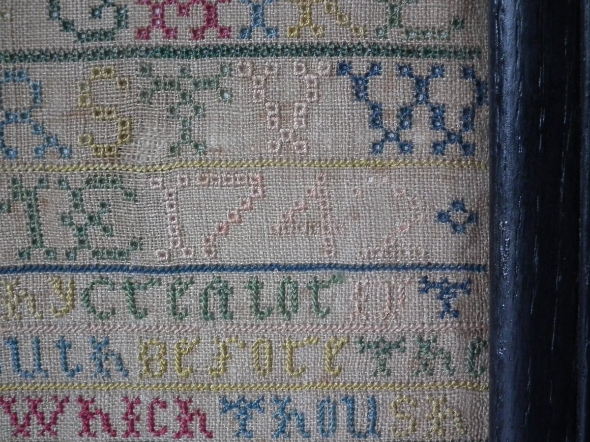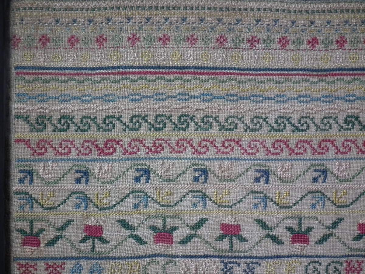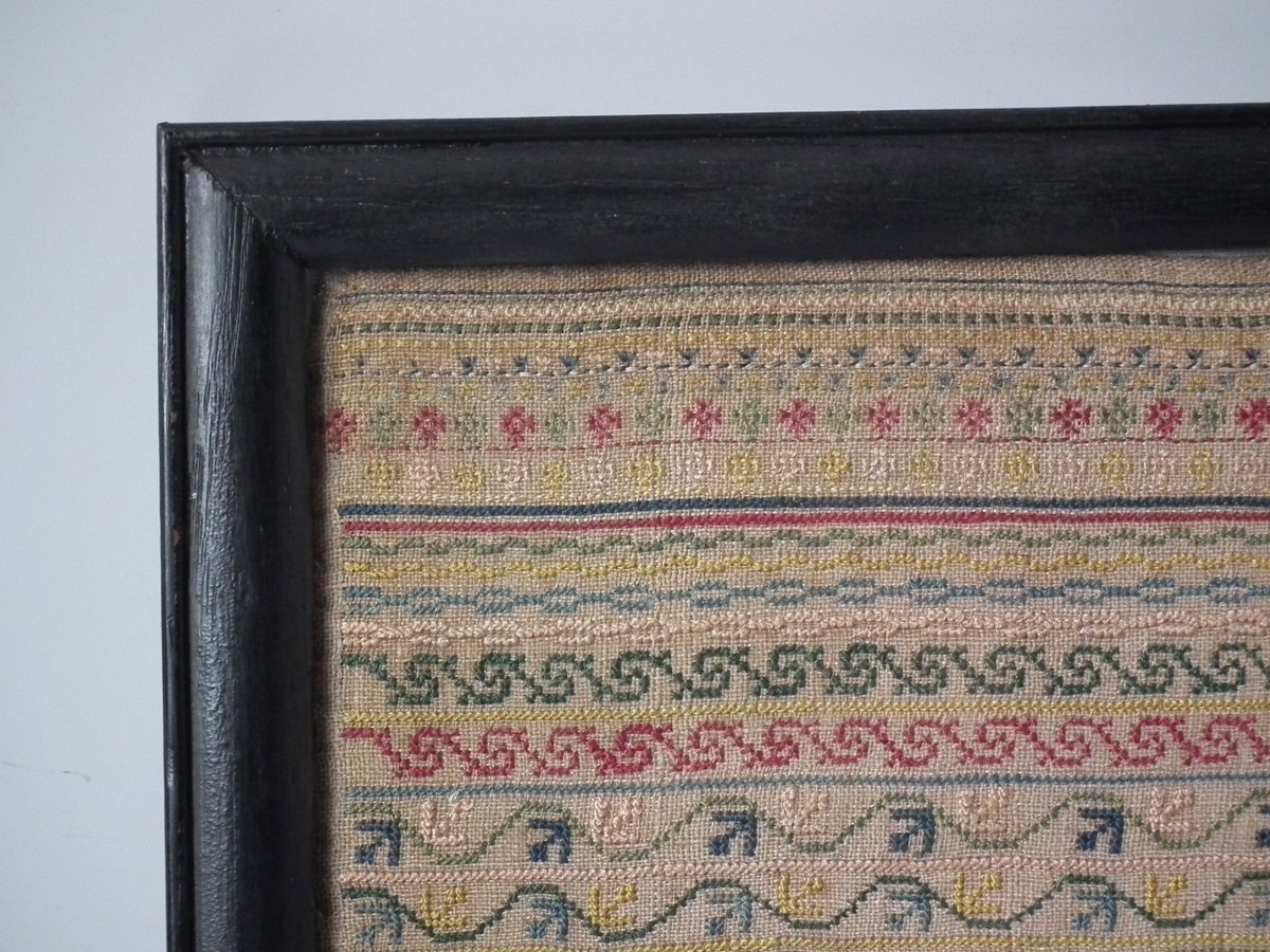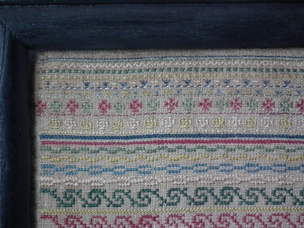 The sampler is worked in silk on linen ground, in cross stitch and Algerian eye.