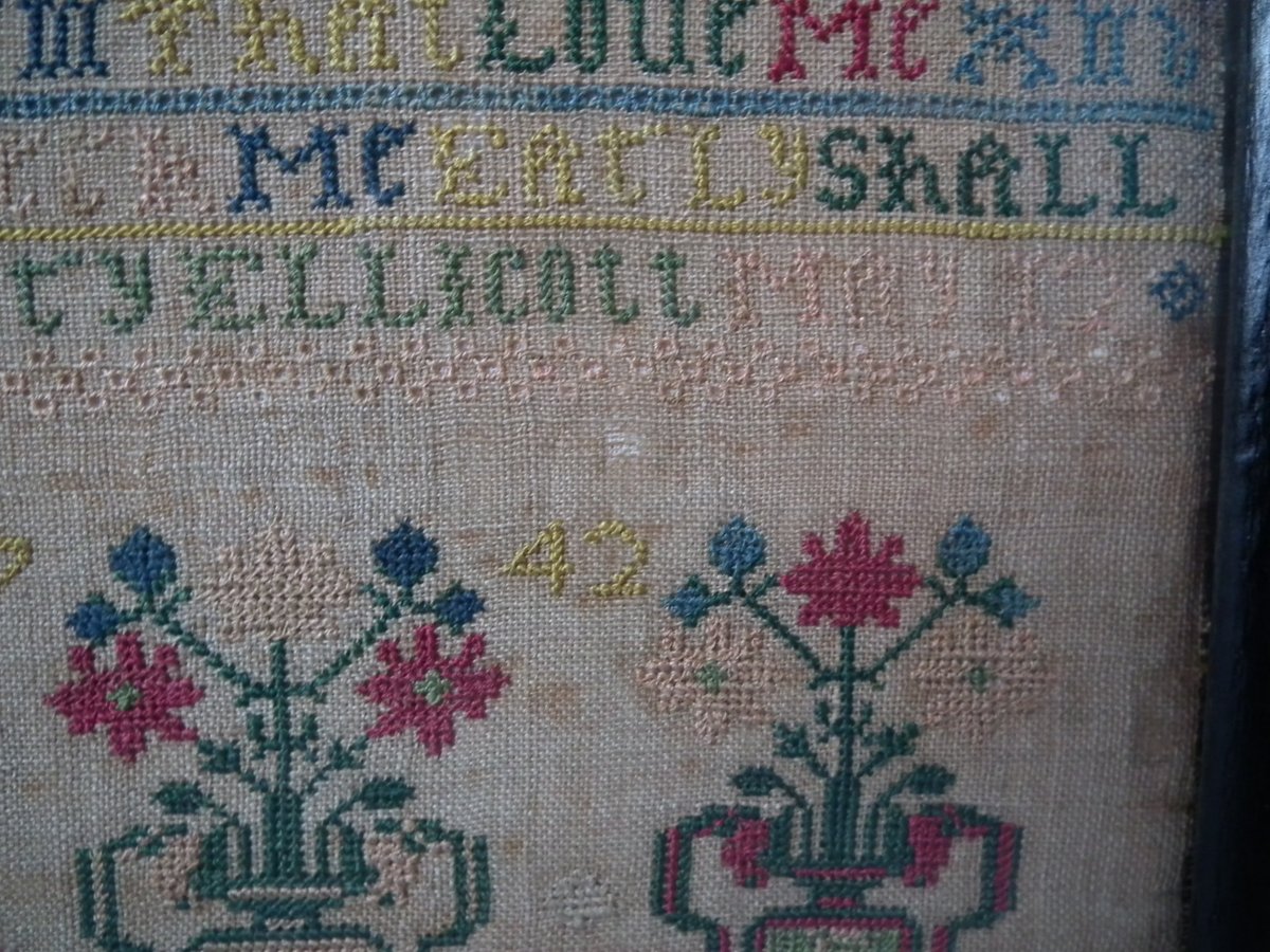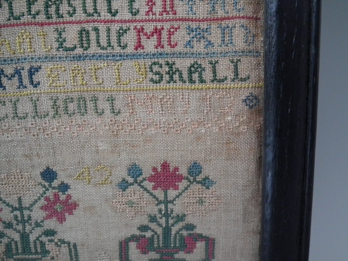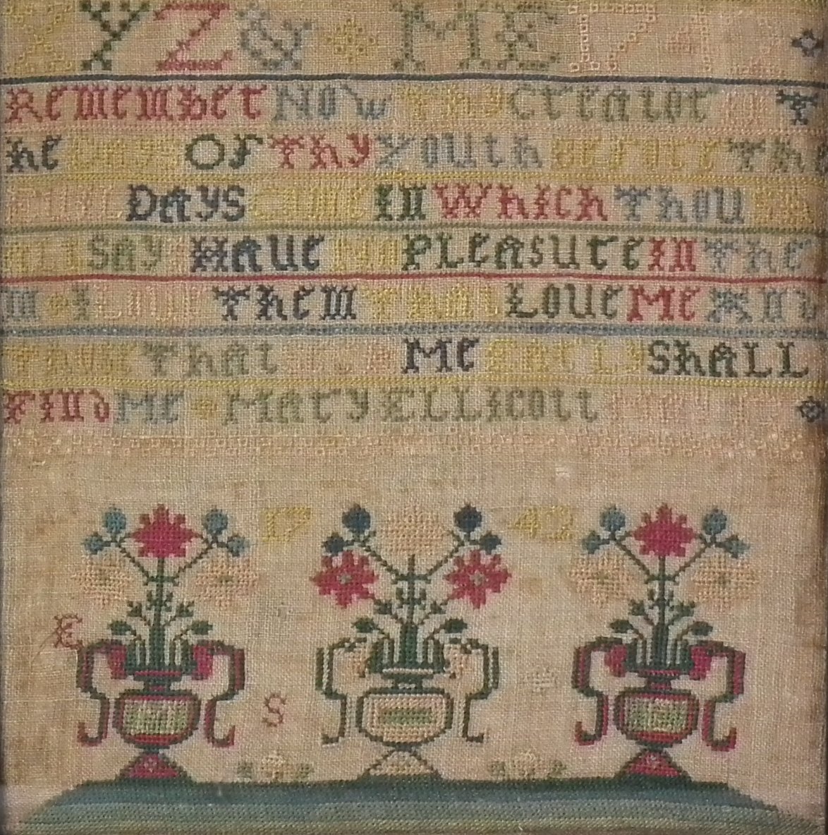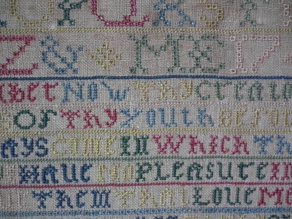 The sampler is worked in silk on linen ground, in cross stitch and Algerian eye.