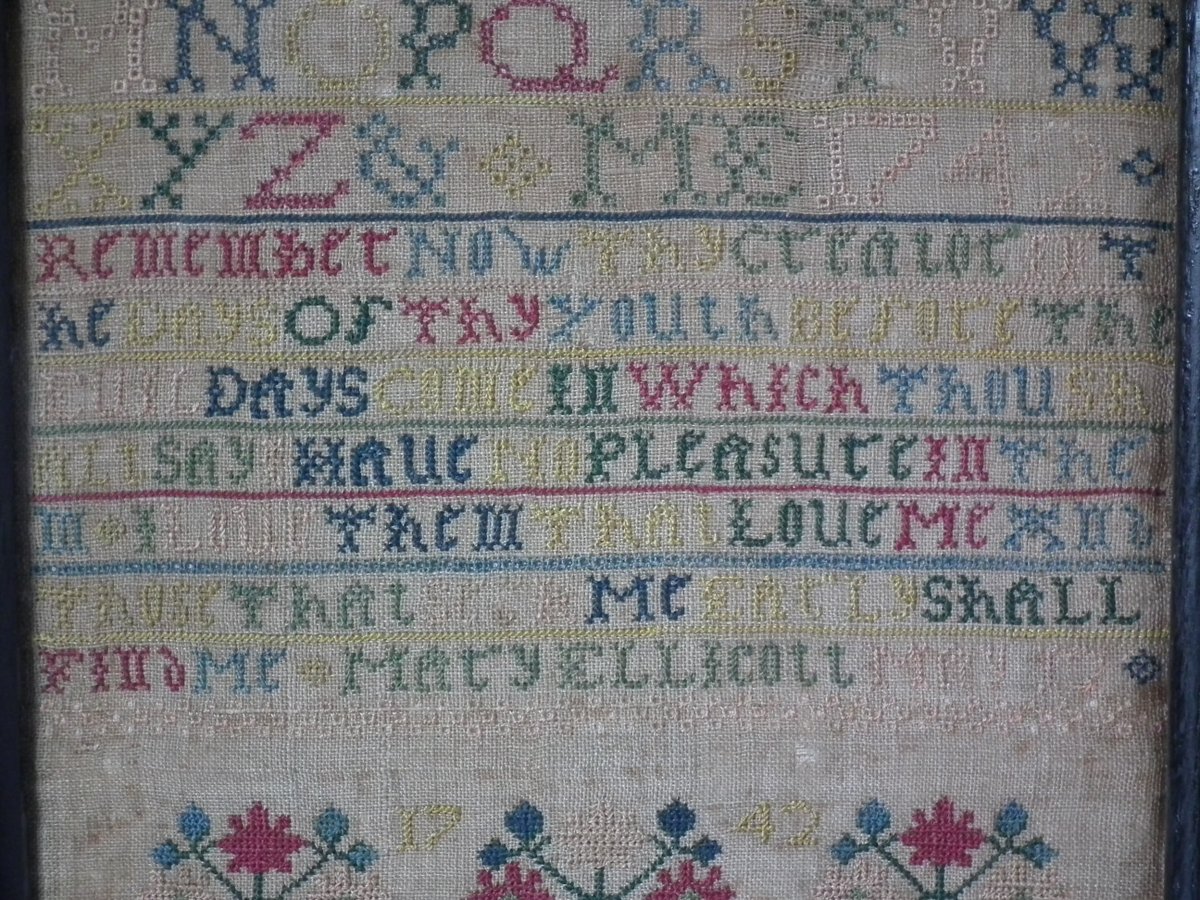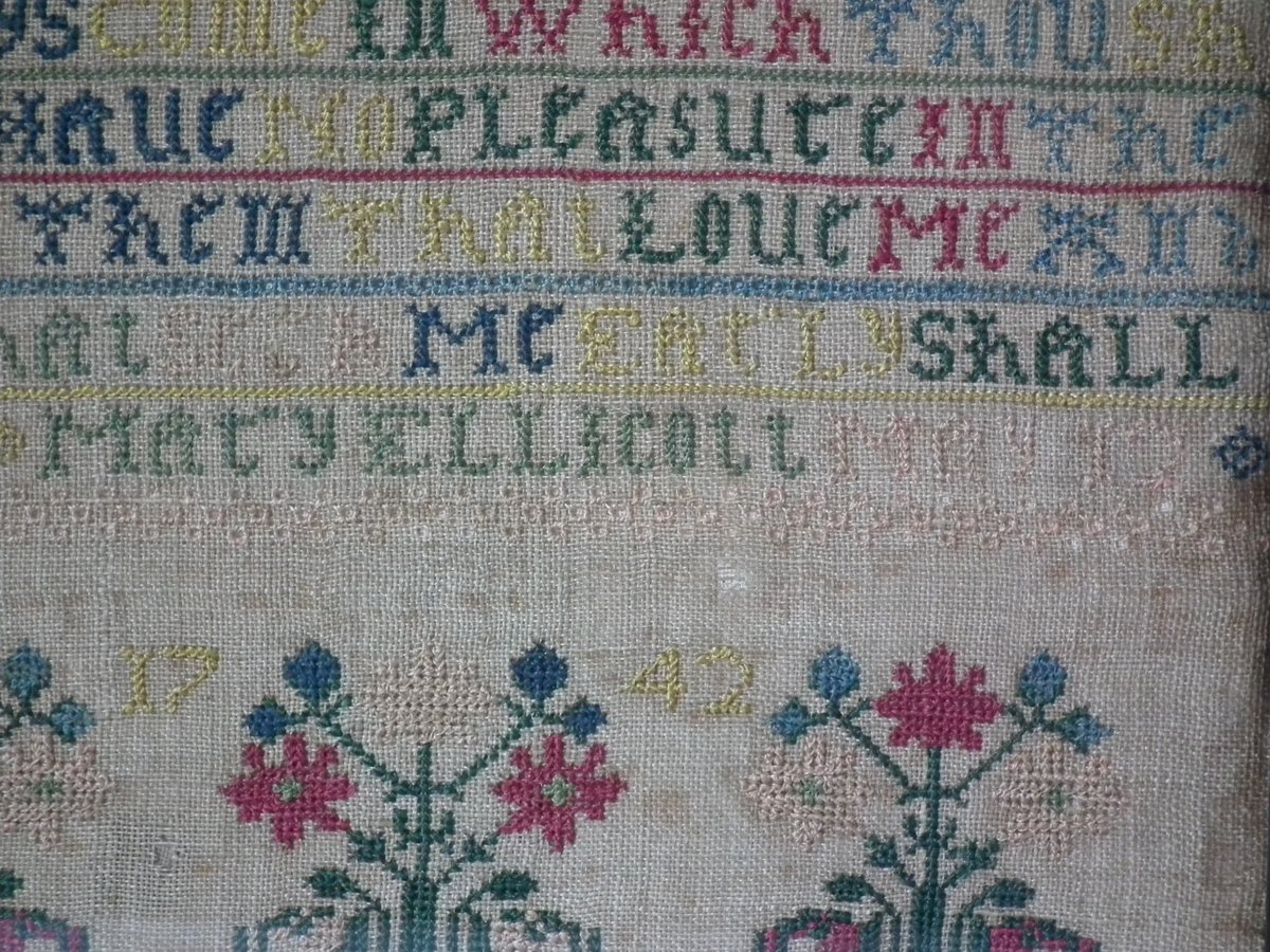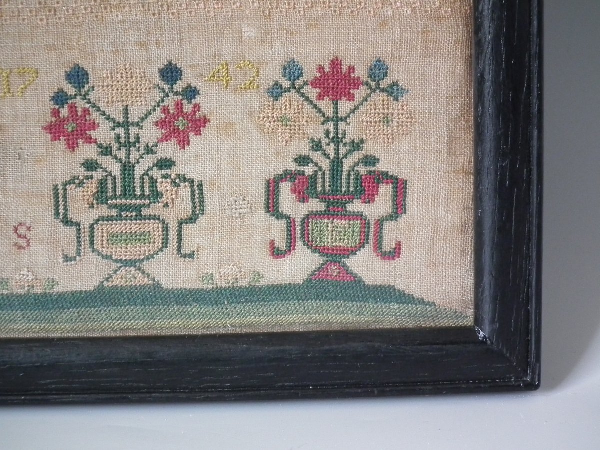 George II, dated May 12 1742. 15.25ins by 7.5ins wide. Antique Sampler, 1742 Verse sampler by Mary Ellicott.