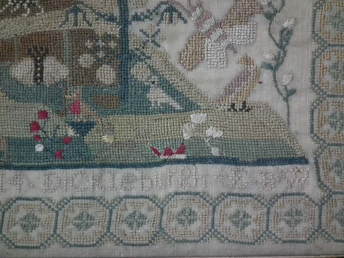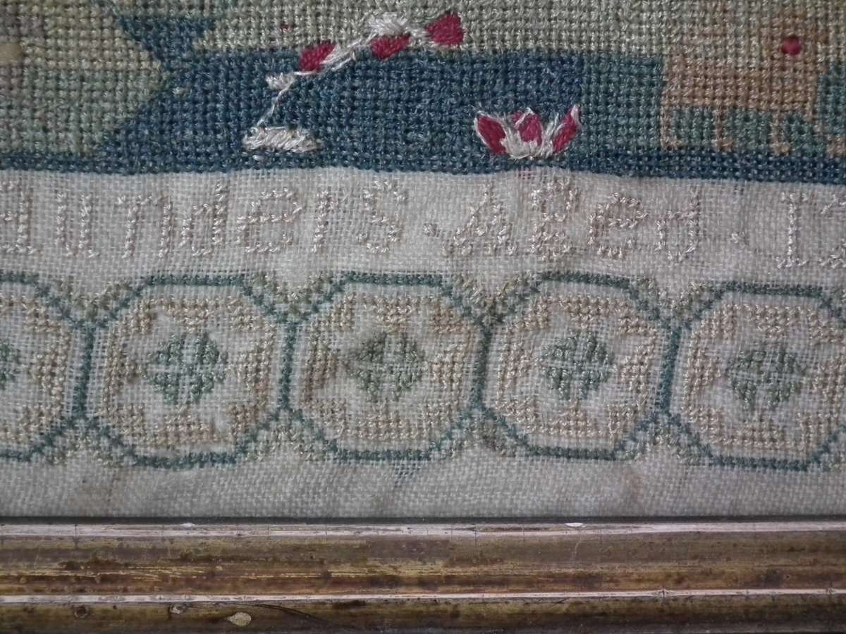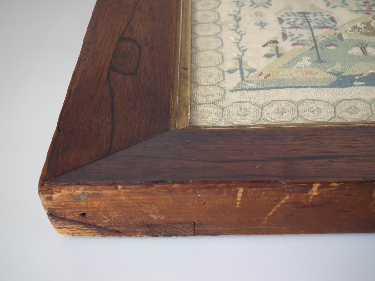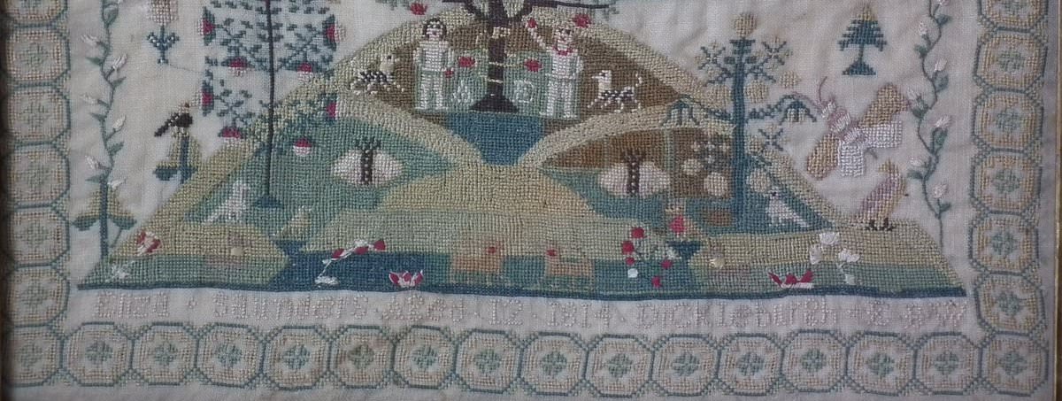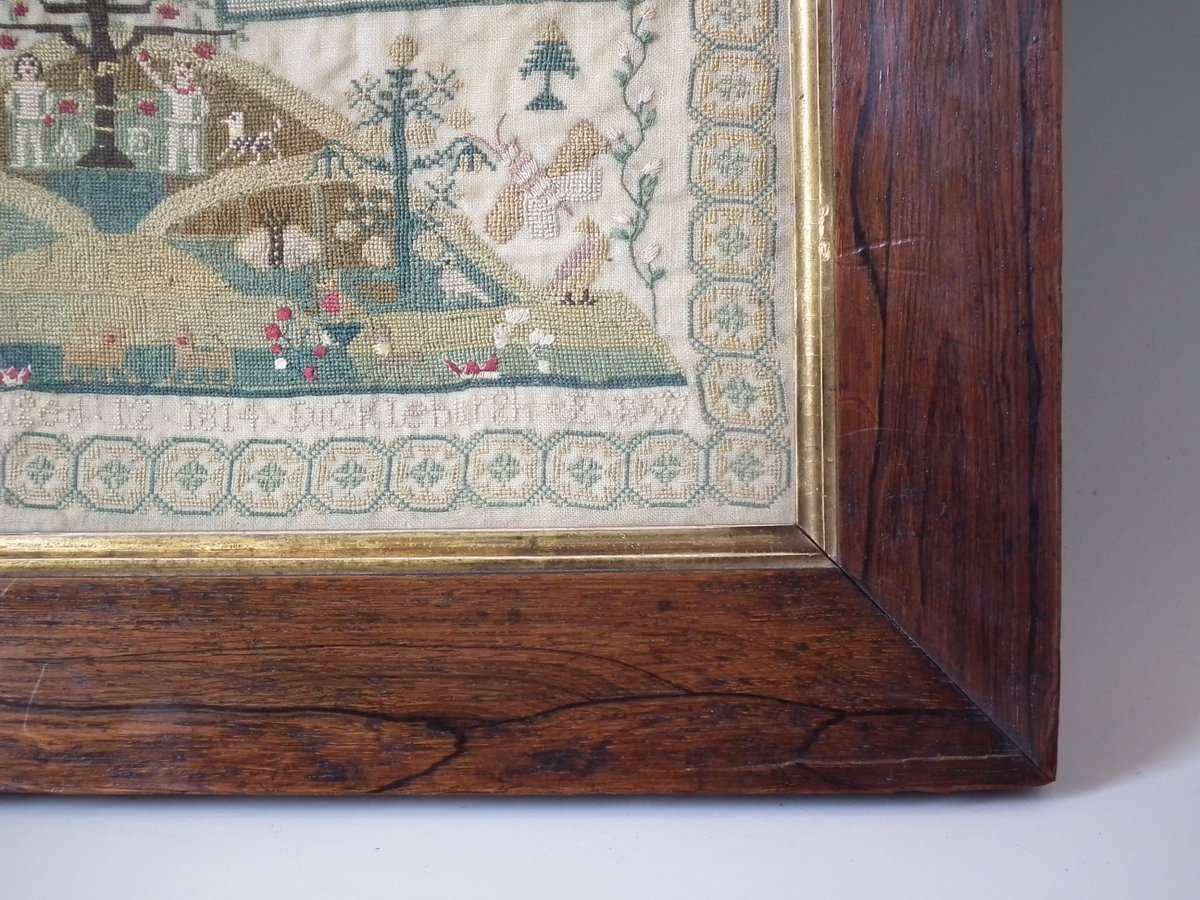 George III, dated 1814. 10.8ins high, 12ins wide, 1.6ins deep. 1814 Adam & Eve Norfolk Sampler by Eliza Saunders.