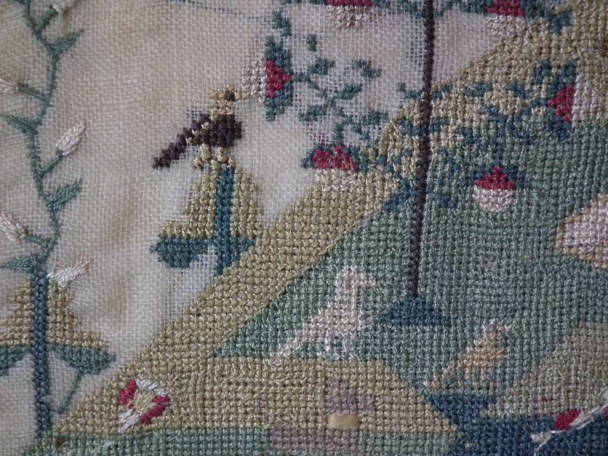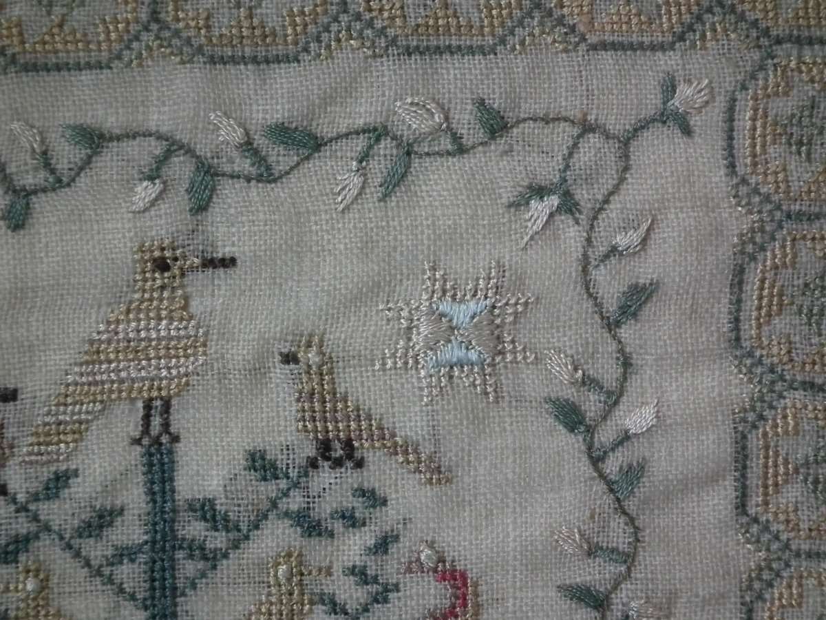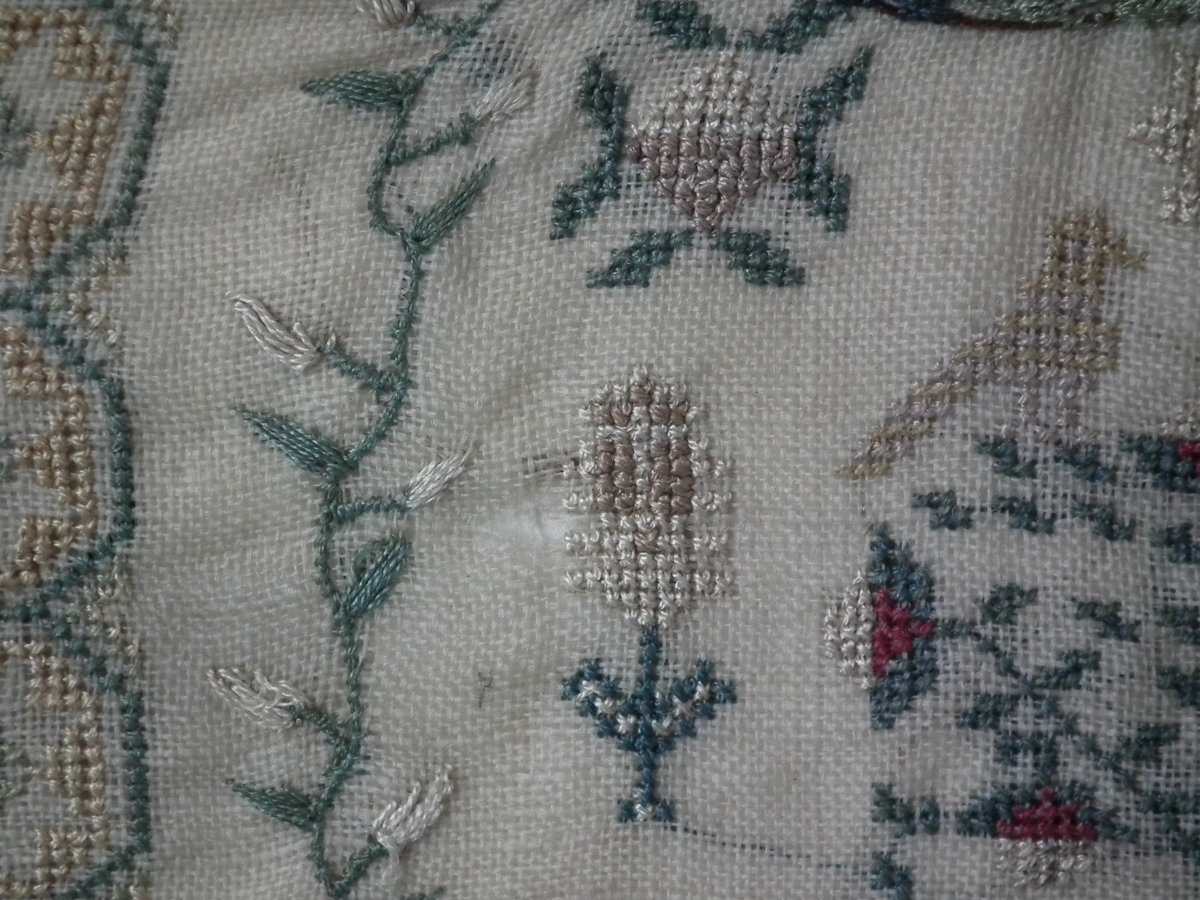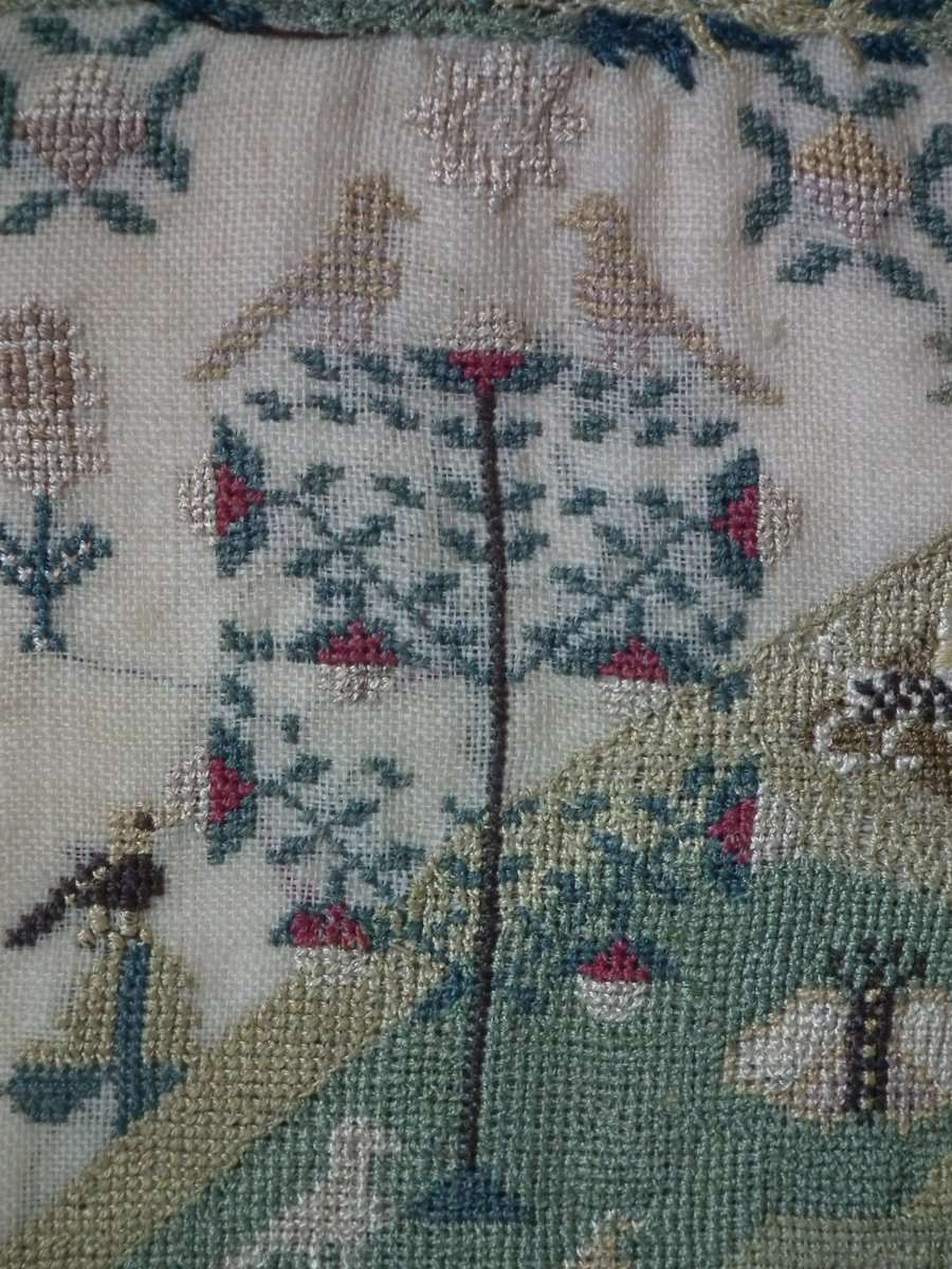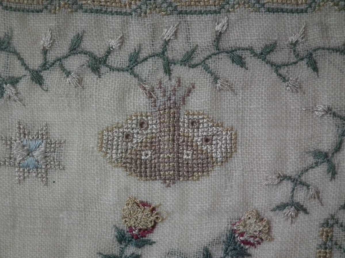 The sampler is worked in silk on linen ground, in a variety of stitches including Algerian eye.