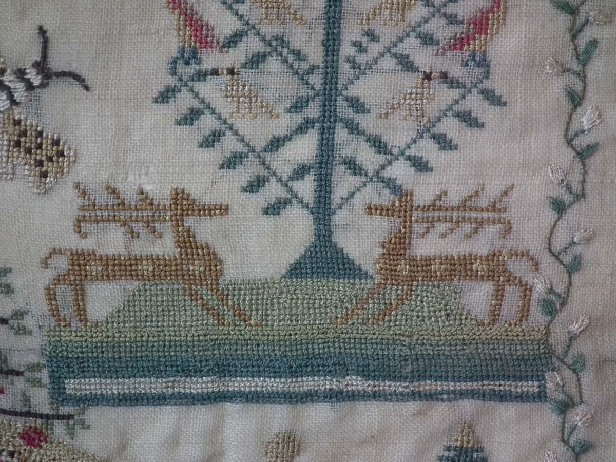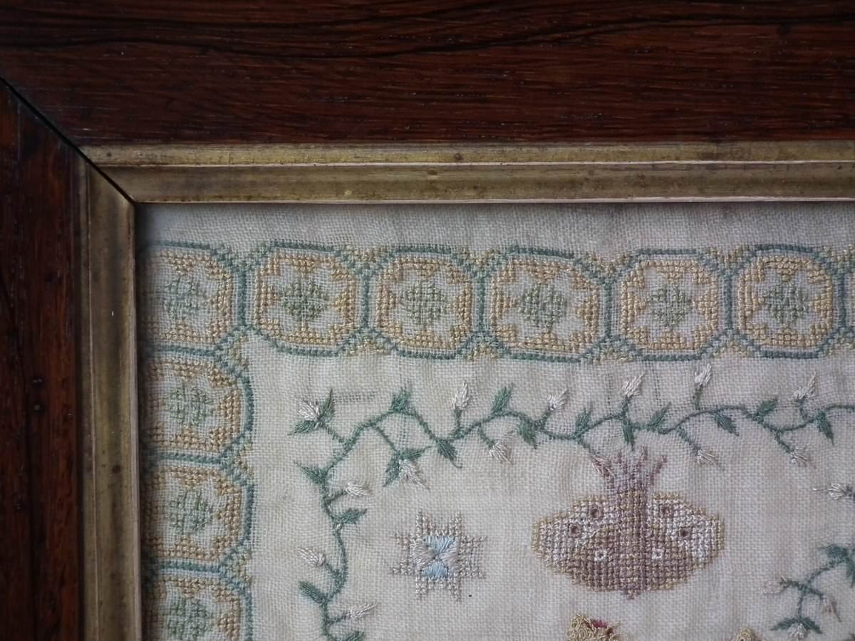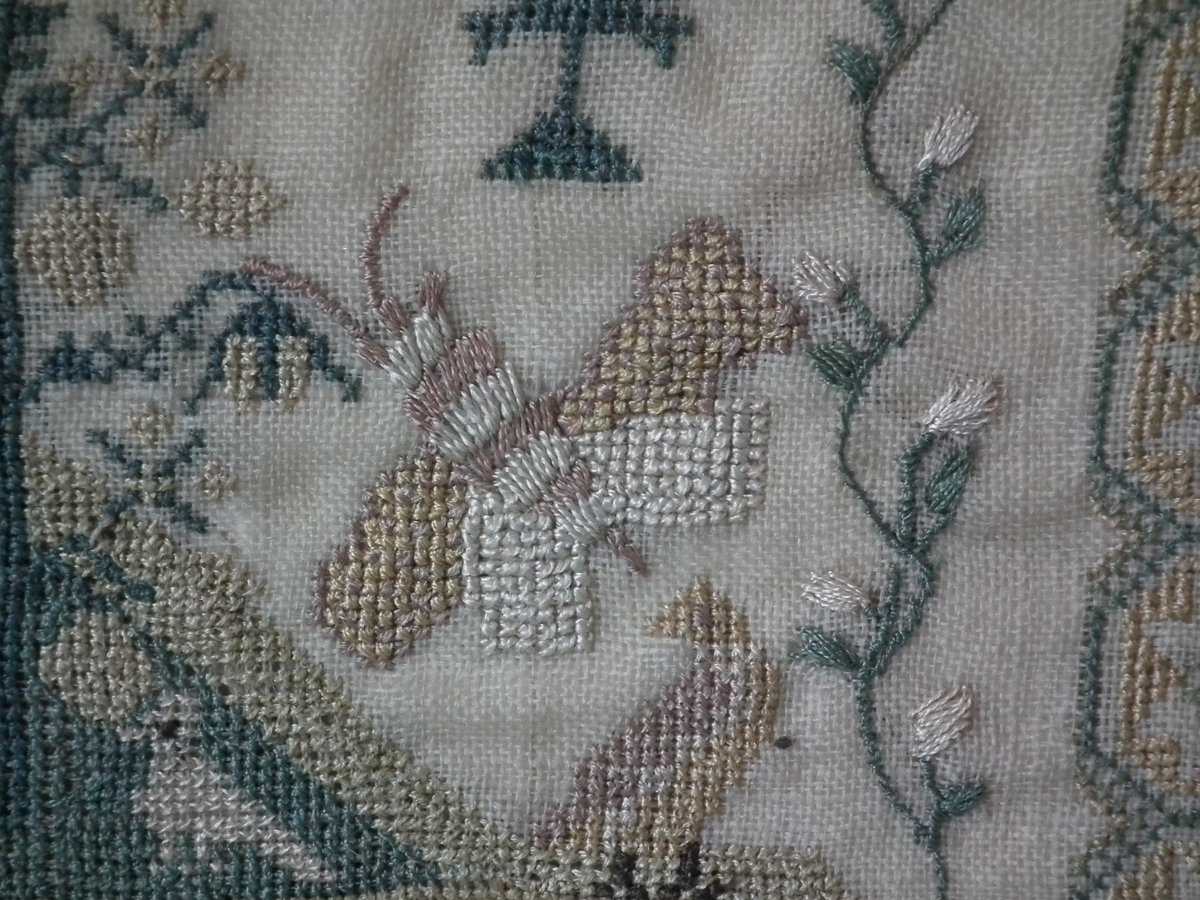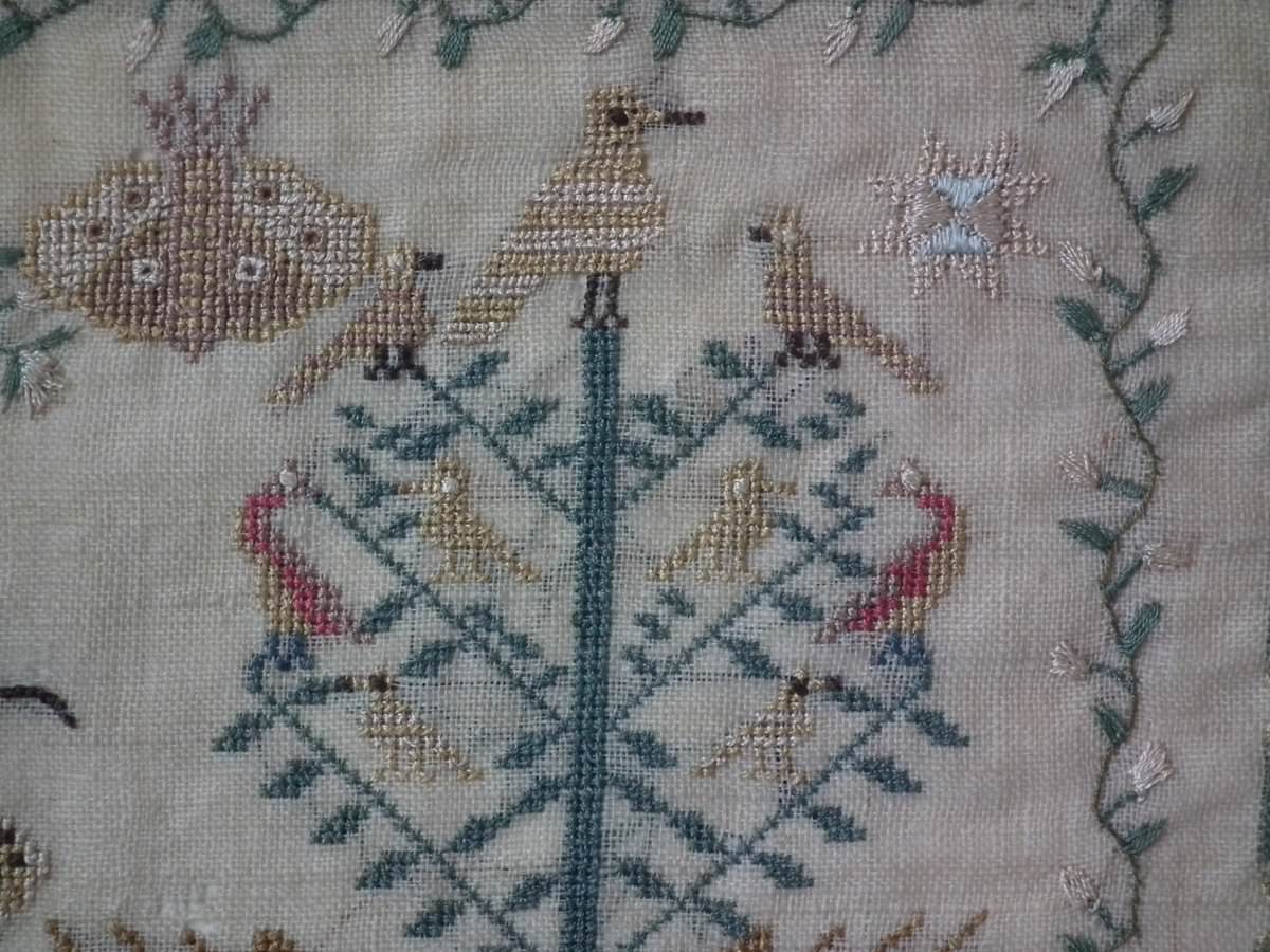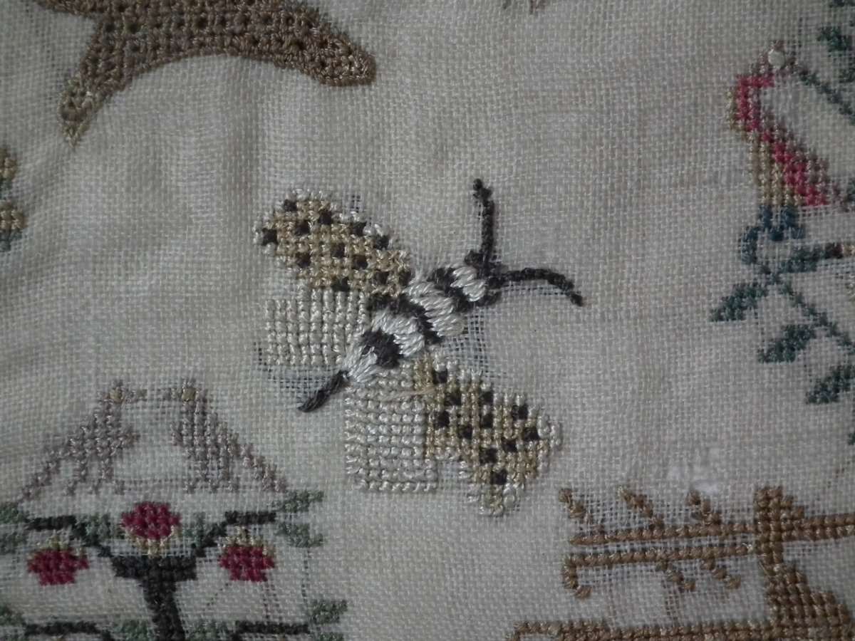 The sampler is worked in silk on linen ground, in a variety of stitches including Algerian eye.