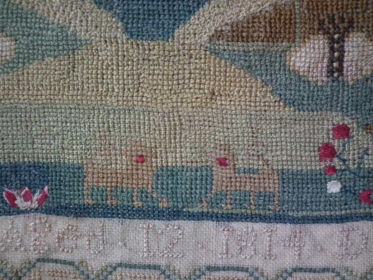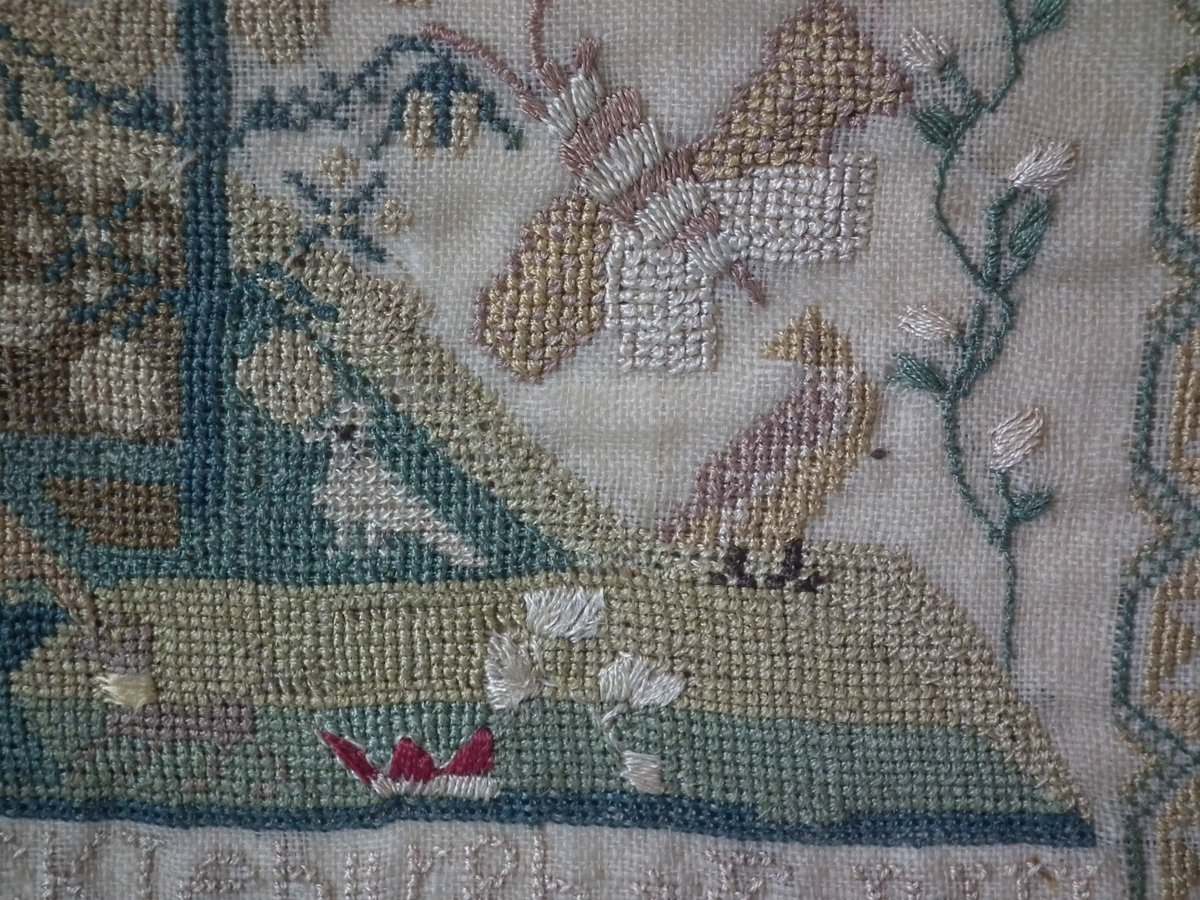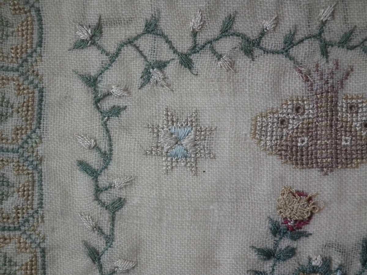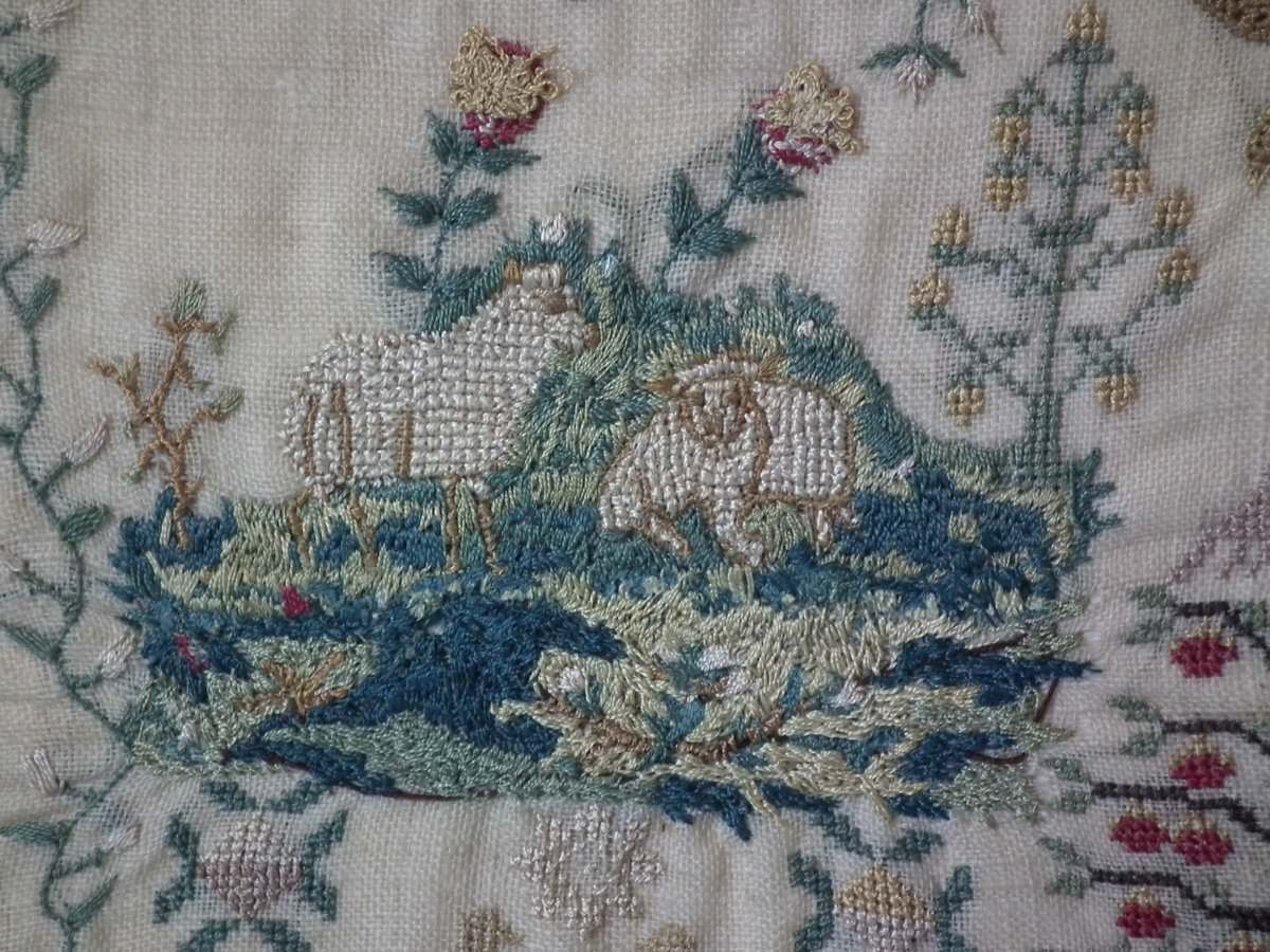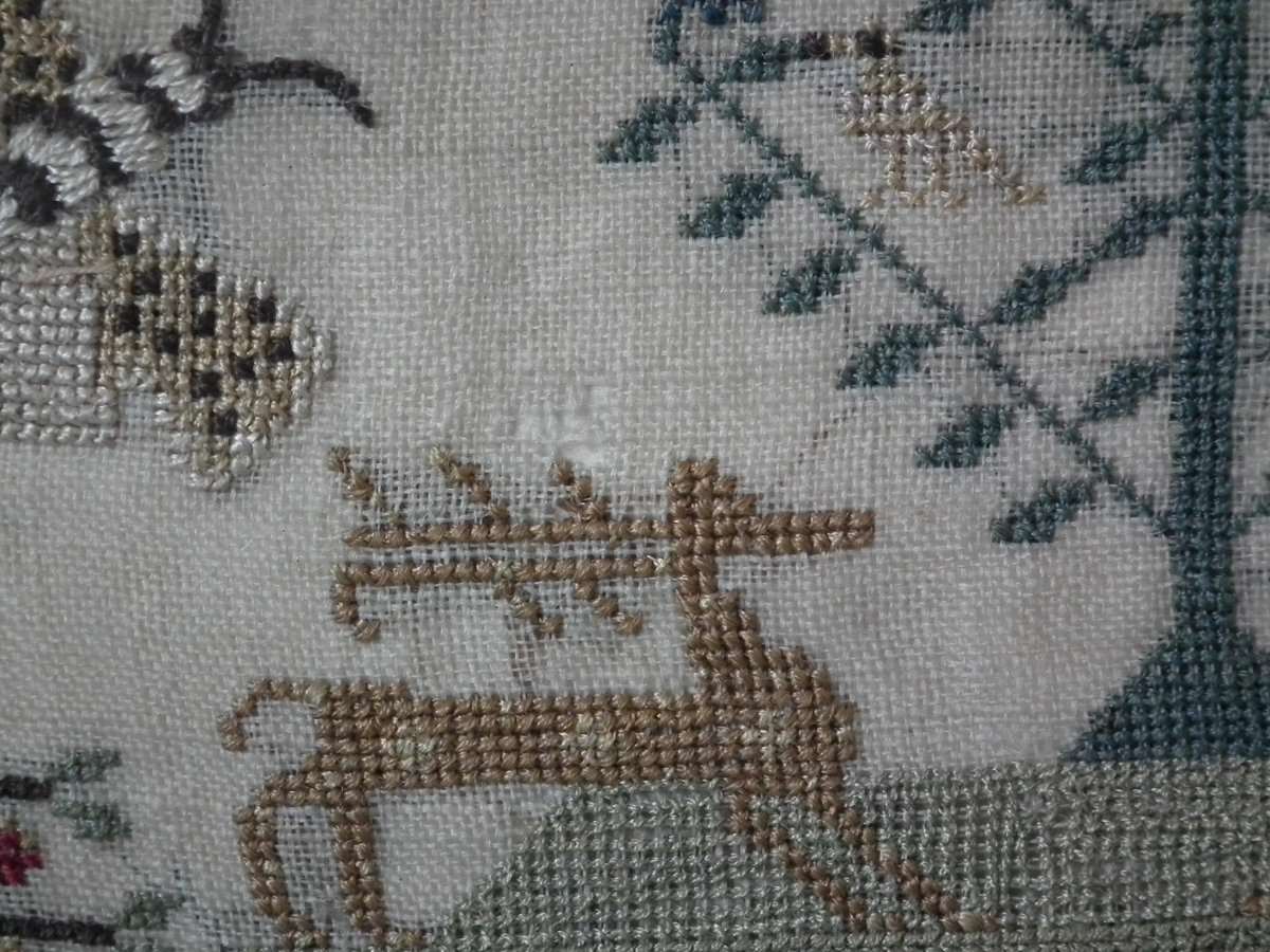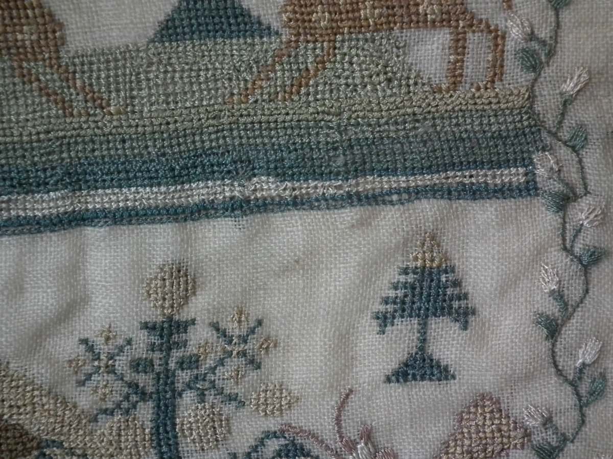 The sampler is worked in silk on linen ground, in a variety of stitches including Algerian eye.