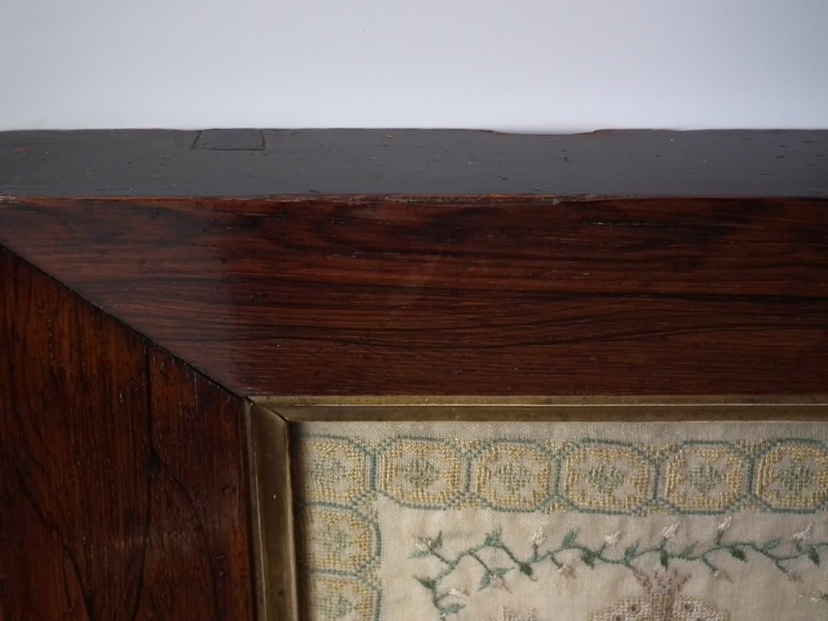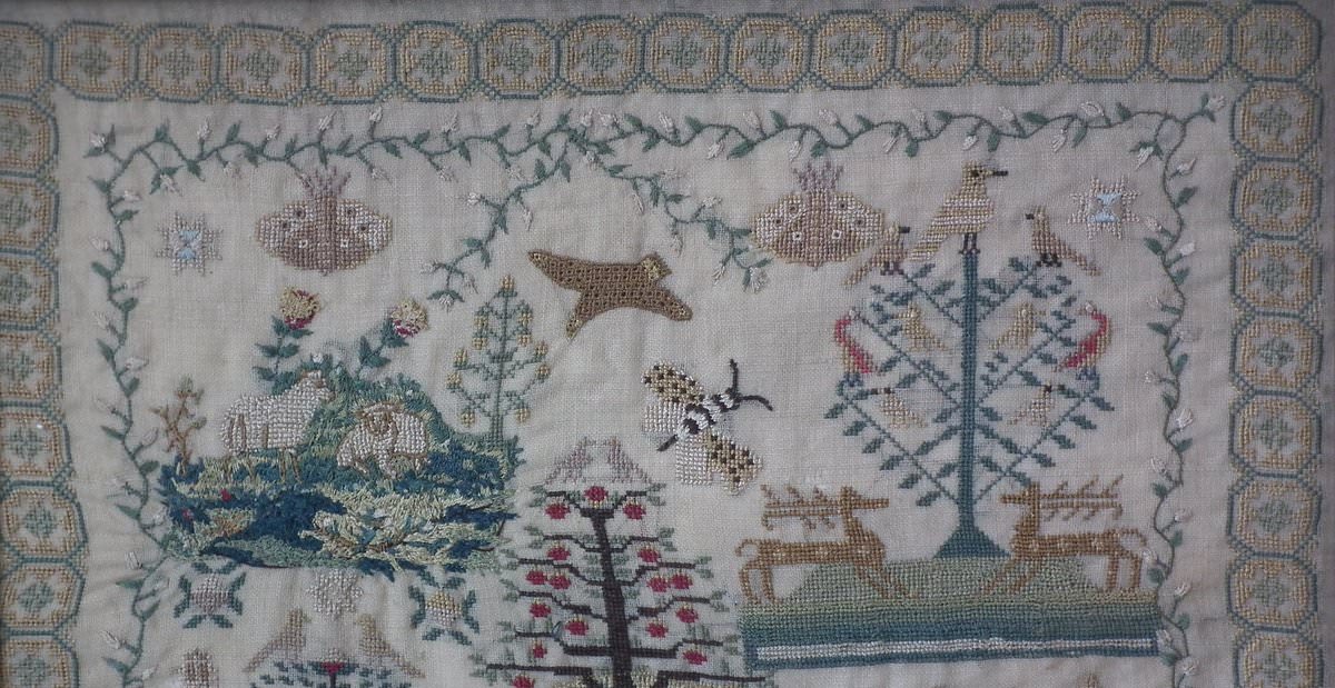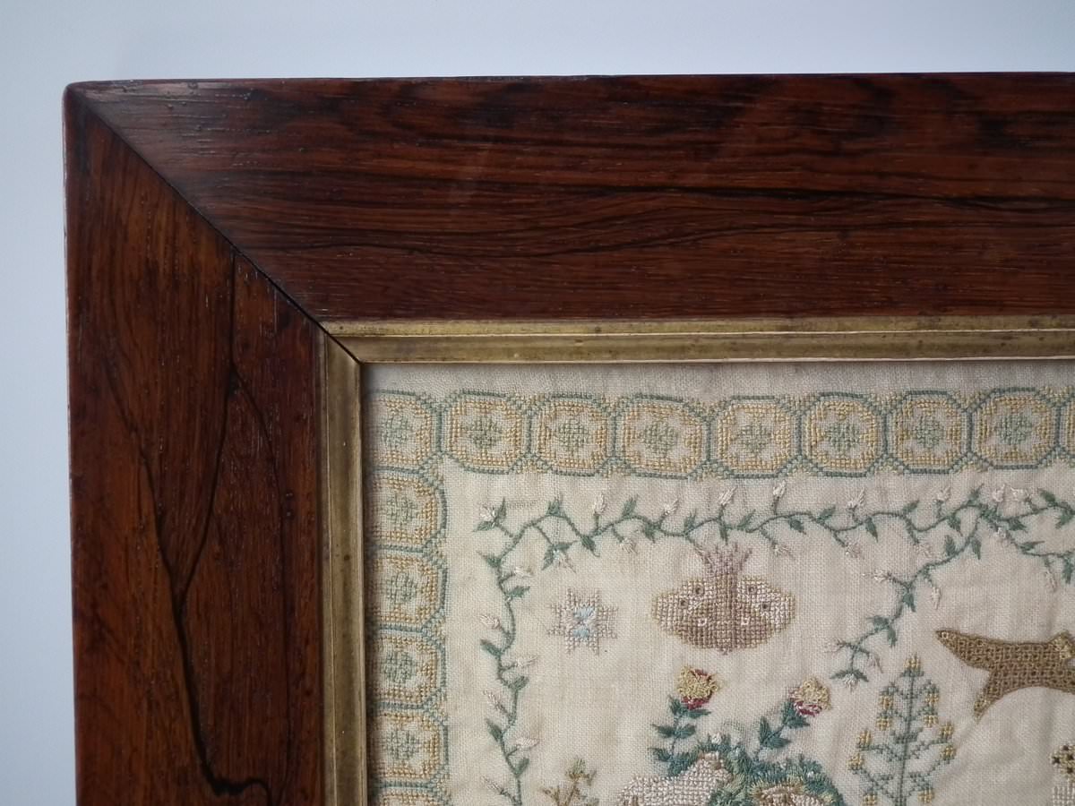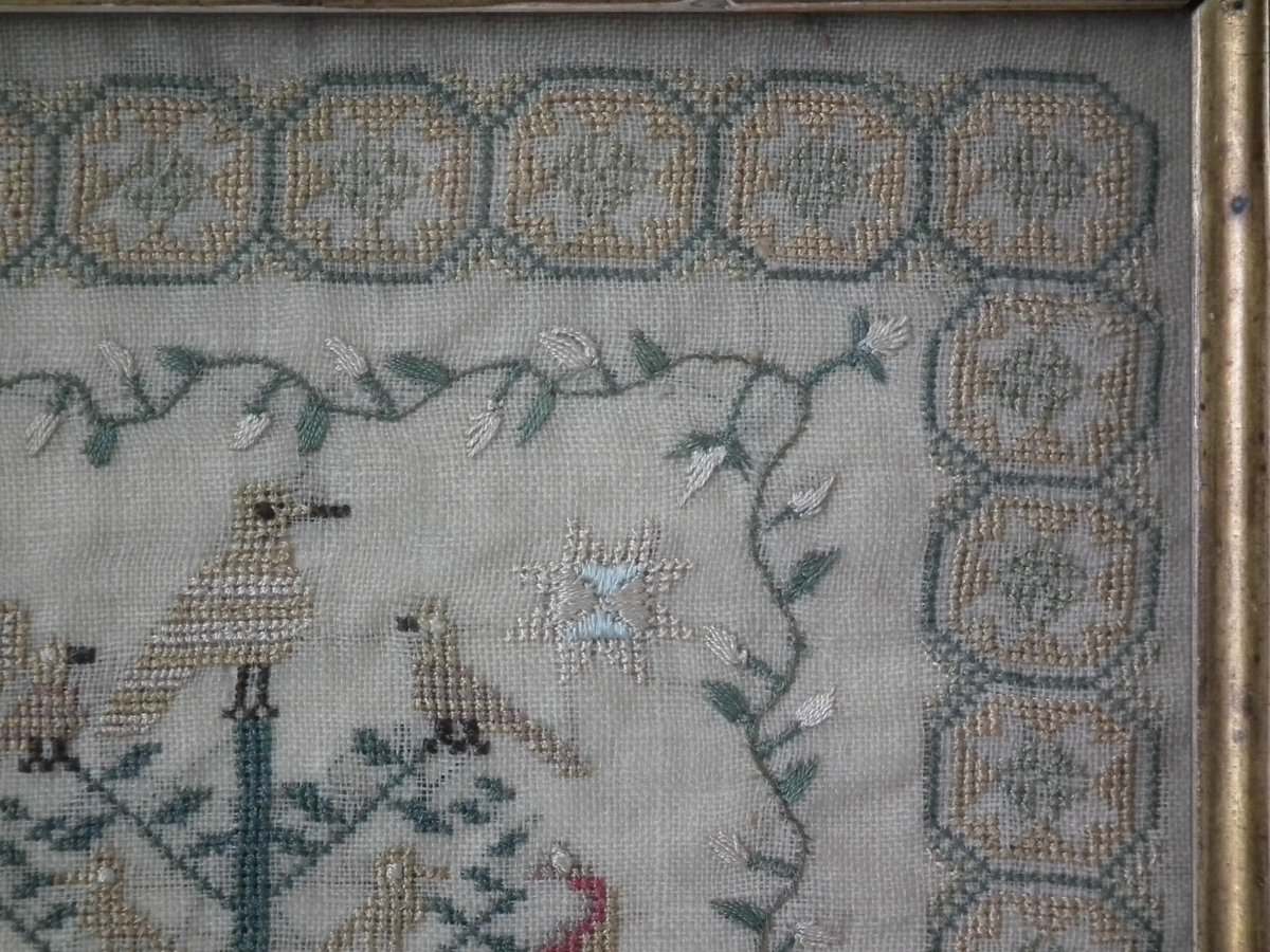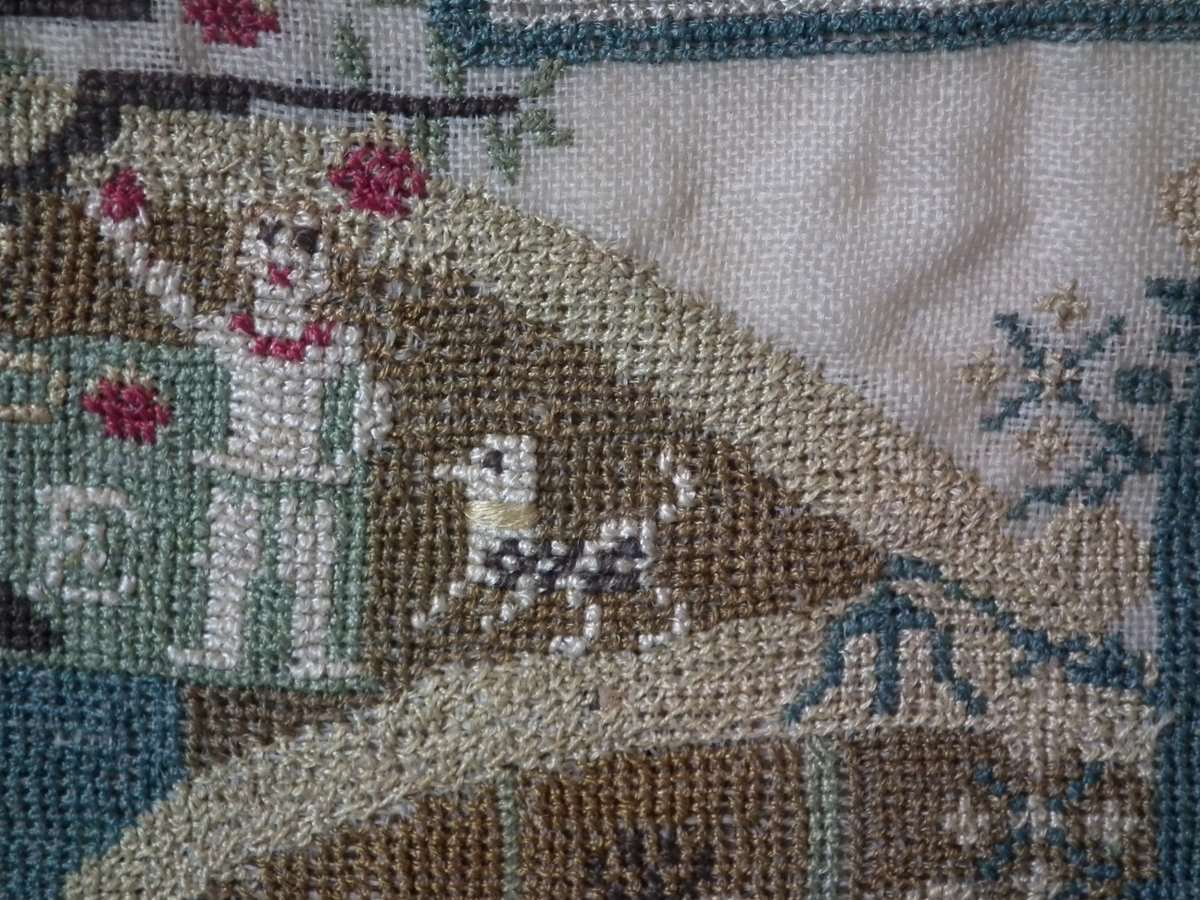 The sampler is worked in silk on linen ground, in a variety of stitches including Algerian eye.