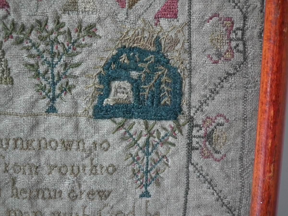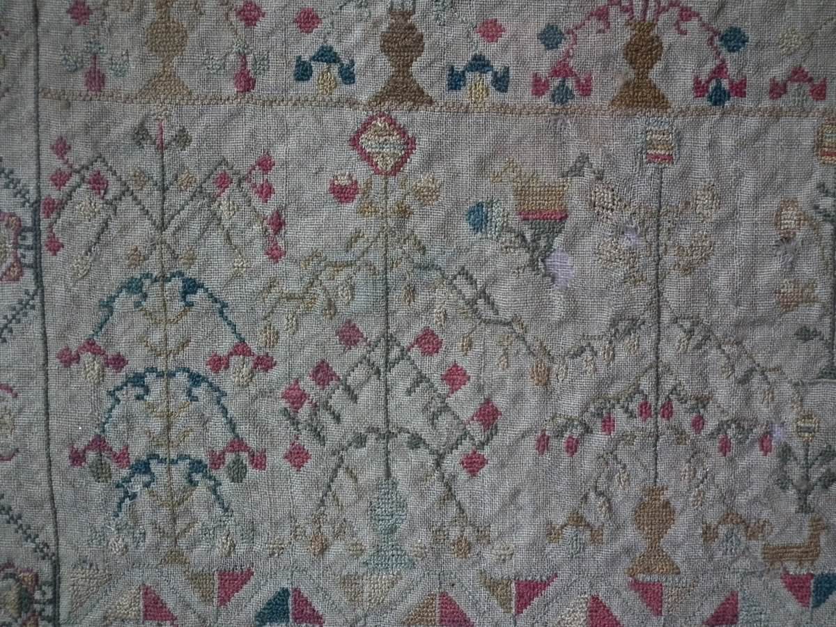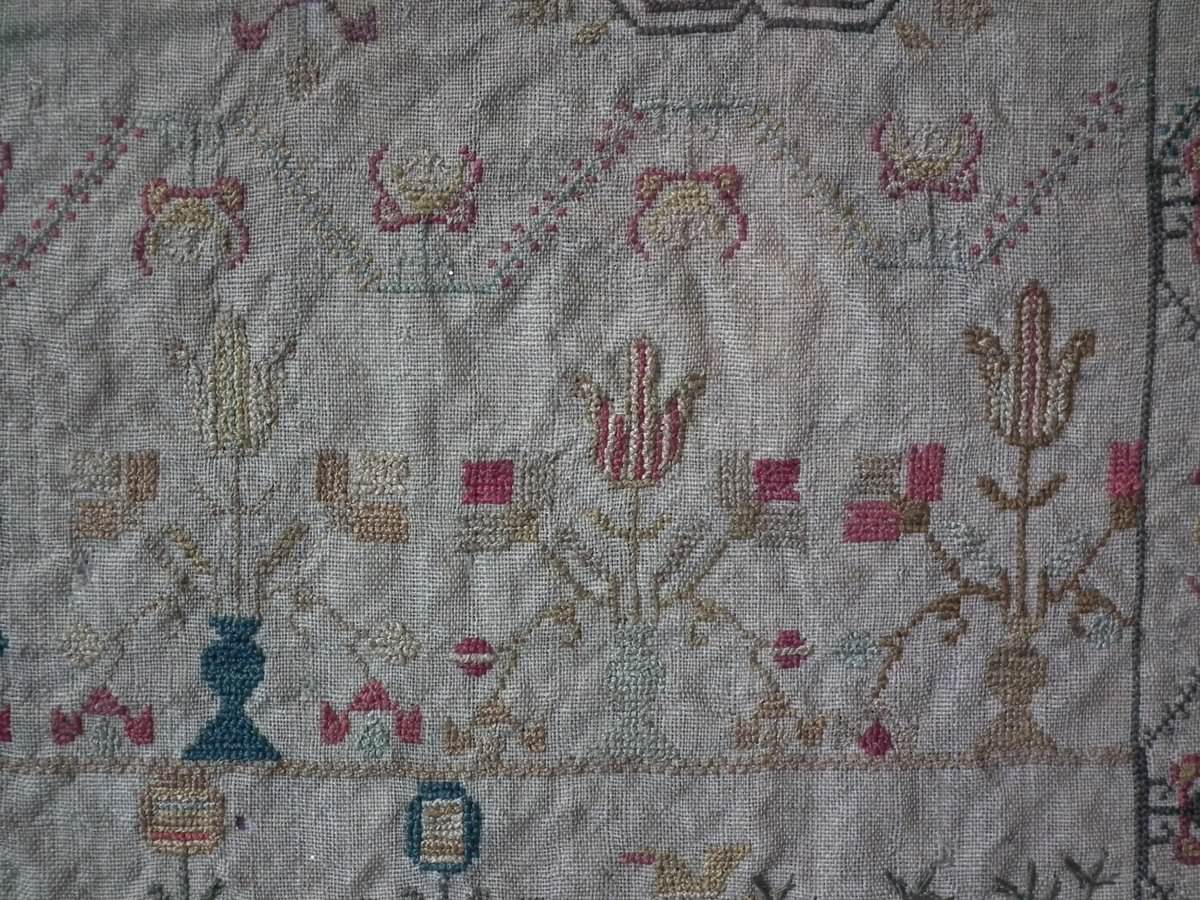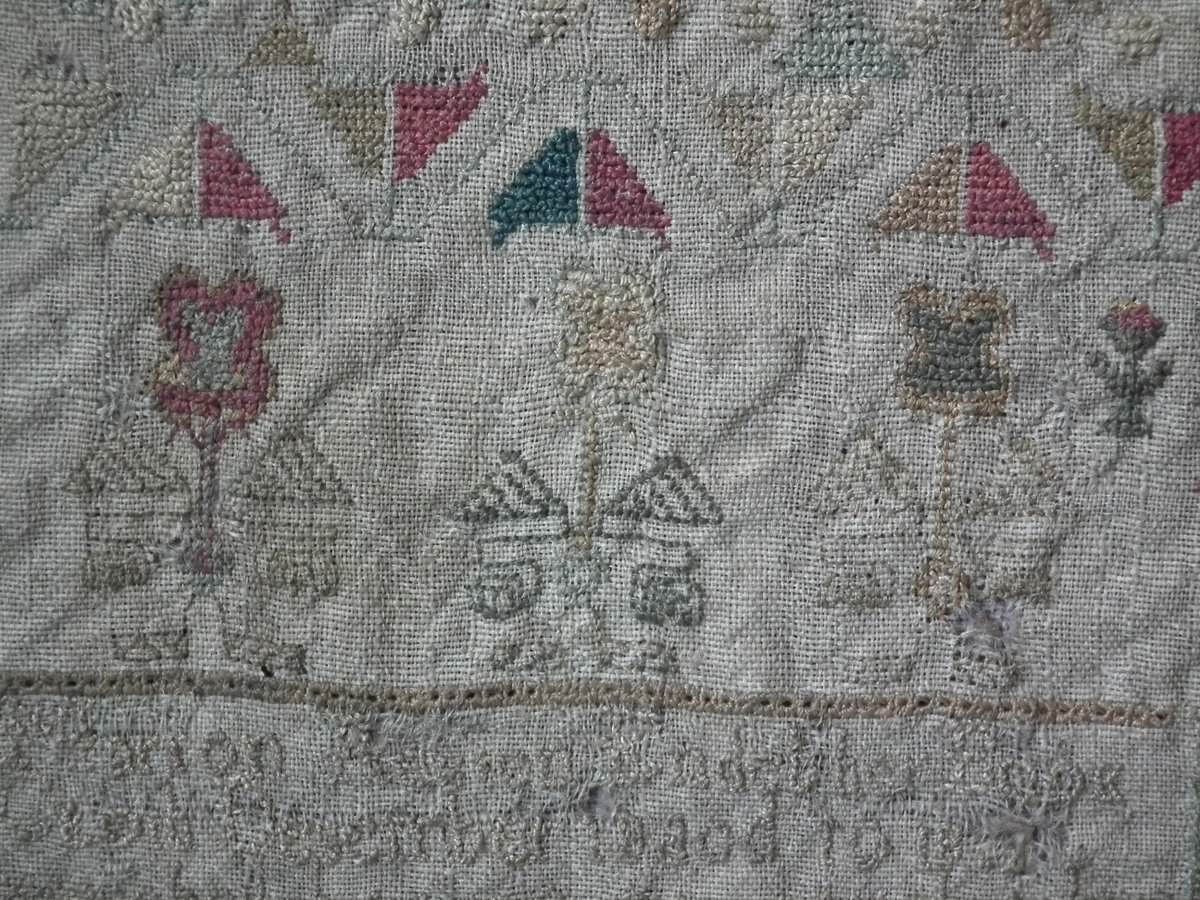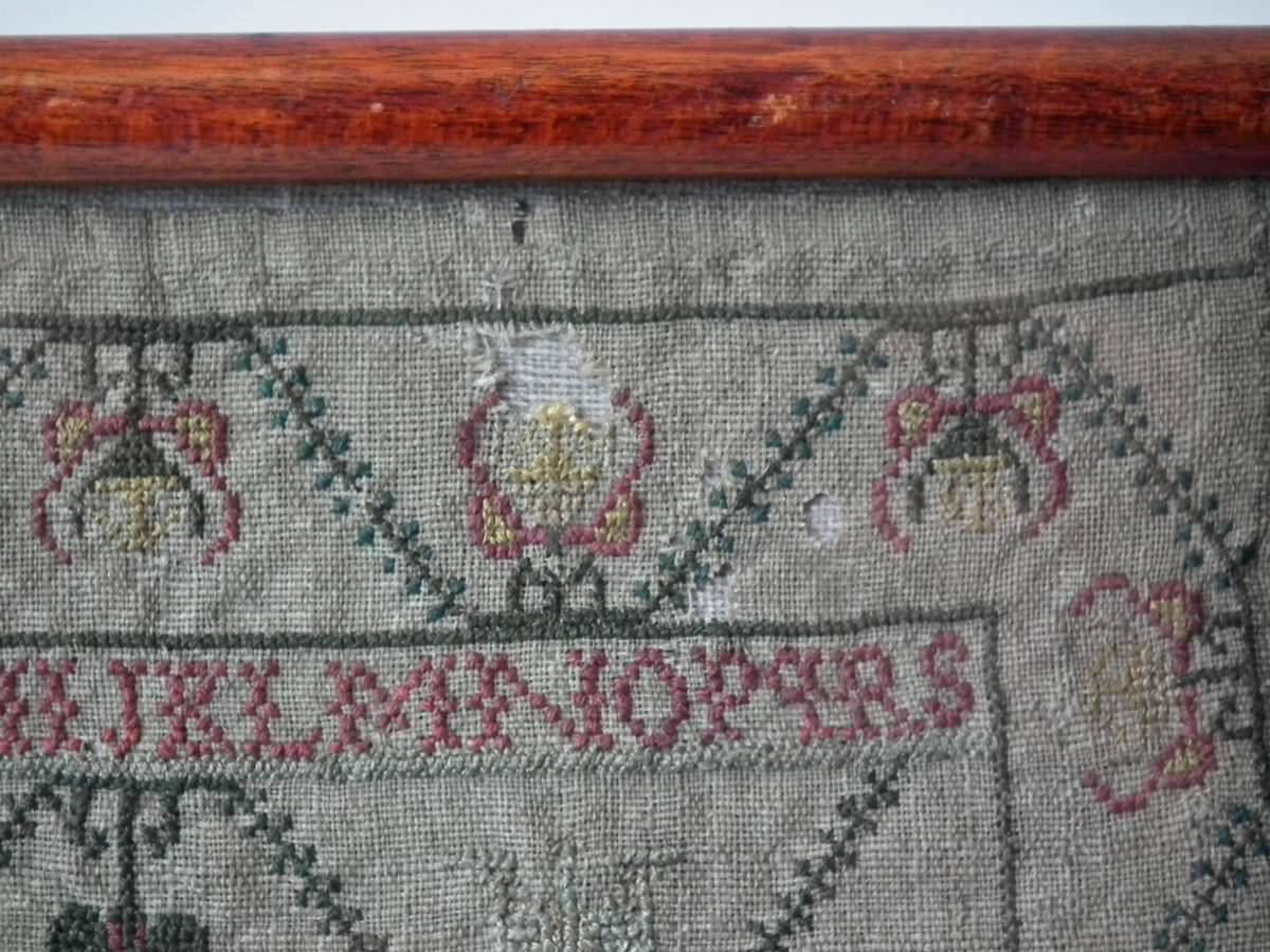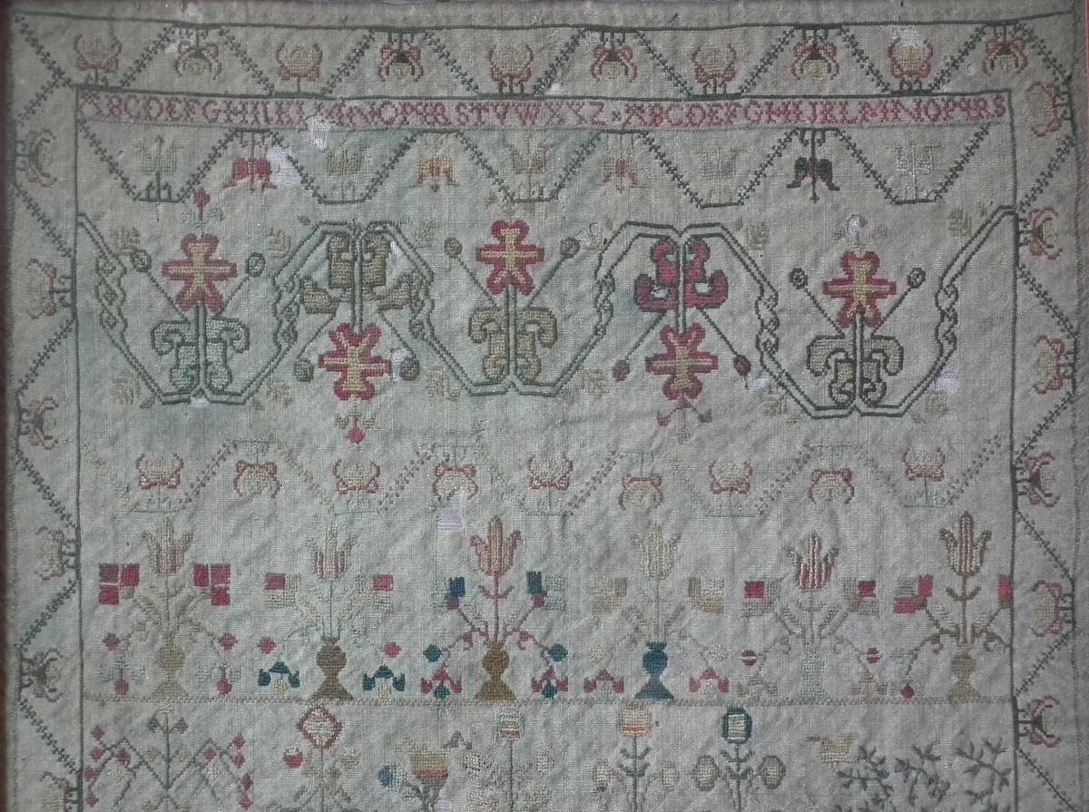 The sampler is worked in silk on linen ground, in a variety of stitches.