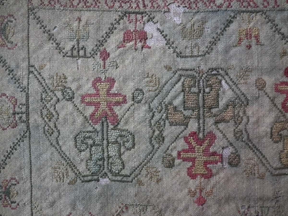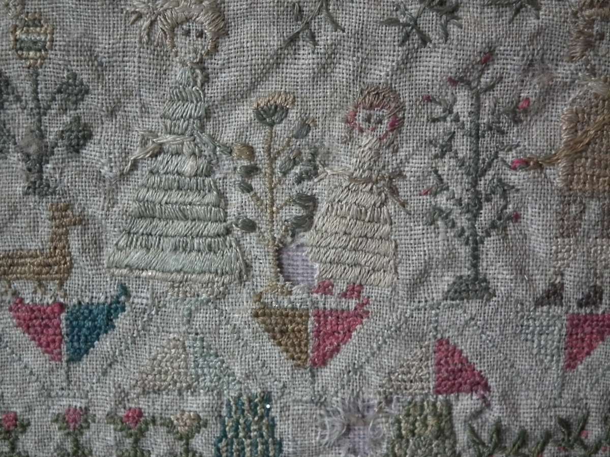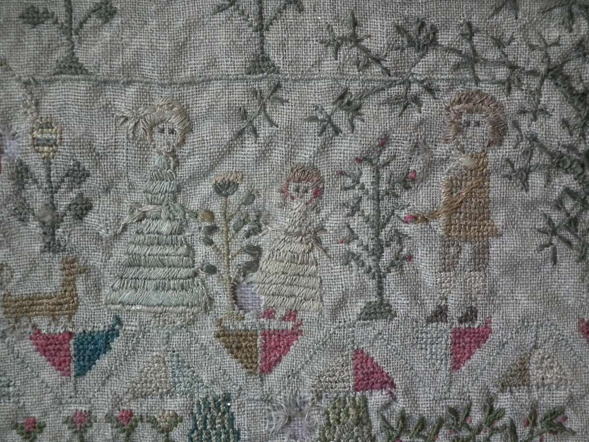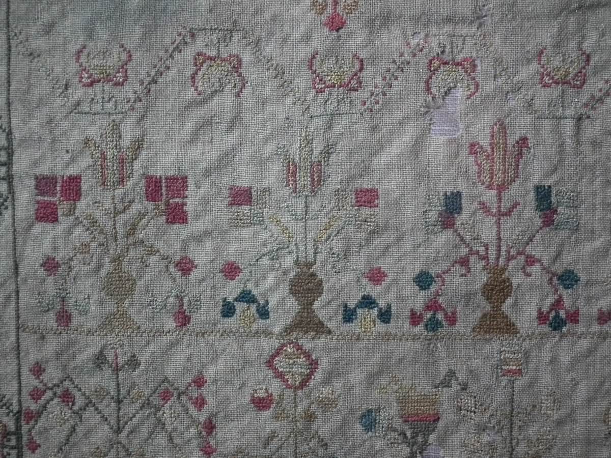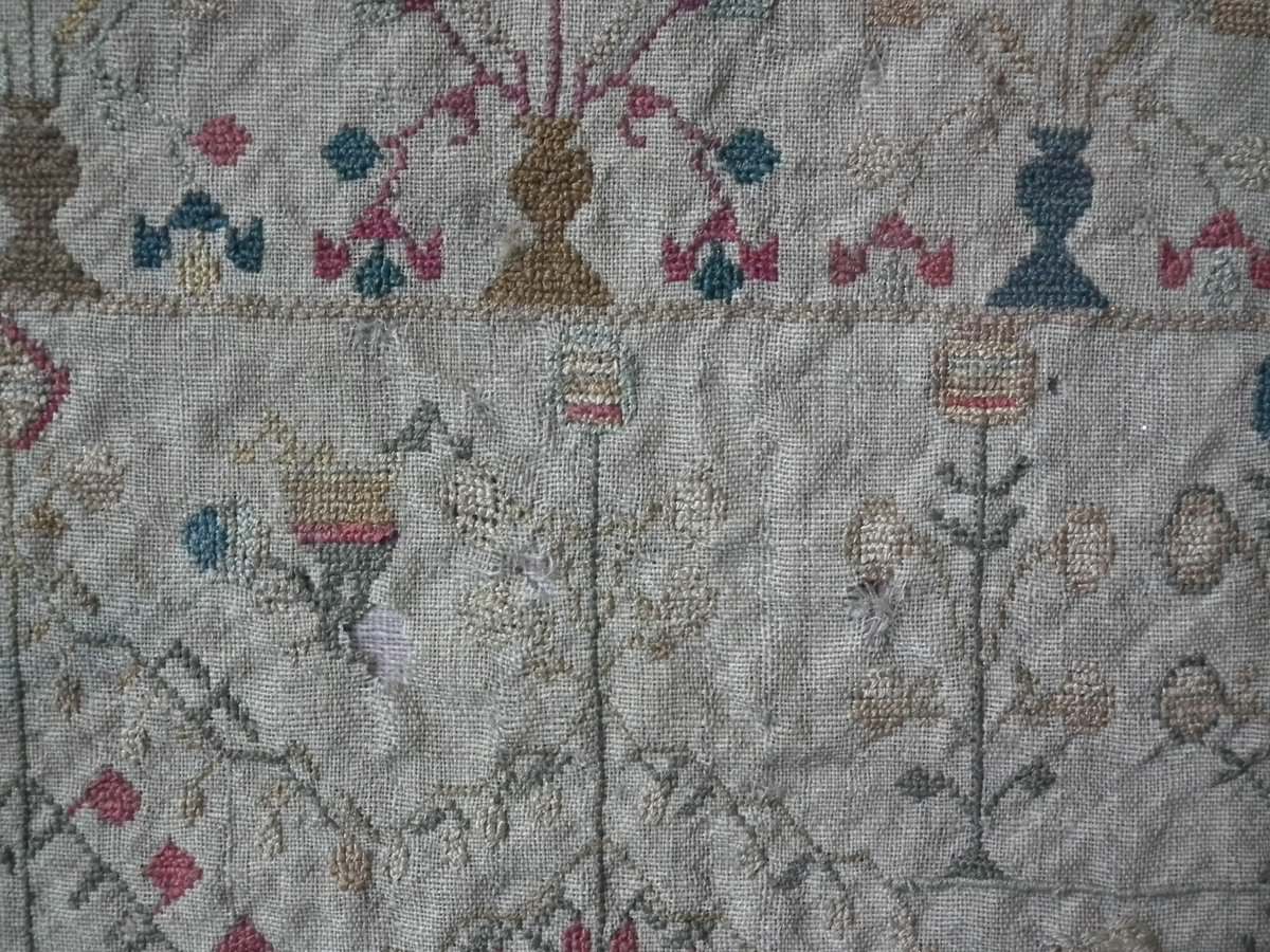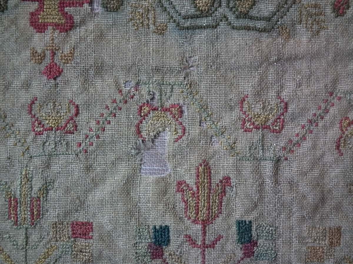 The sampler is worked in silk on linen ground, in a variety of stitches.