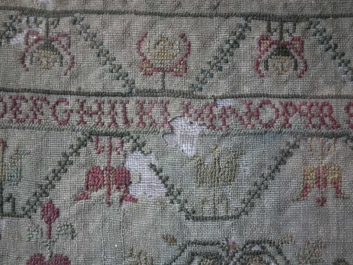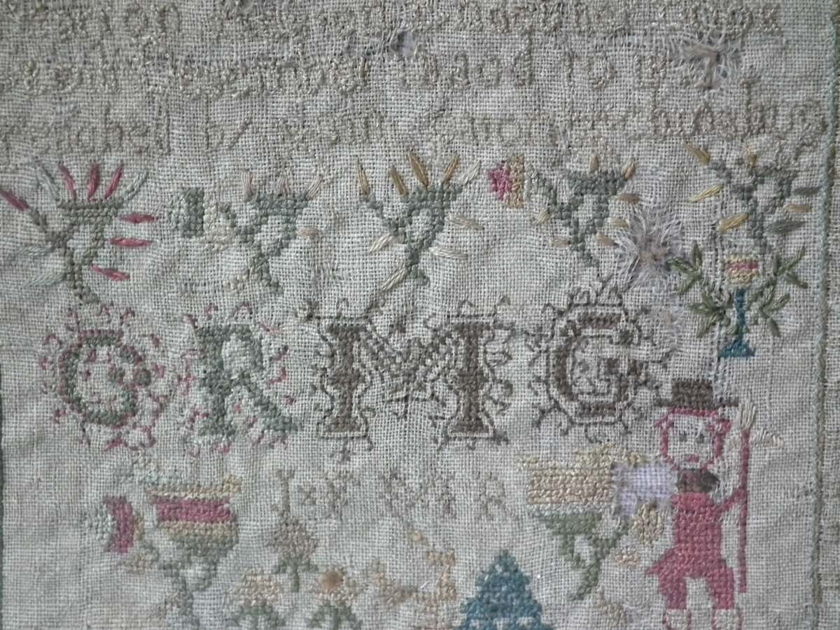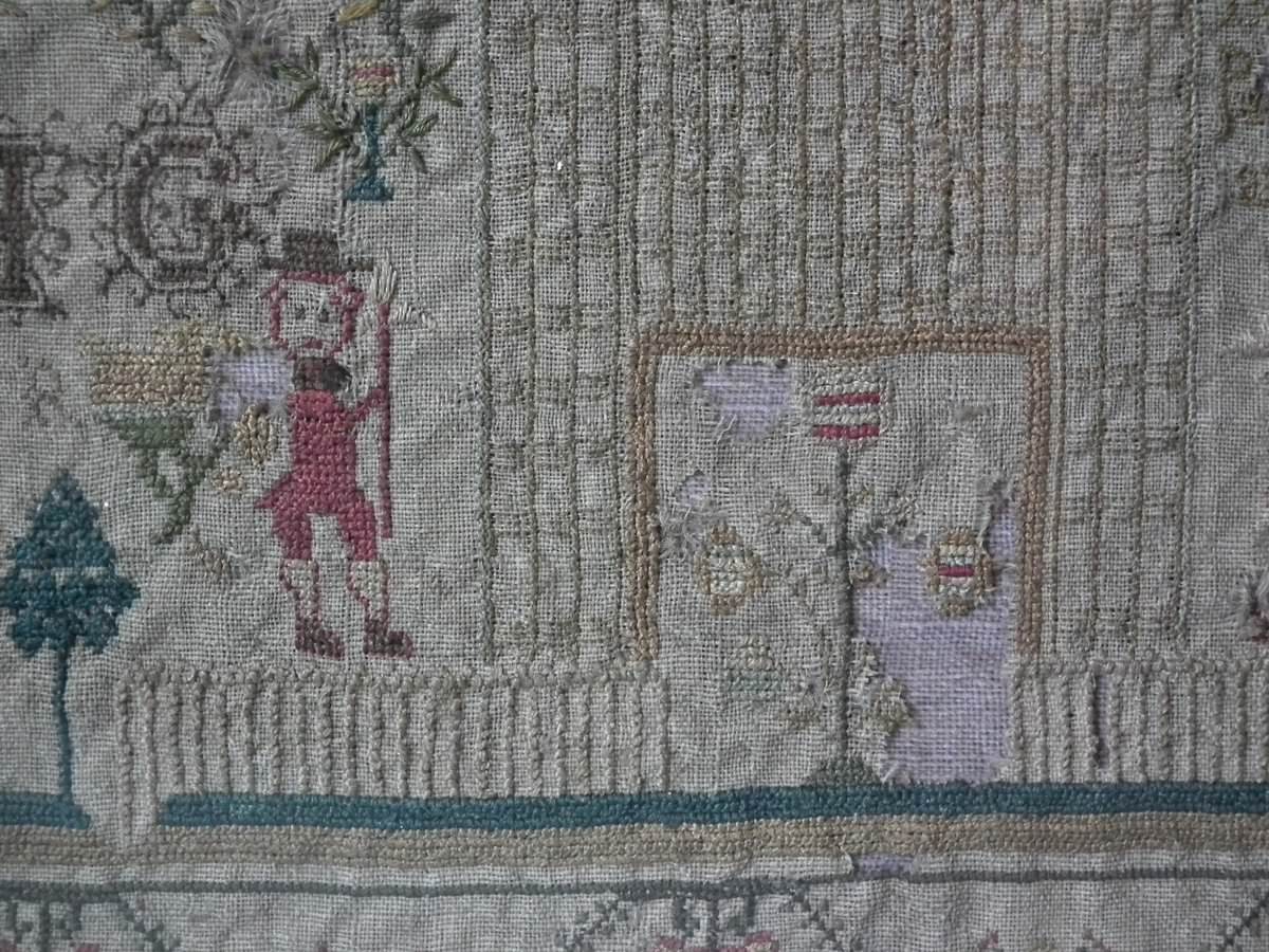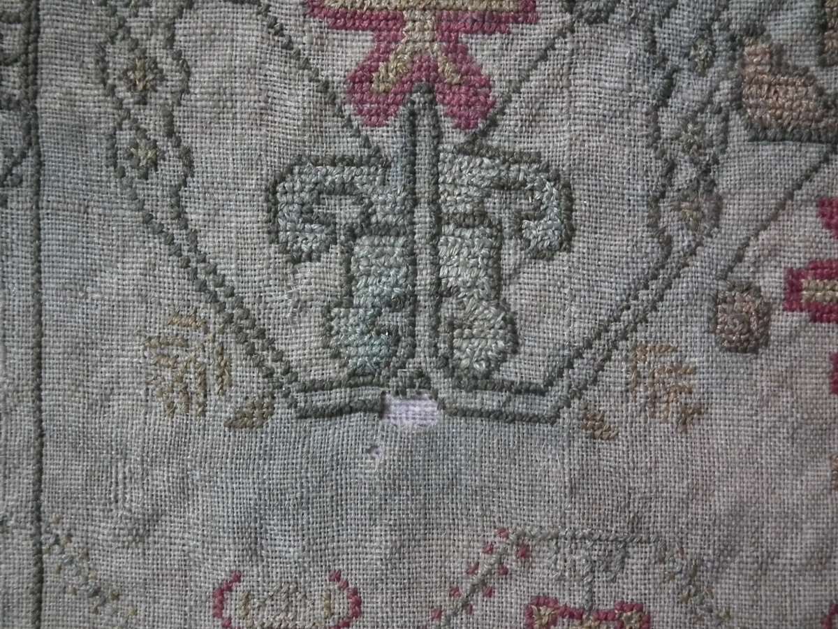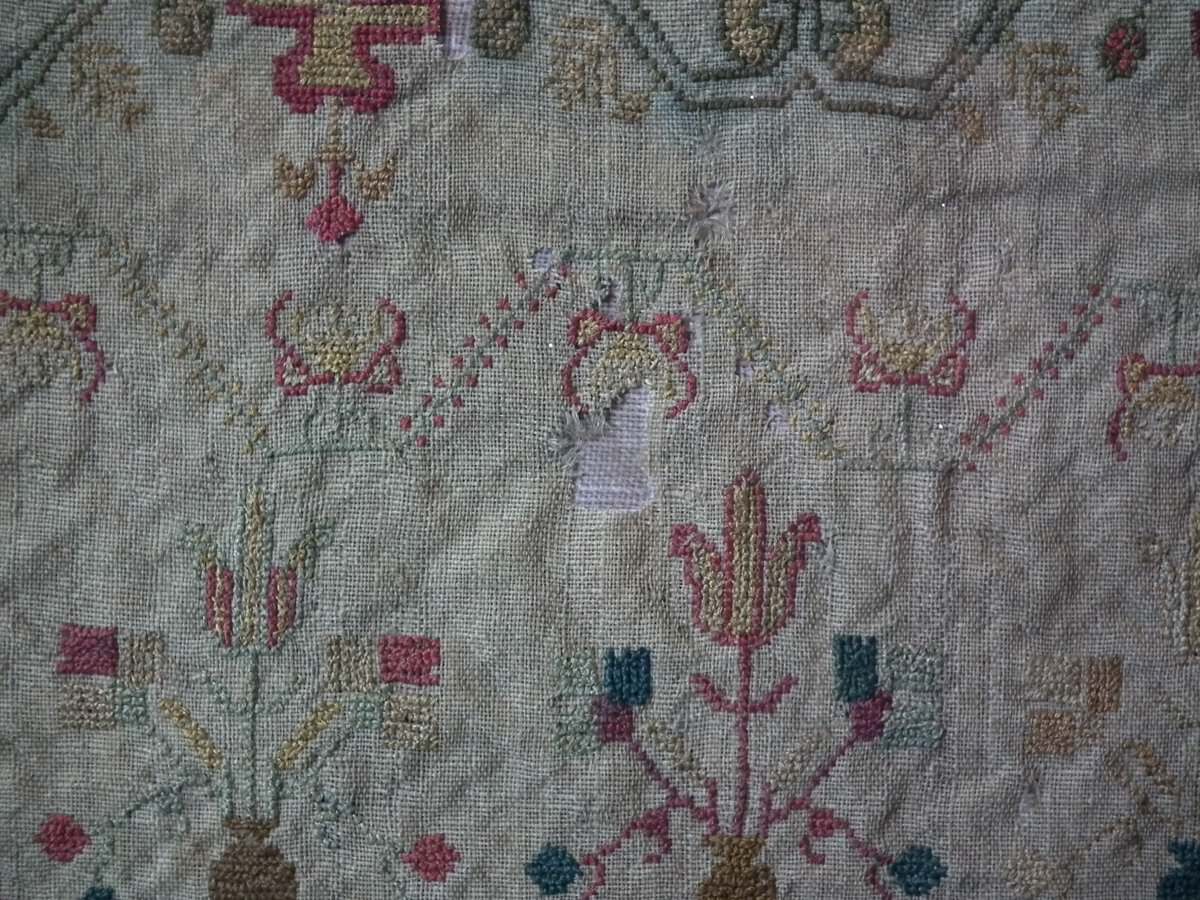 The sampler is worked in silk on linen ground, in a variety of stitches.