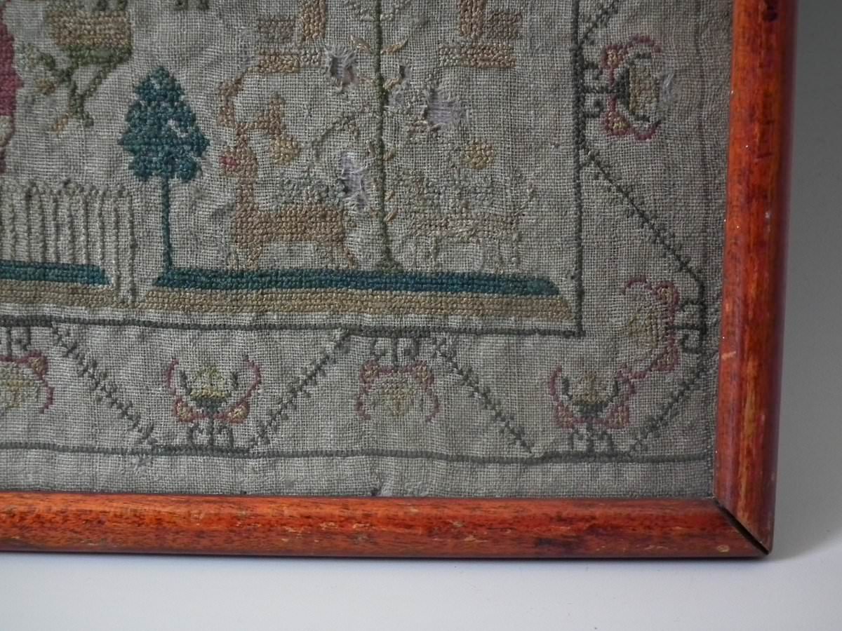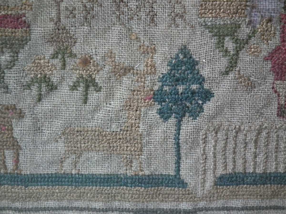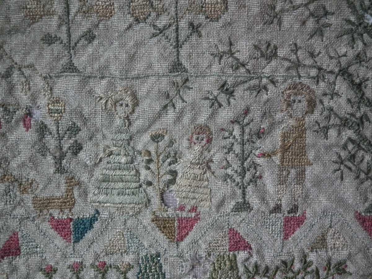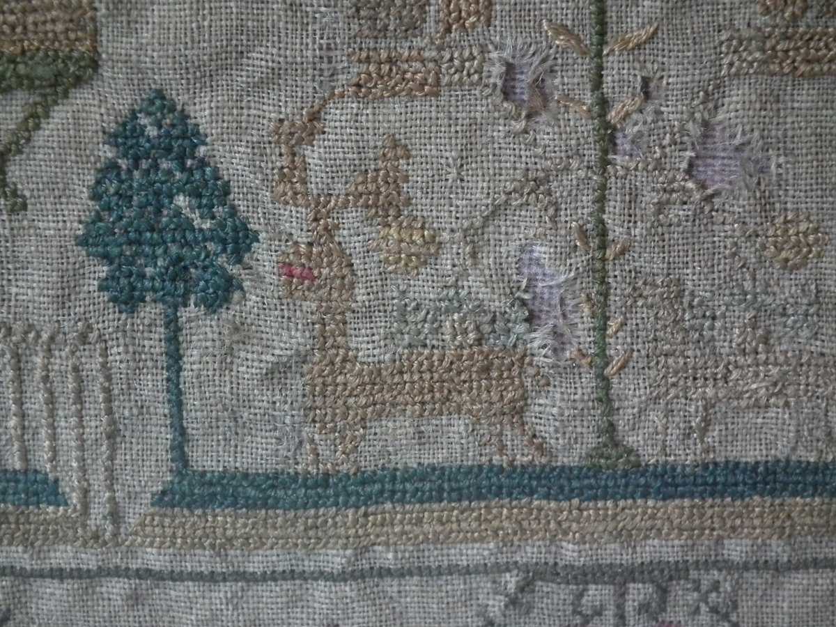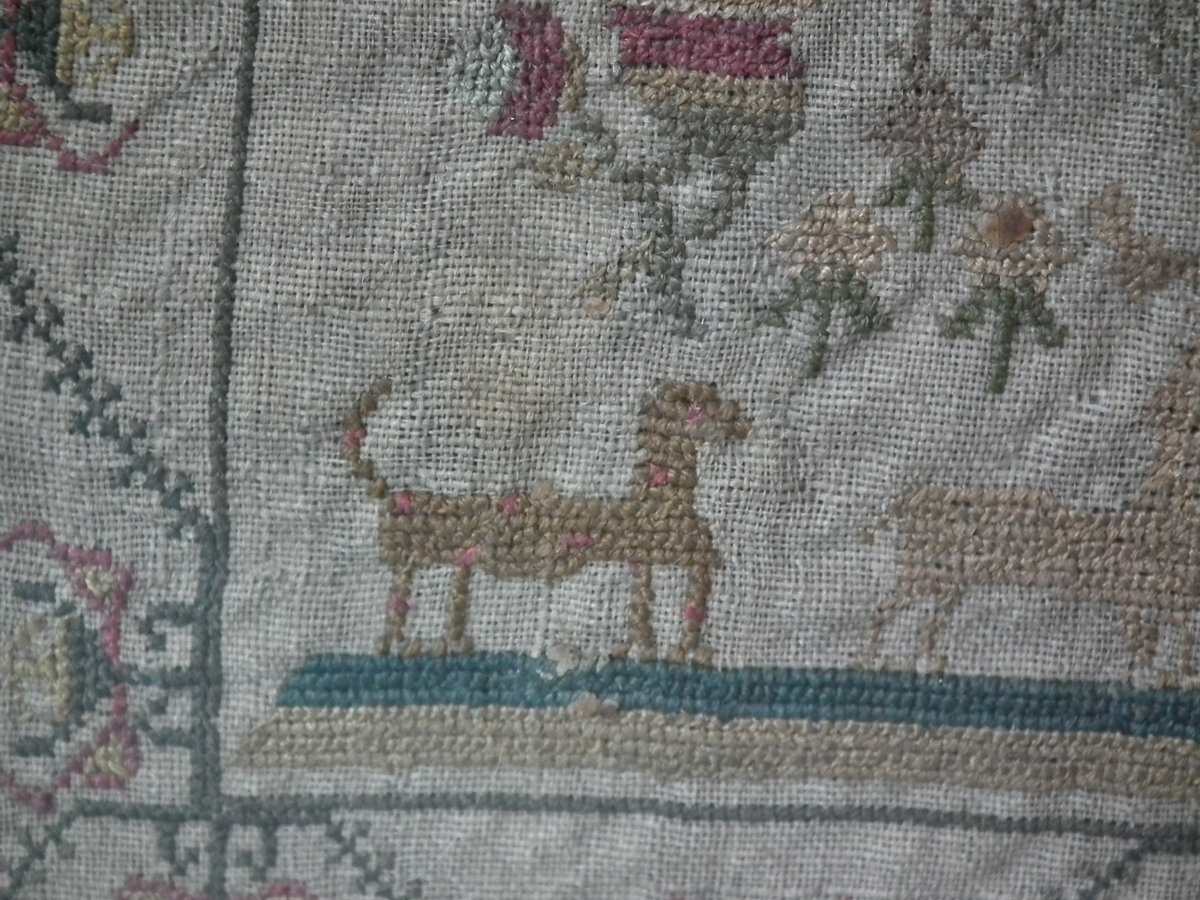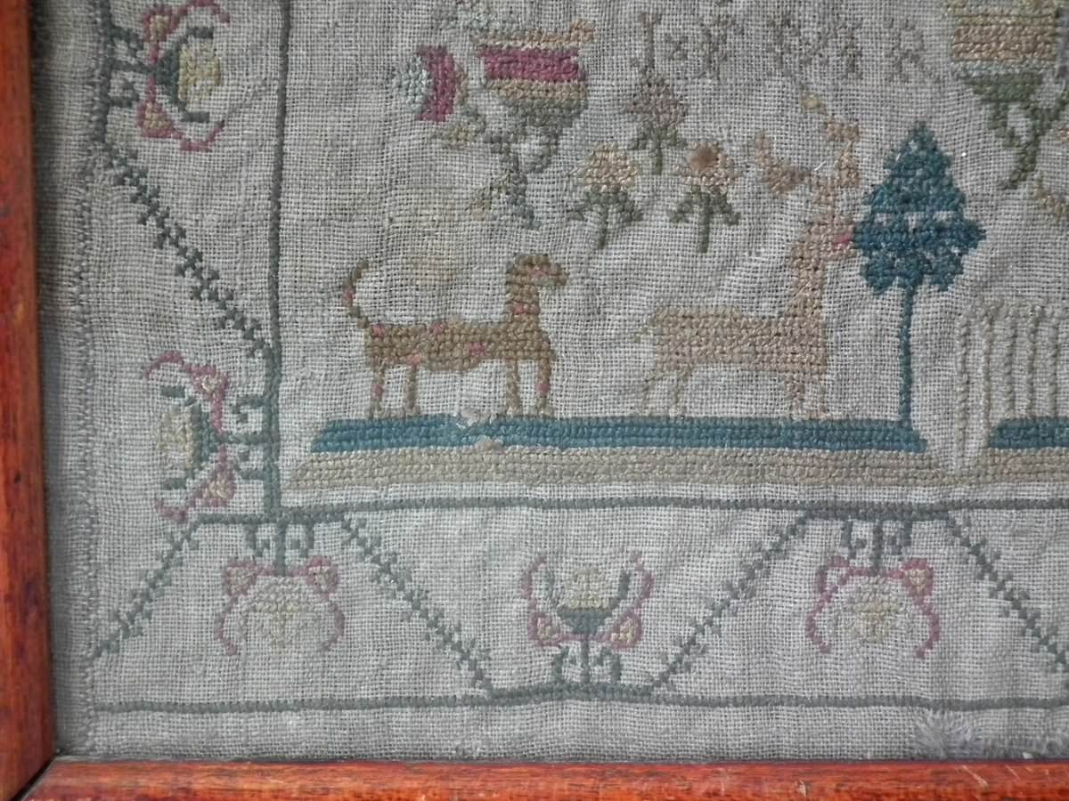 The sampler is worked in silk on linen ground, in a variety of stitches.