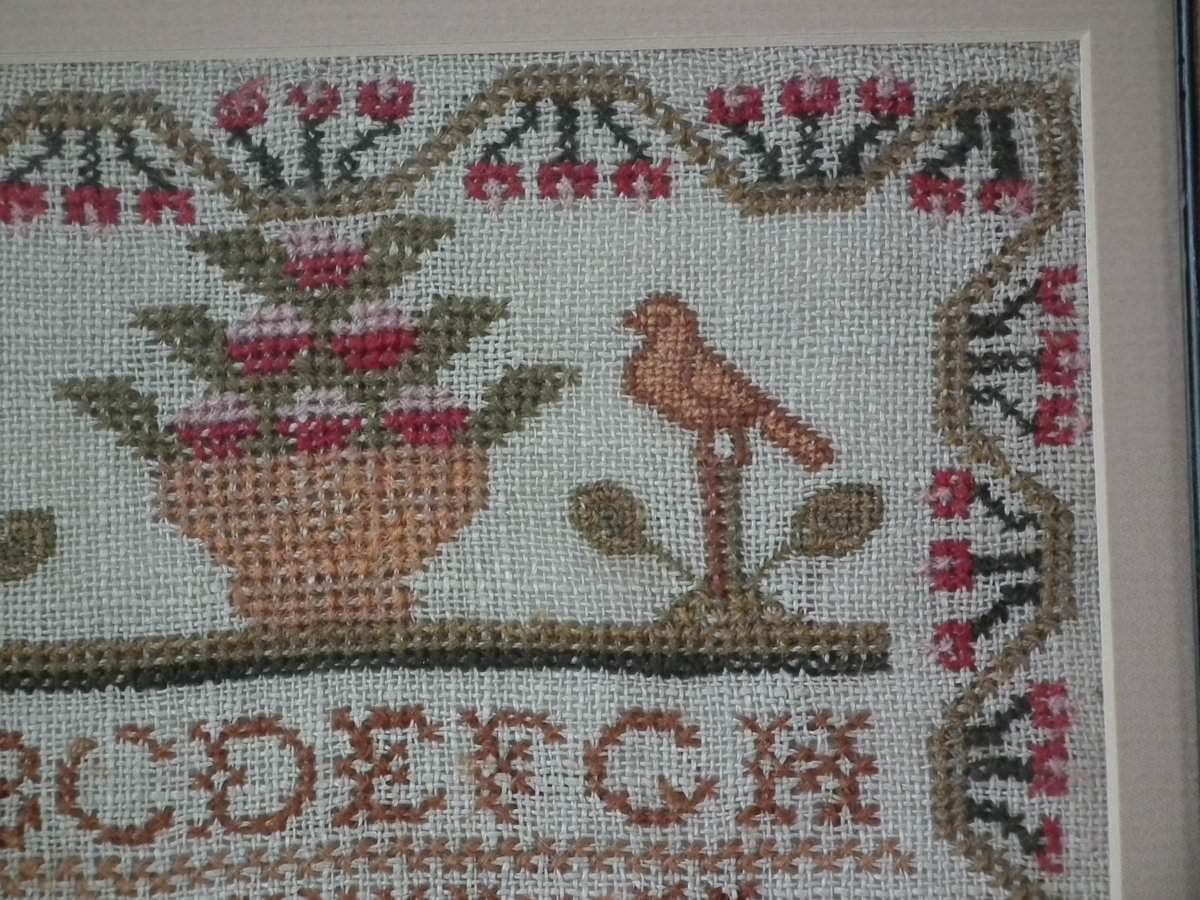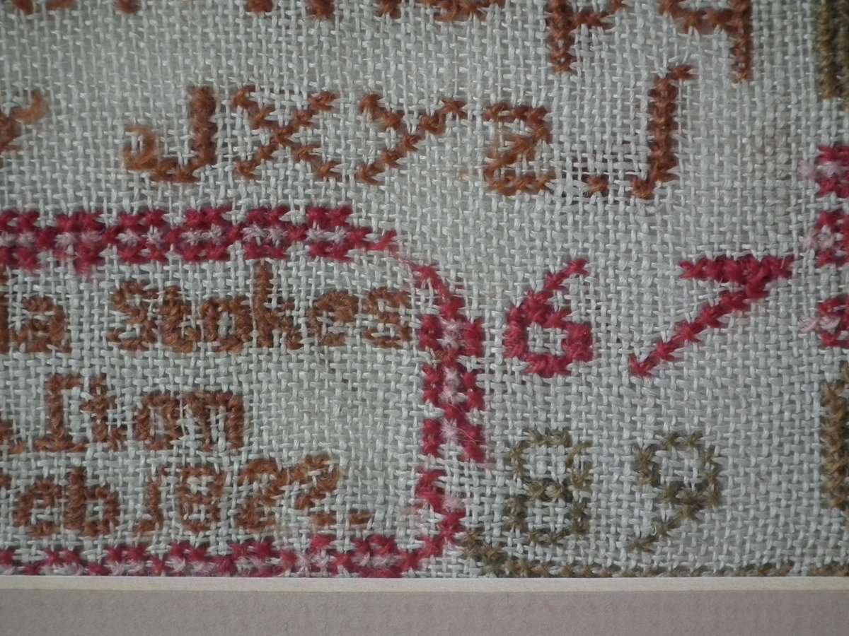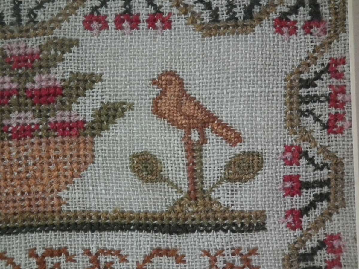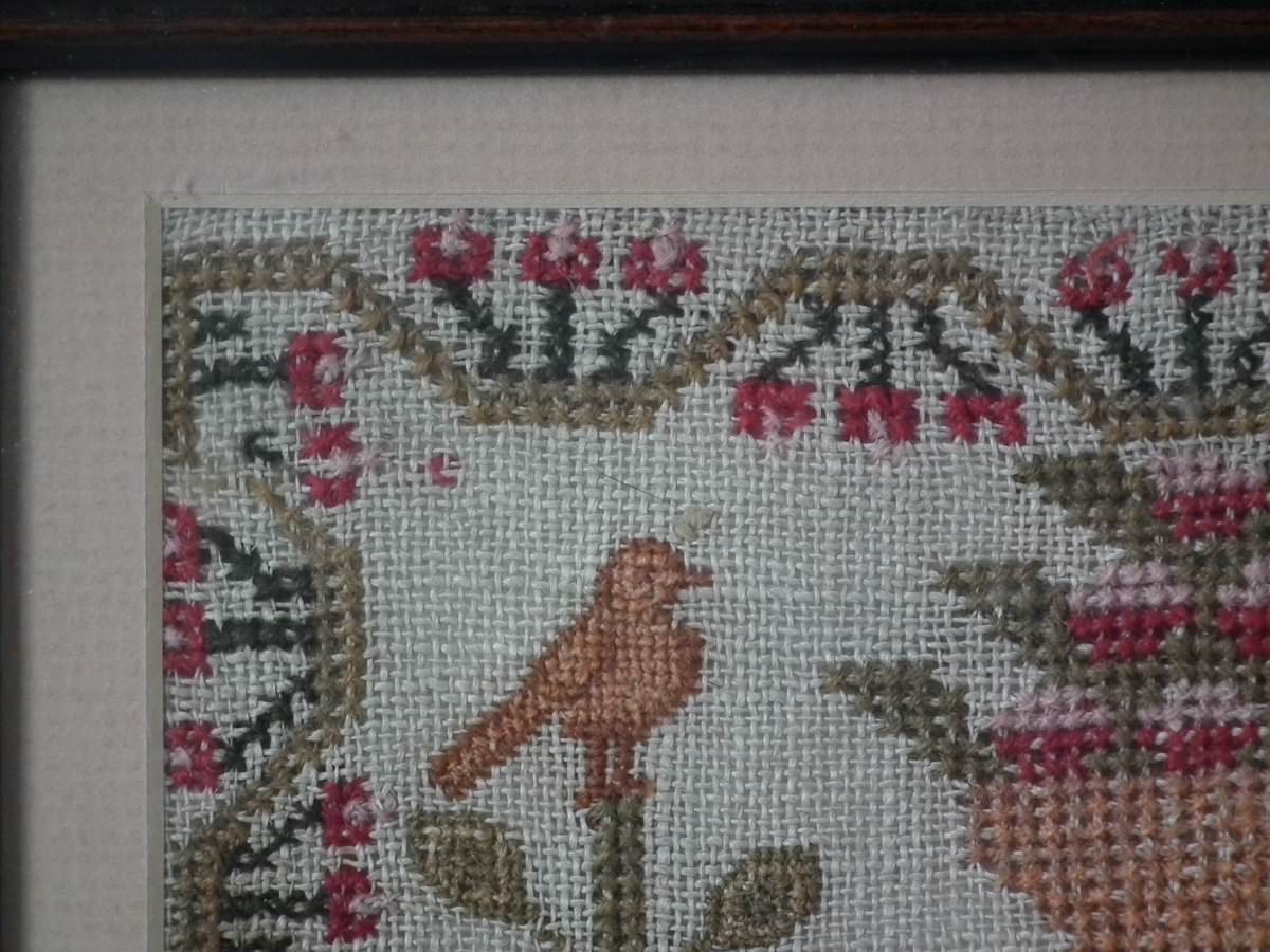 The sampler is worked in wool on canvas ground, in cross stitch throughout.