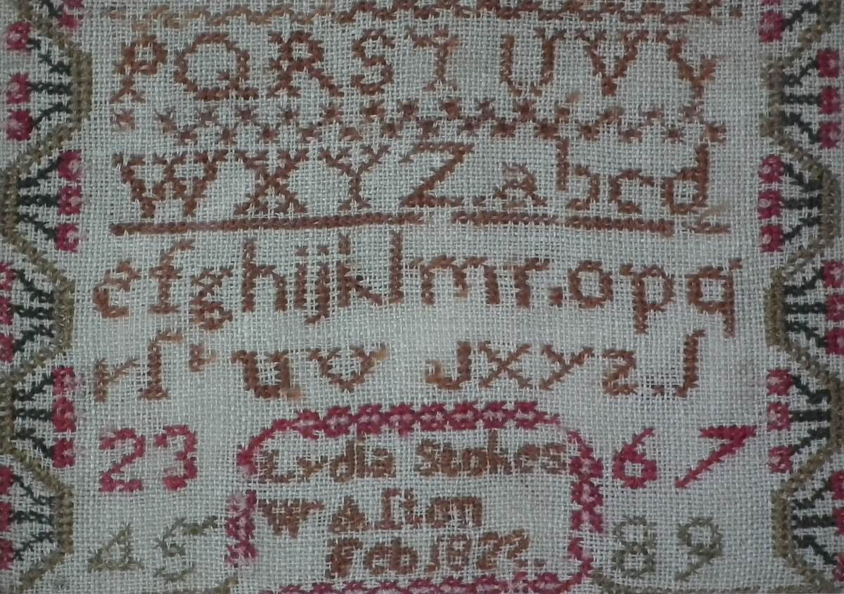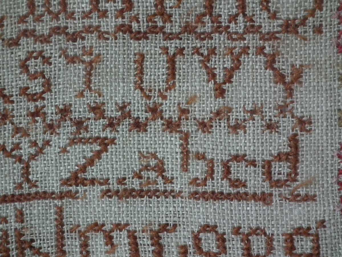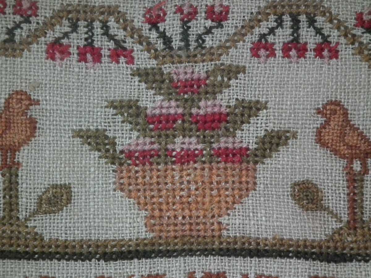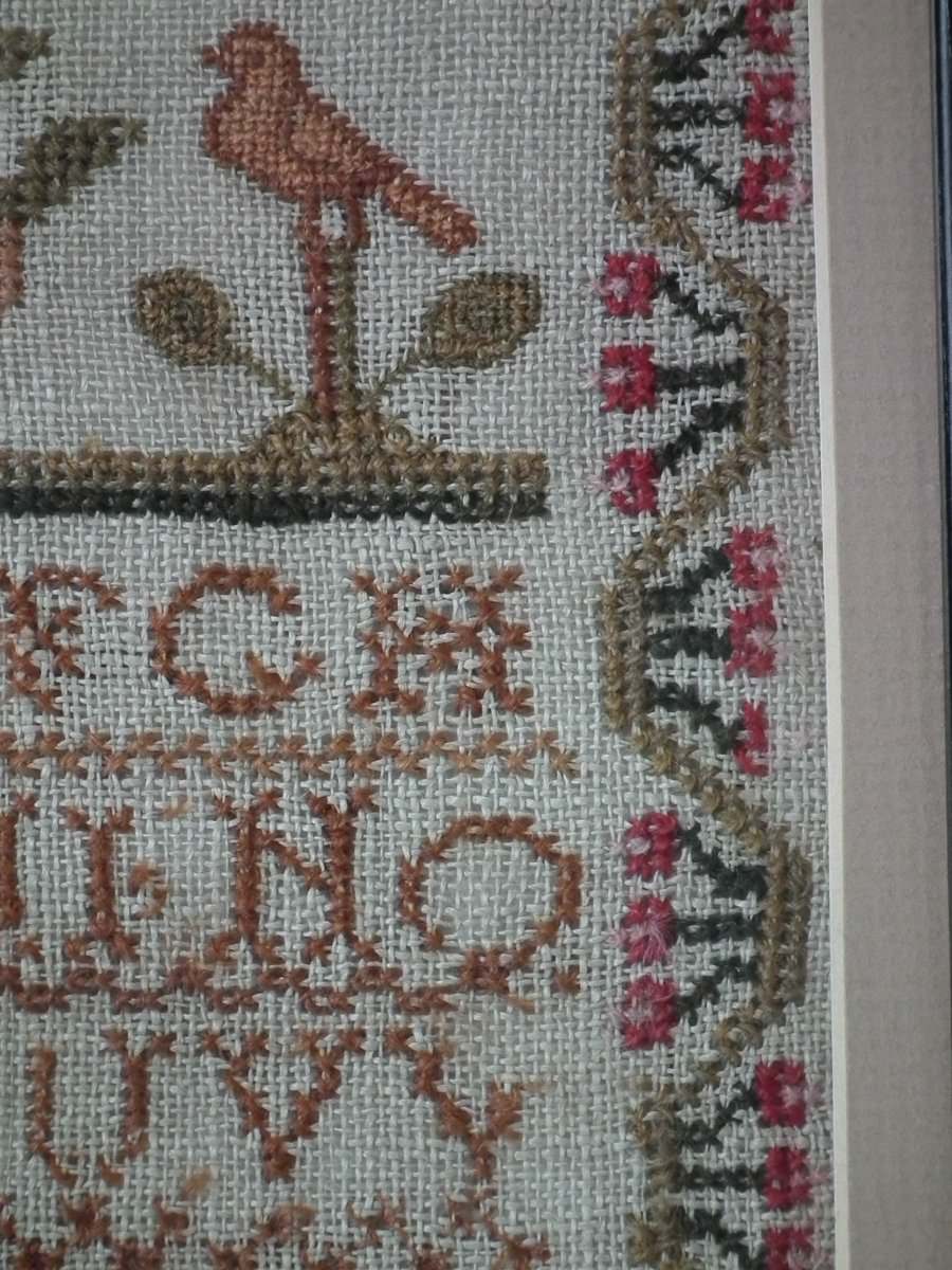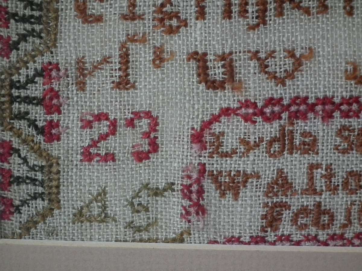 The sampler is worked in wool on canvas ground, in cross stitch throughout.