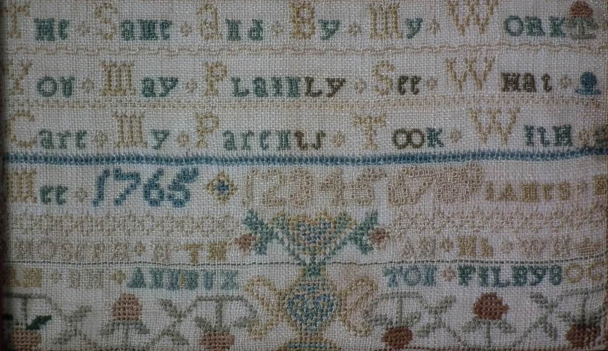 George III, dated 1765. 10.2ins high, 7.9ins wide, 0.4ins deep. 1765 Norfolk Sampler by Hannah Humphrey.