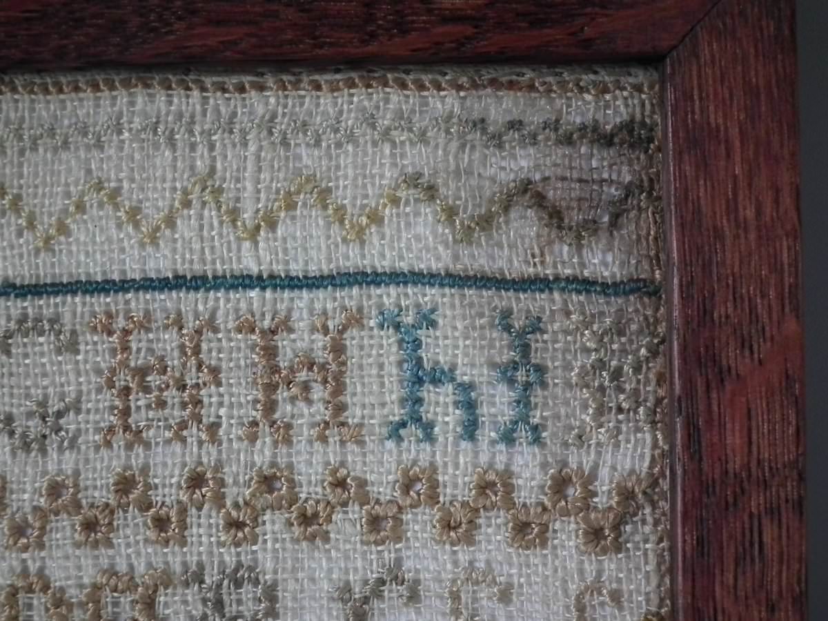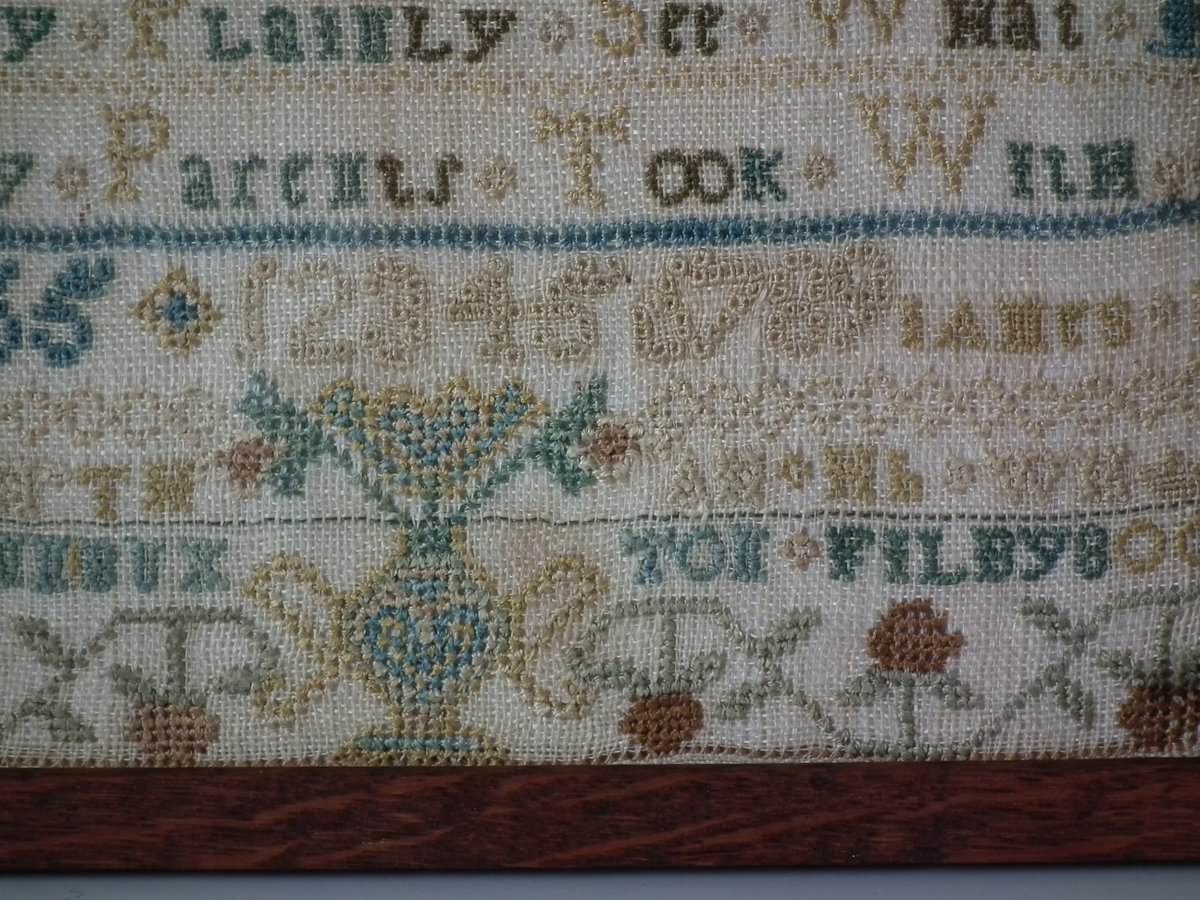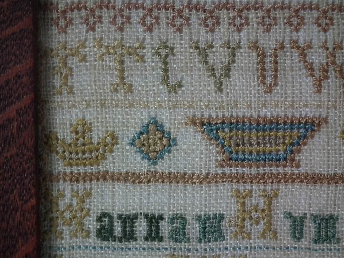 The sampler is worked in silk on canvas ground, in cross stitch and Algerian eye.