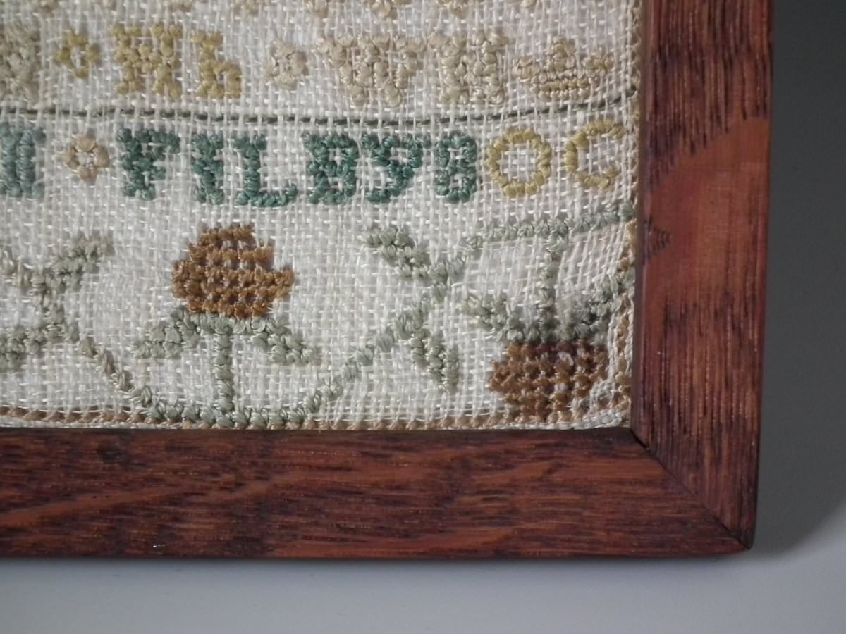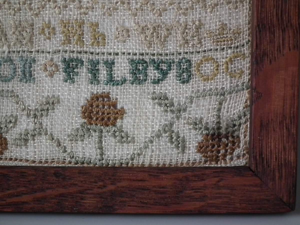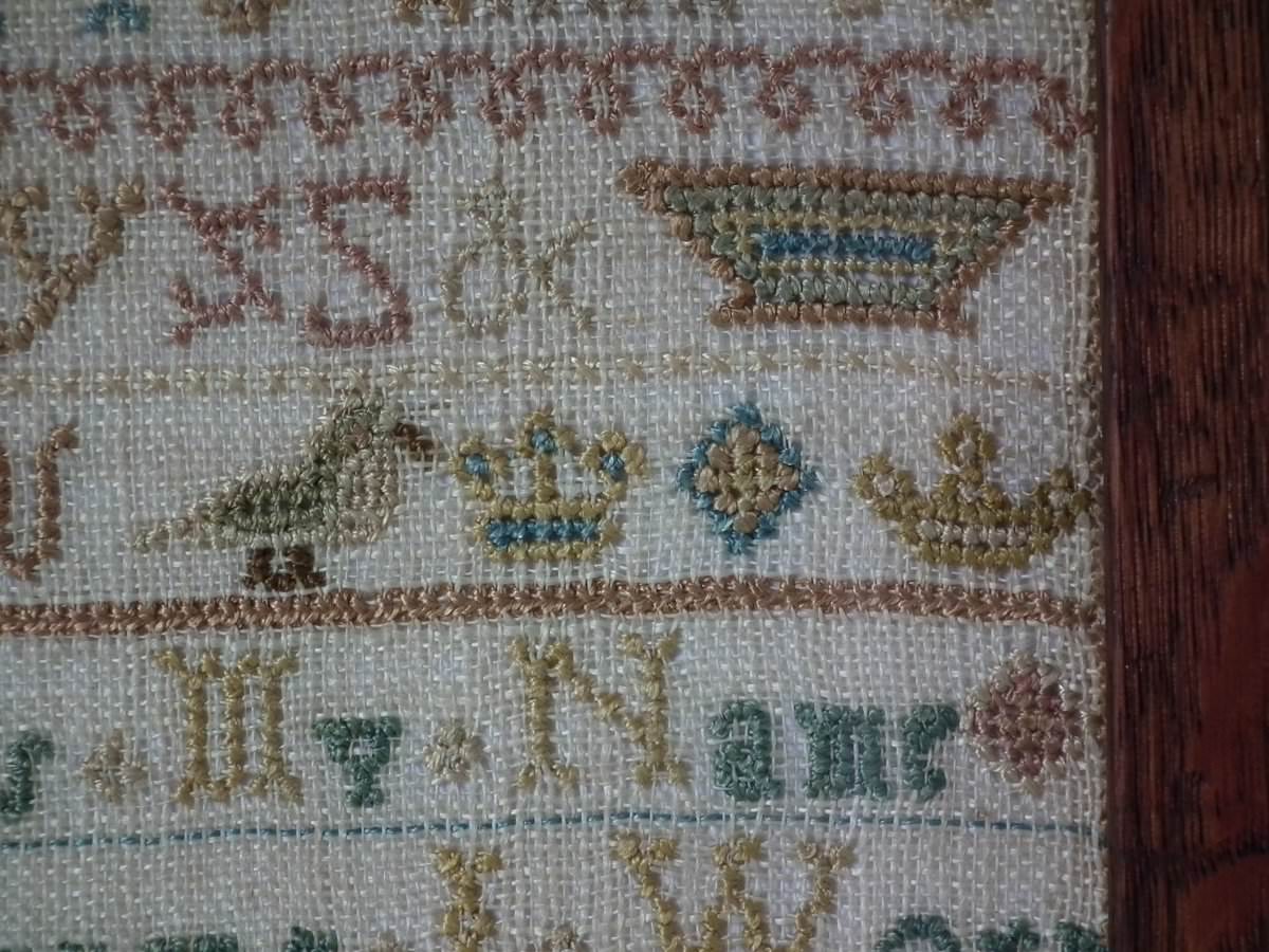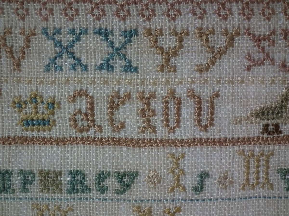 The sampler is worked in silk on canvas ground, in cross stitch and Algerian eye.