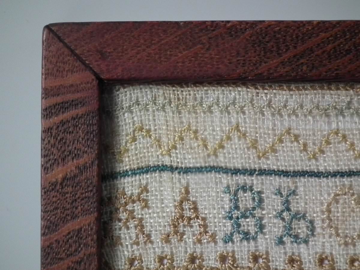 Framed in a wood frame with glass. Mounting: The sampler is tacked to board.