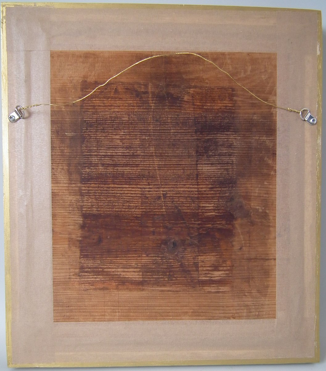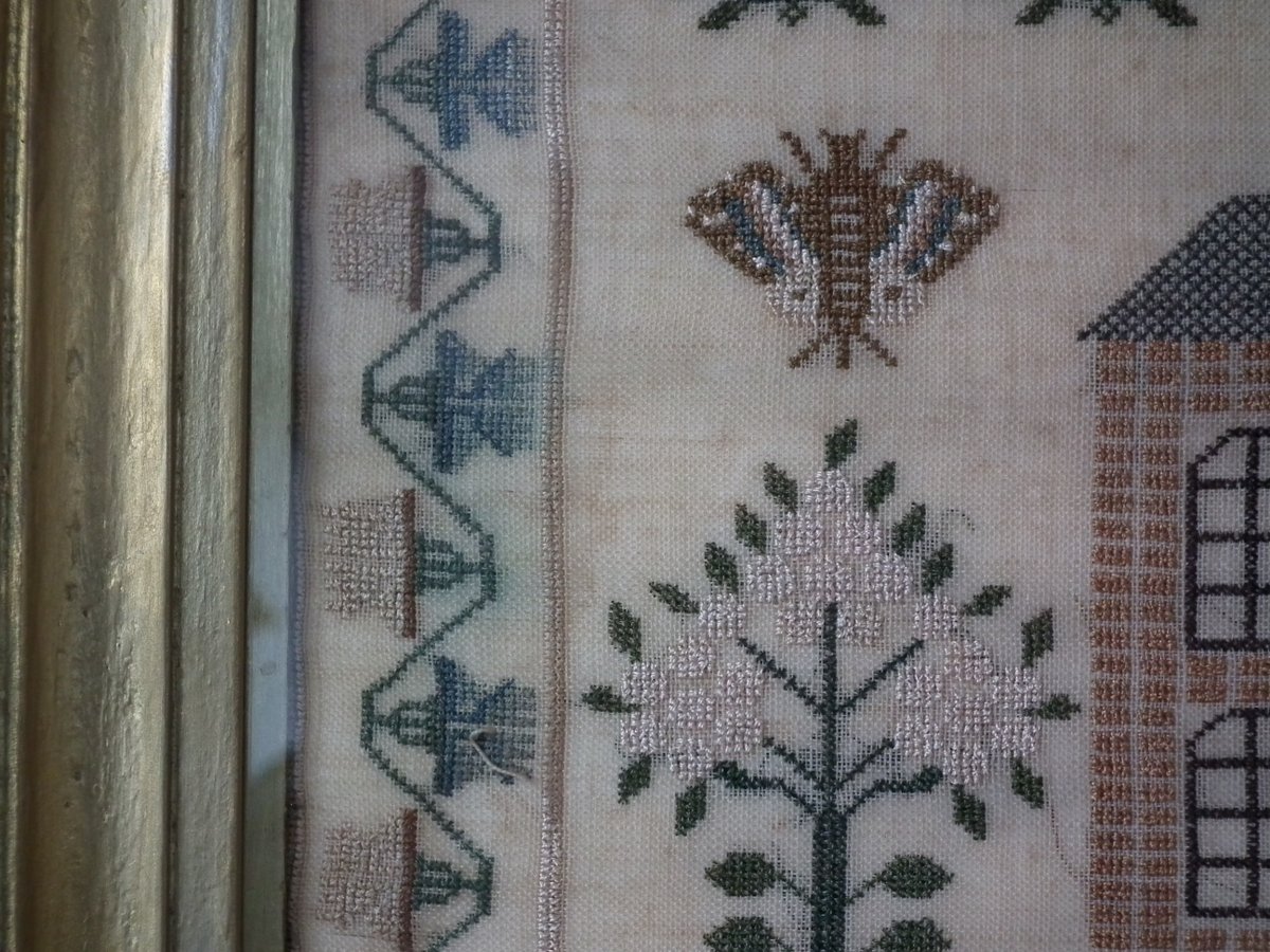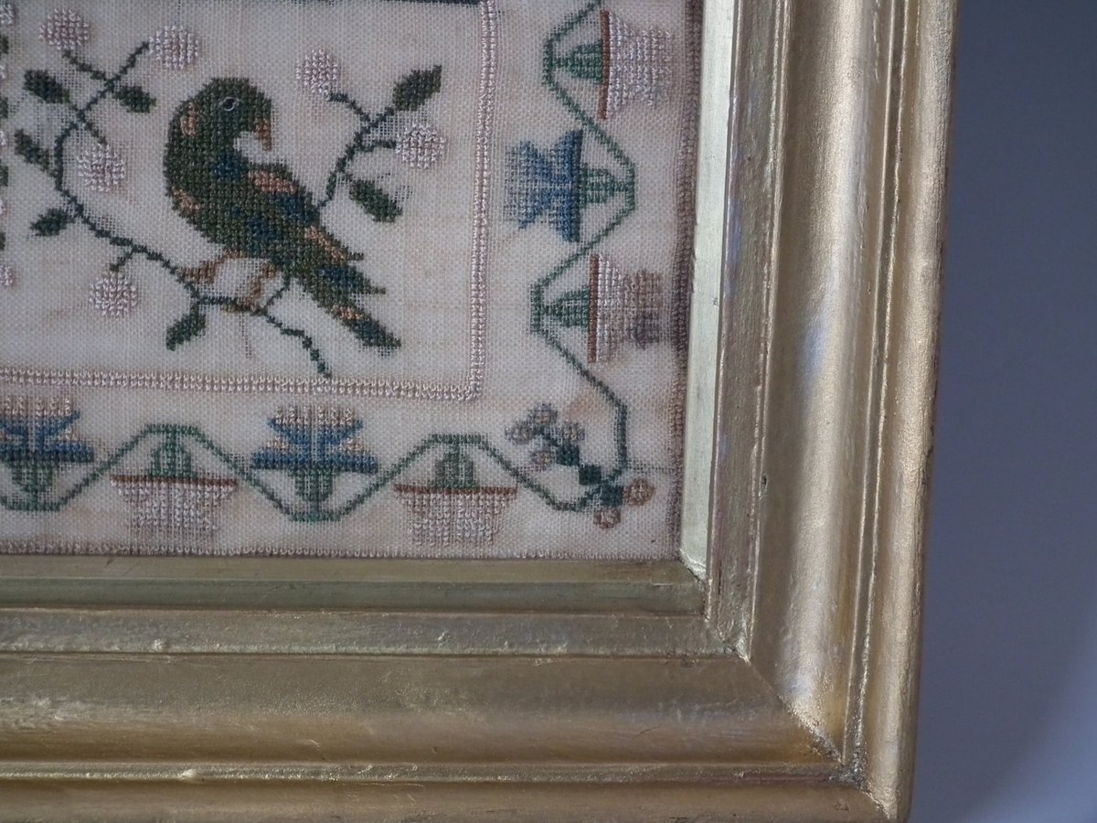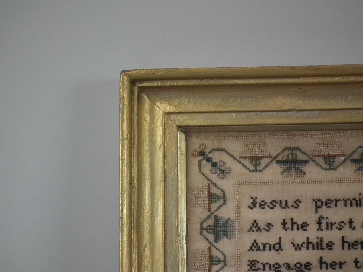 Framed in an old wood frame with gilt slip and glass. Mounting: The sampler is tacked onto a wooden stretcher frame with card backing. Frame backed with wood.
