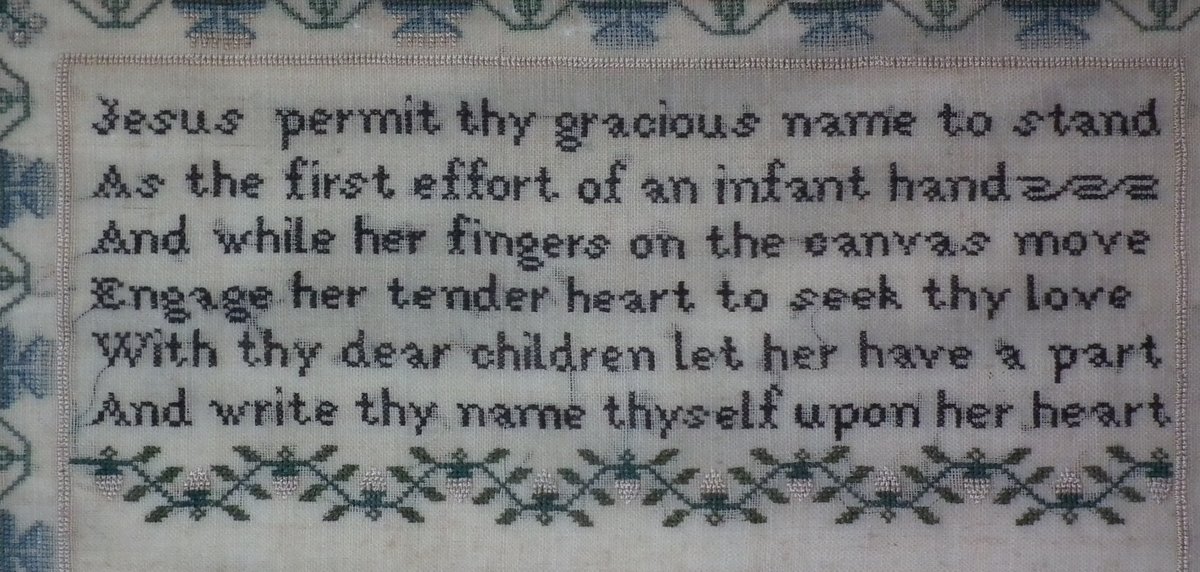 The sampler is worked in silk on linen ground, in cross stitch throughout. Meandering floral border. Colours black, blue, green, brown and white.