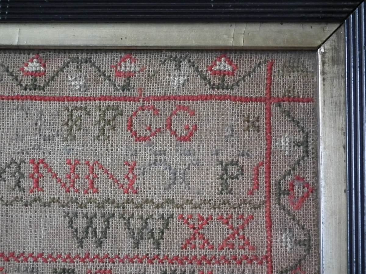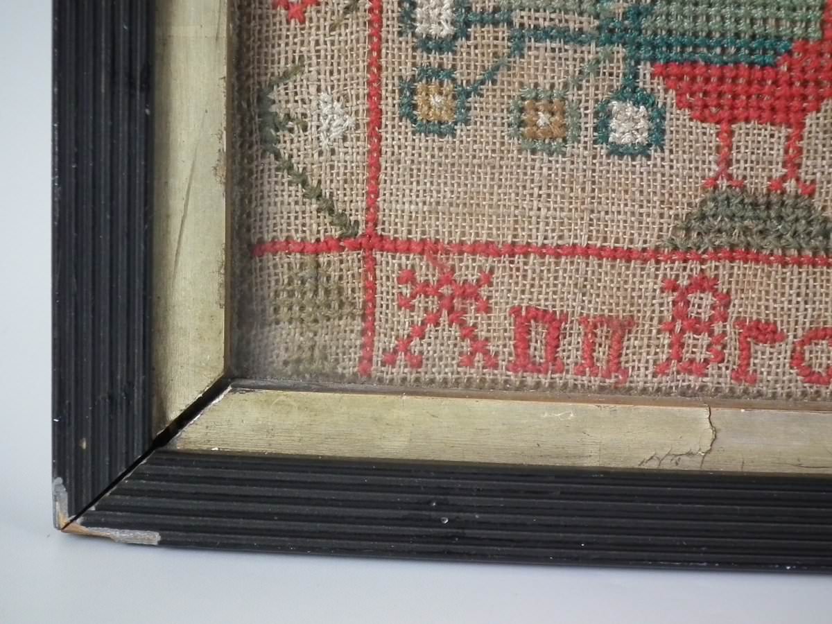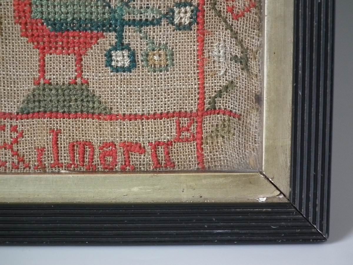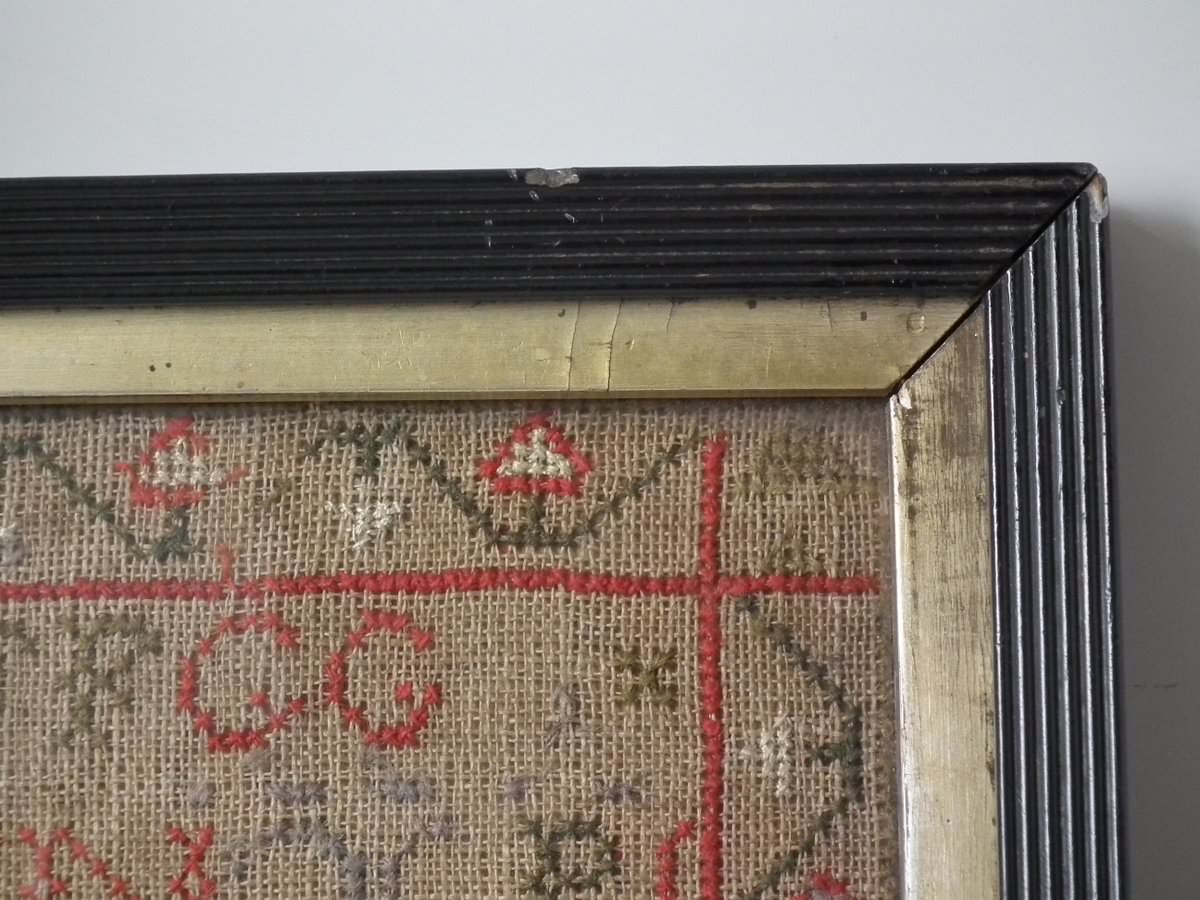Framed in an old, black, ebonised wood frame with gilt slip and glass. Mounting: The sampler is fixed to card. Frame backed with wood.