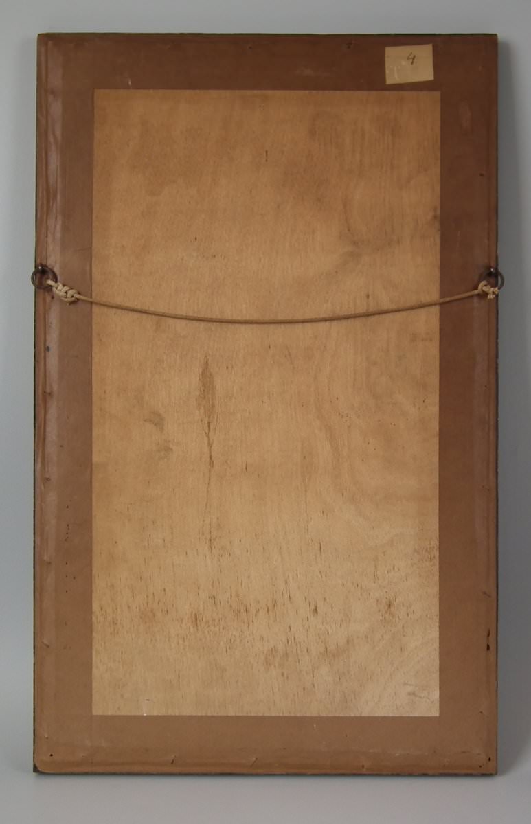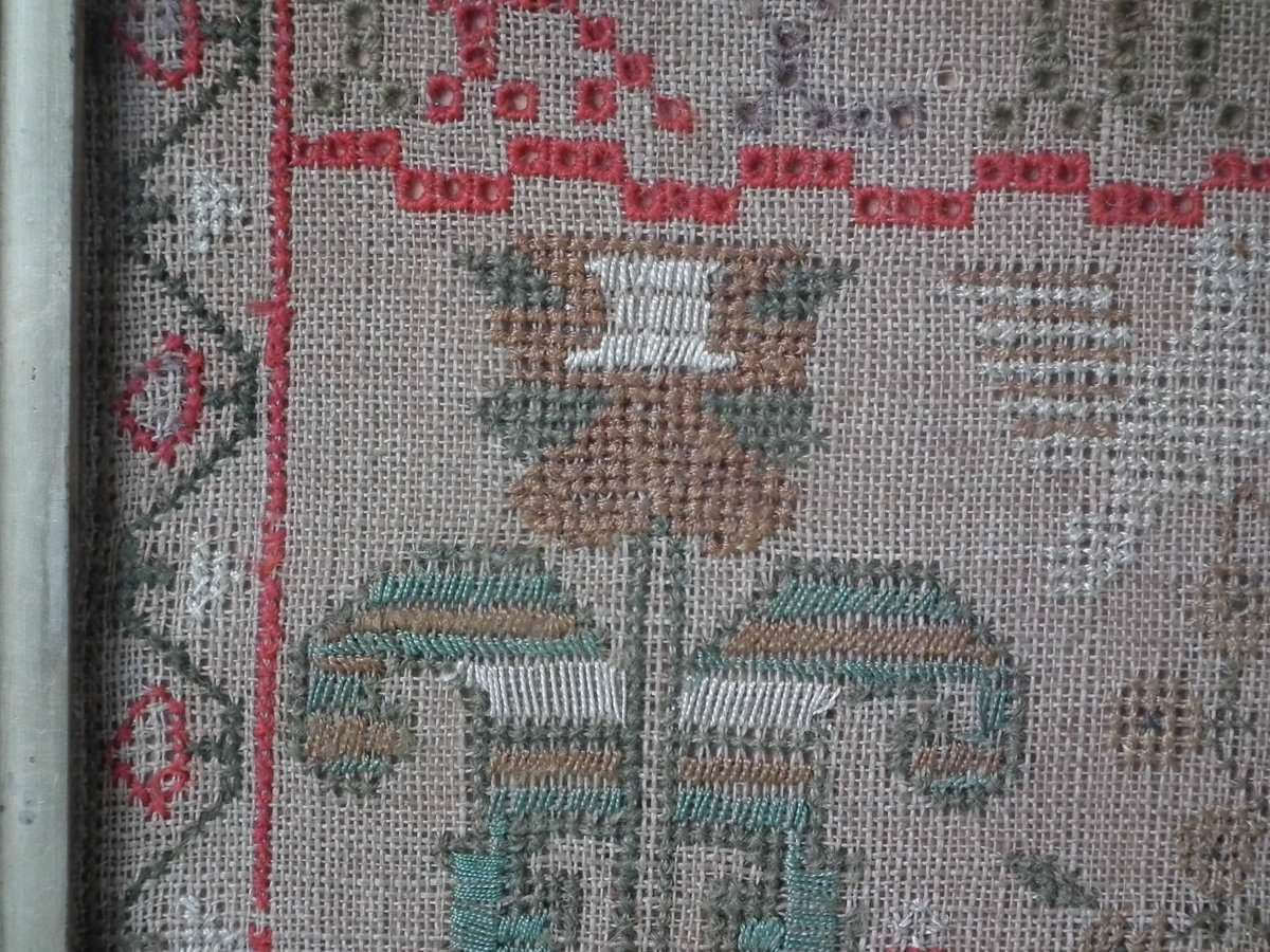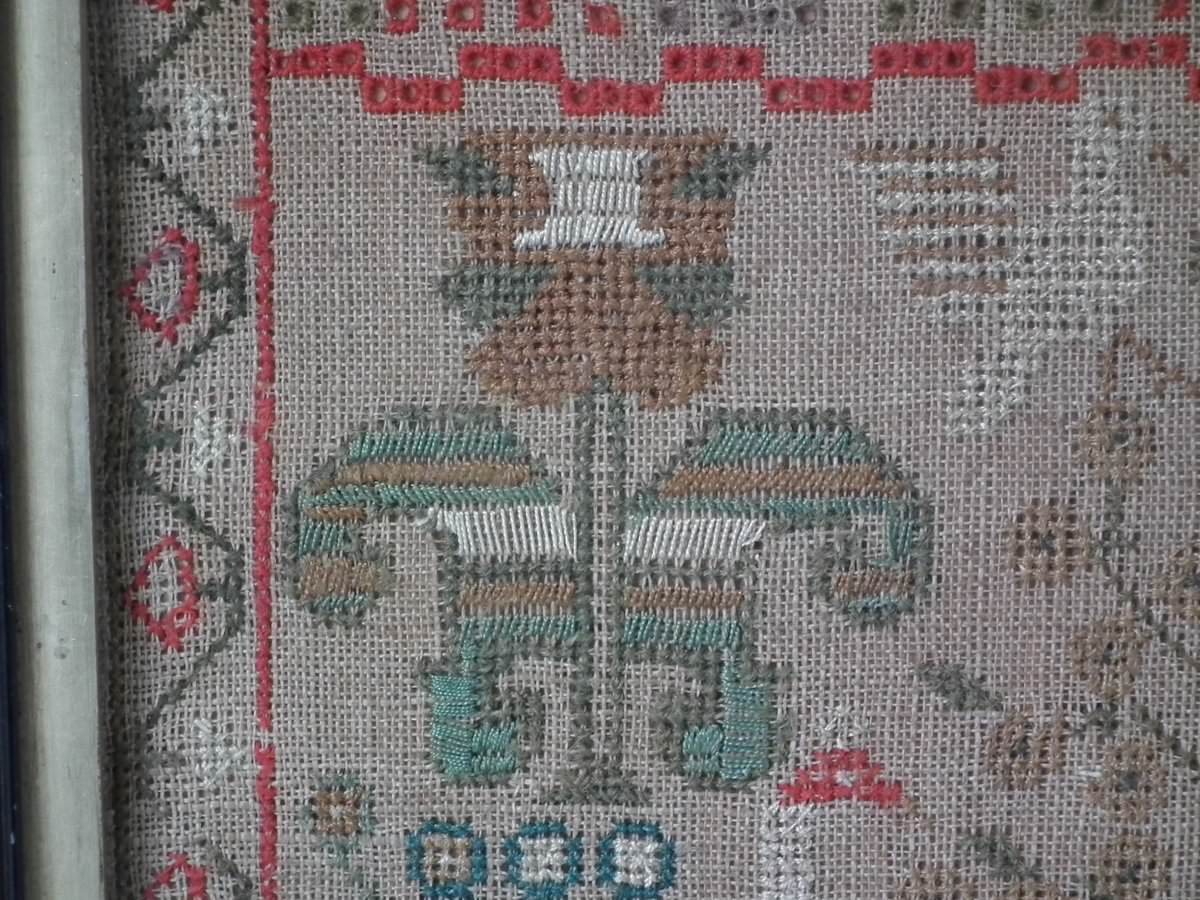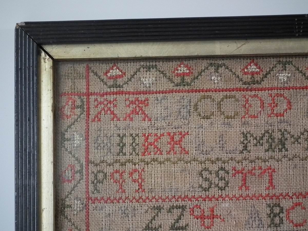 Framed in an old, black, ebonised wood frame with gilt slip and glass. Mounting: The sampler is fixed to card. Frame backed with wood.