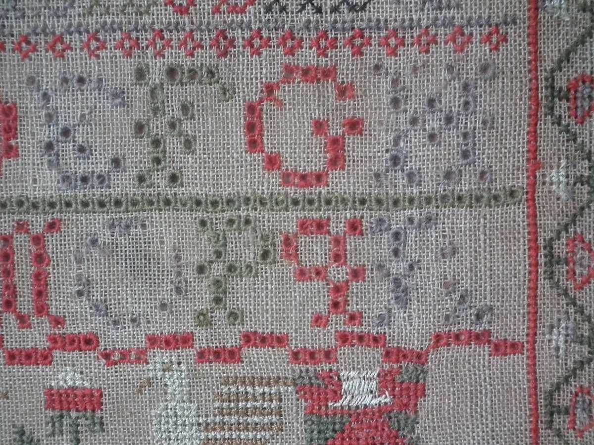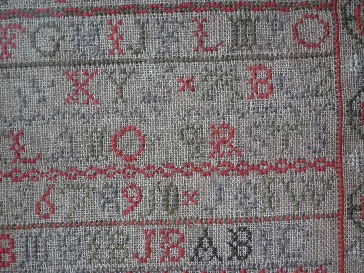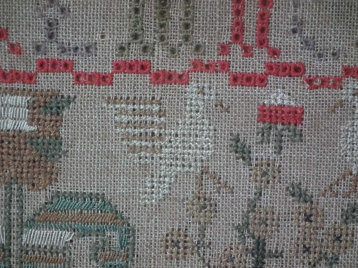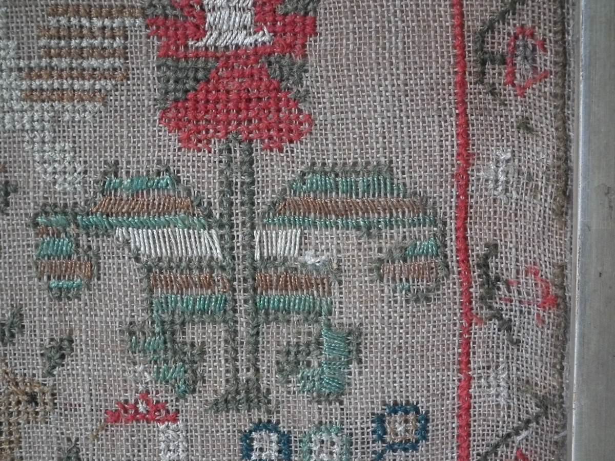 The sampler is worked in fine wool and cotton on a canvas ground, in a variety of stitches including Algerian eye.