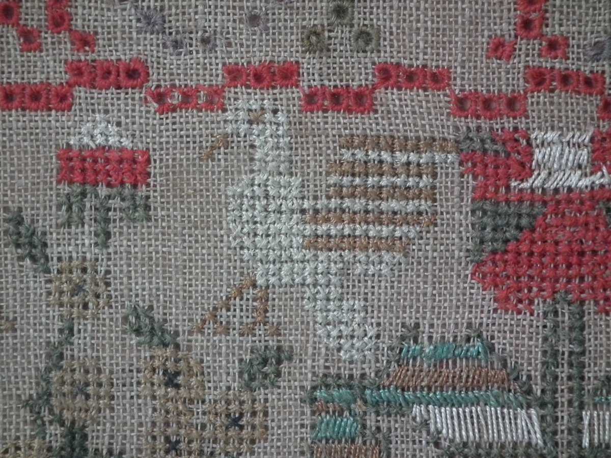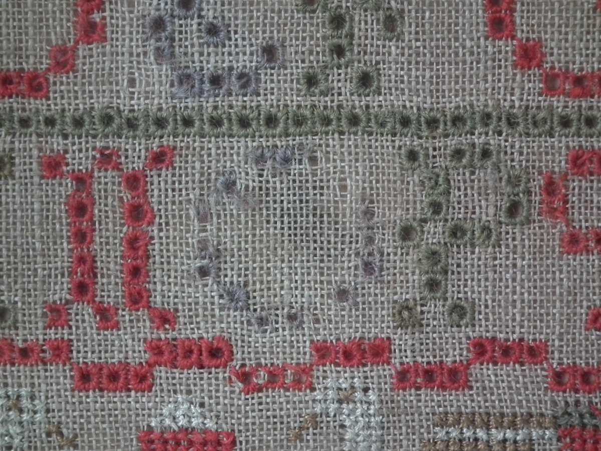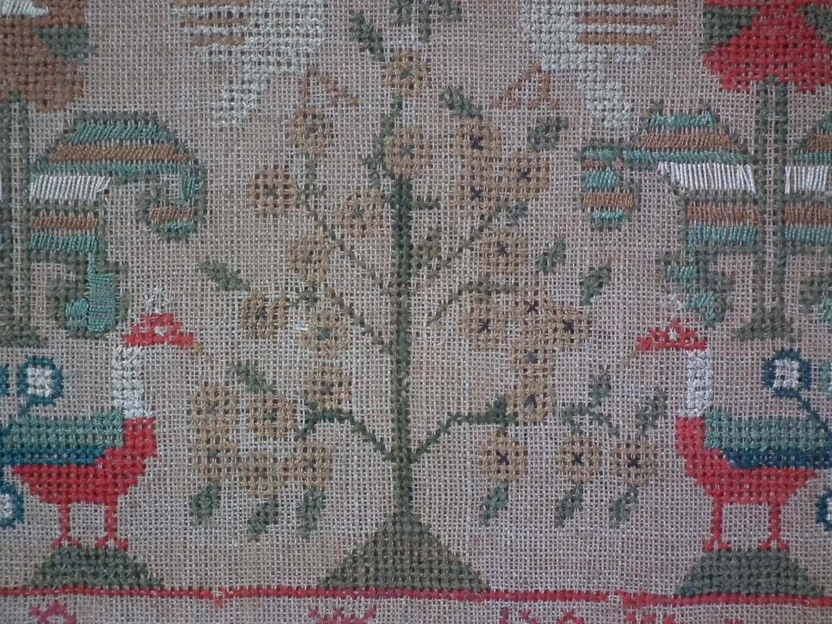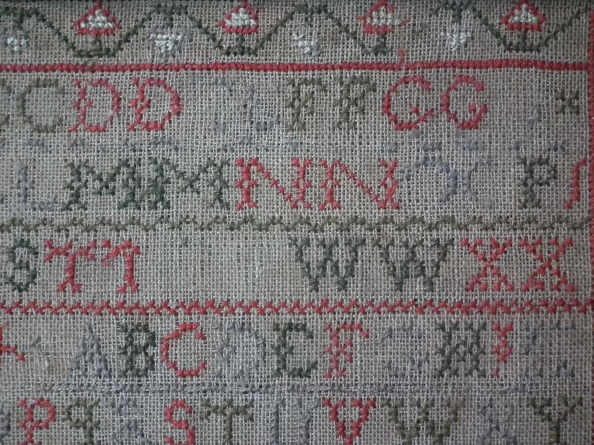 The sampler is worked in fine wool and cotton on a canvas ground, in a variety of stitches including Algerian eye.
