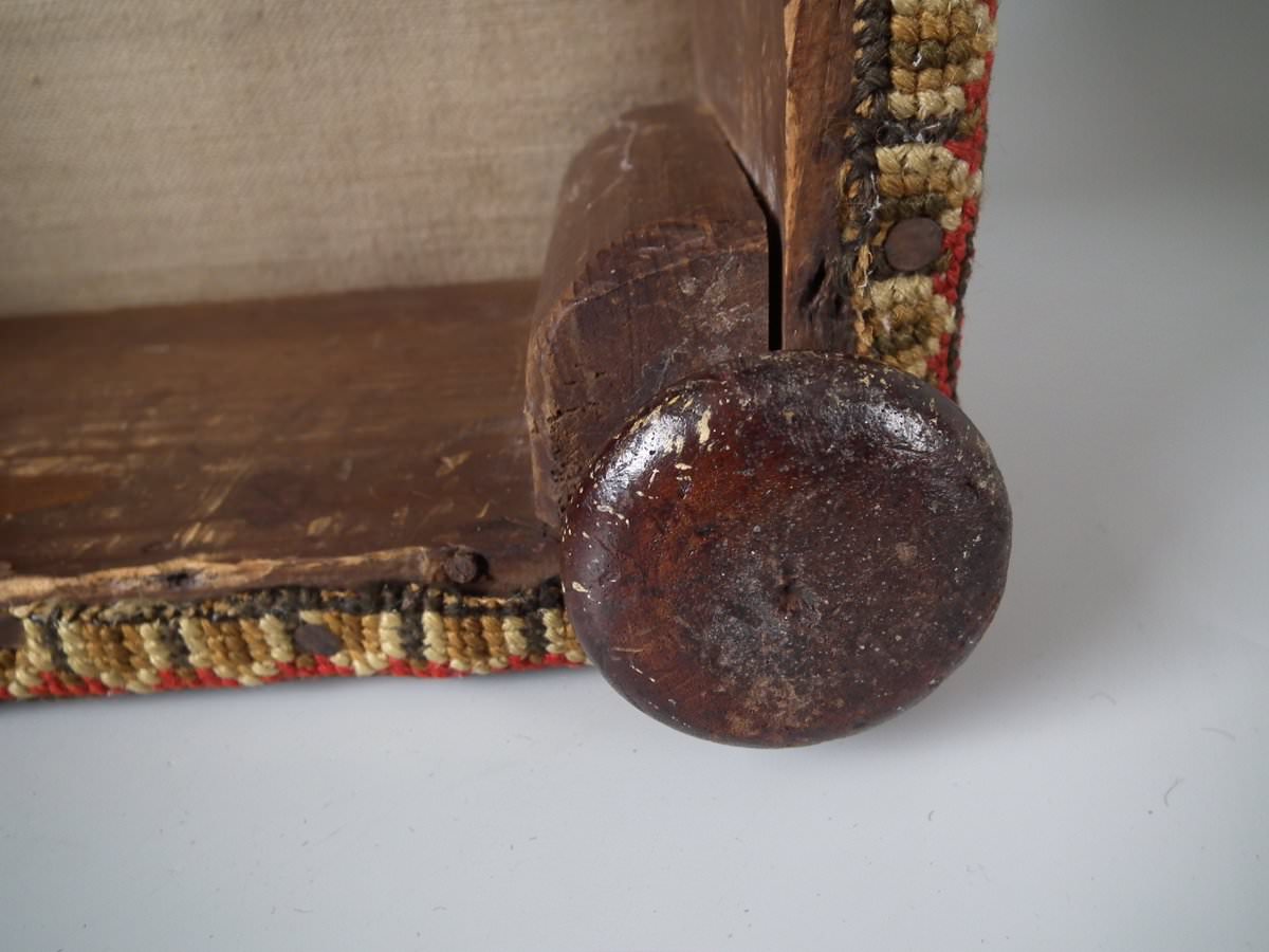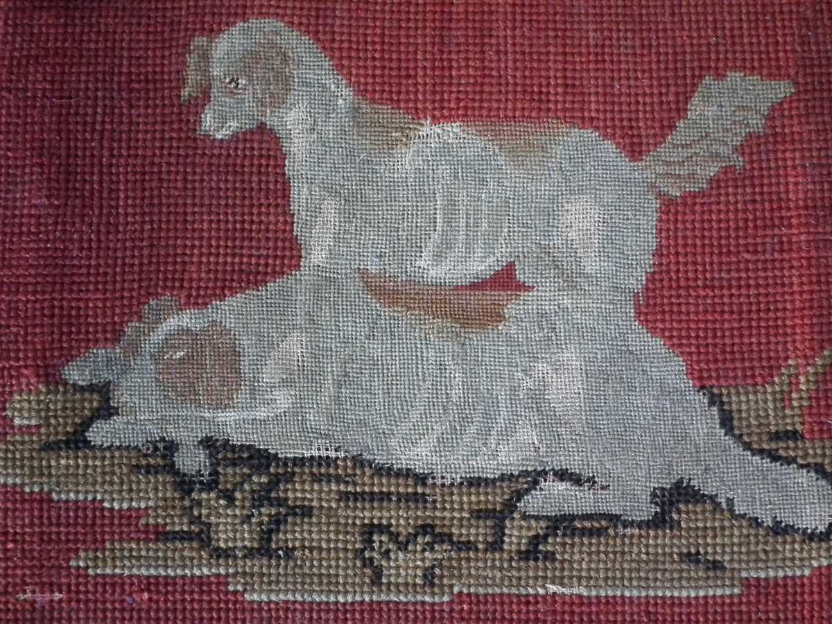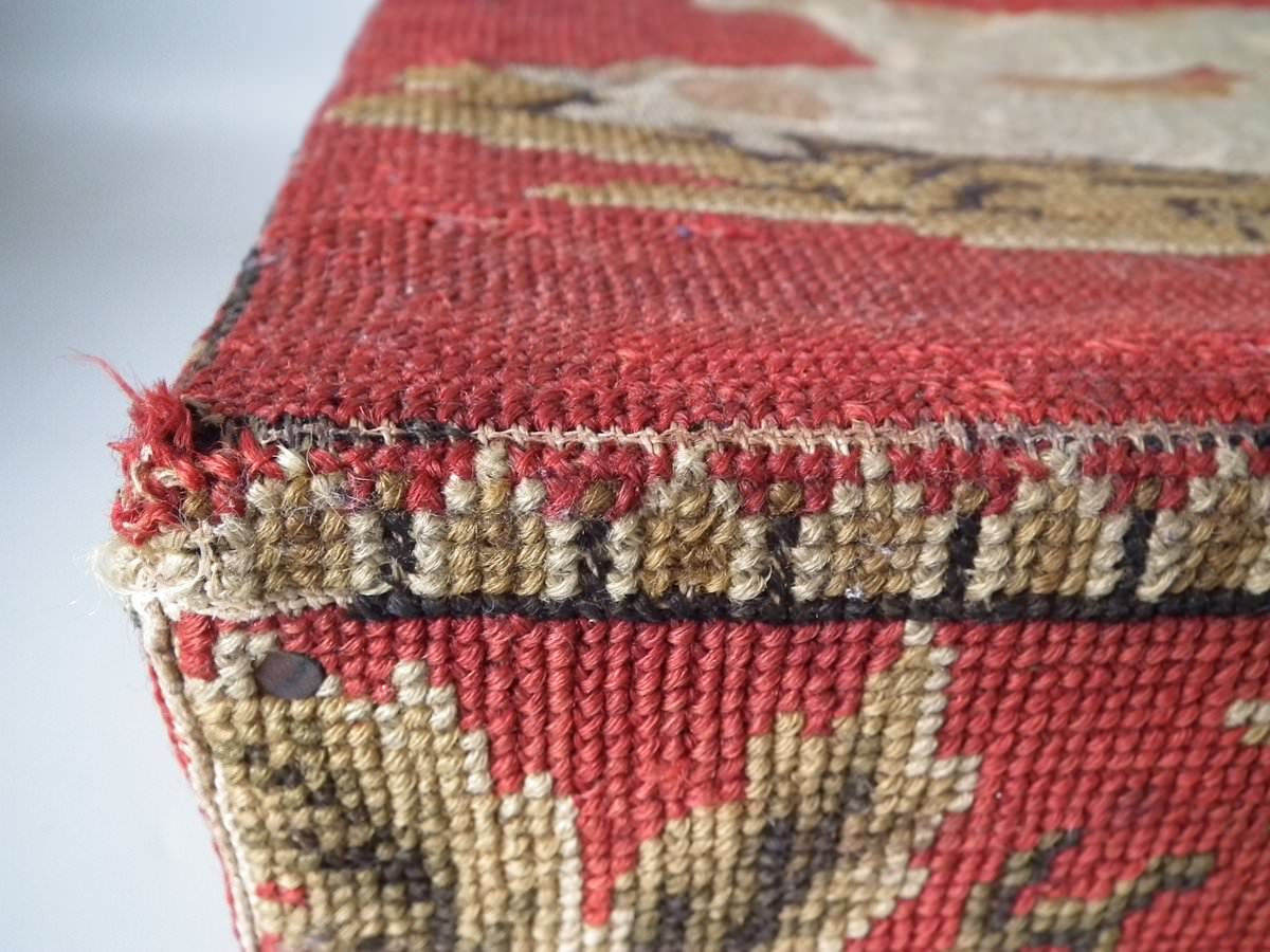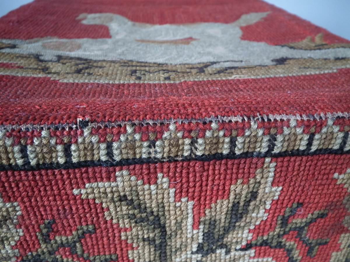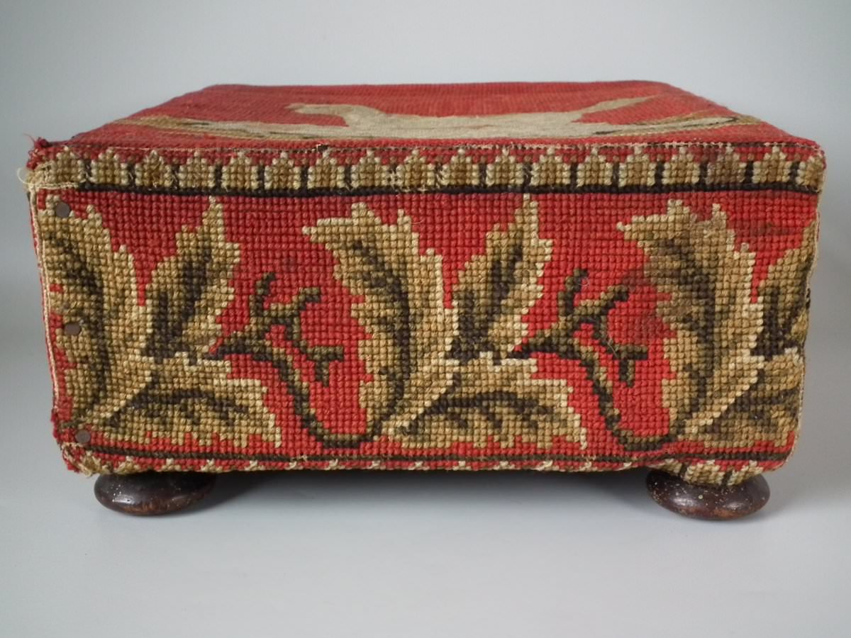 Victorian, circa 1870. 6.3ins high, 12.6ins wide, 13.4ins deep. Victorian Footstool with Embroidered Picture of Dogs Upholstery. The stitchwork is in wool on a canvas ground.