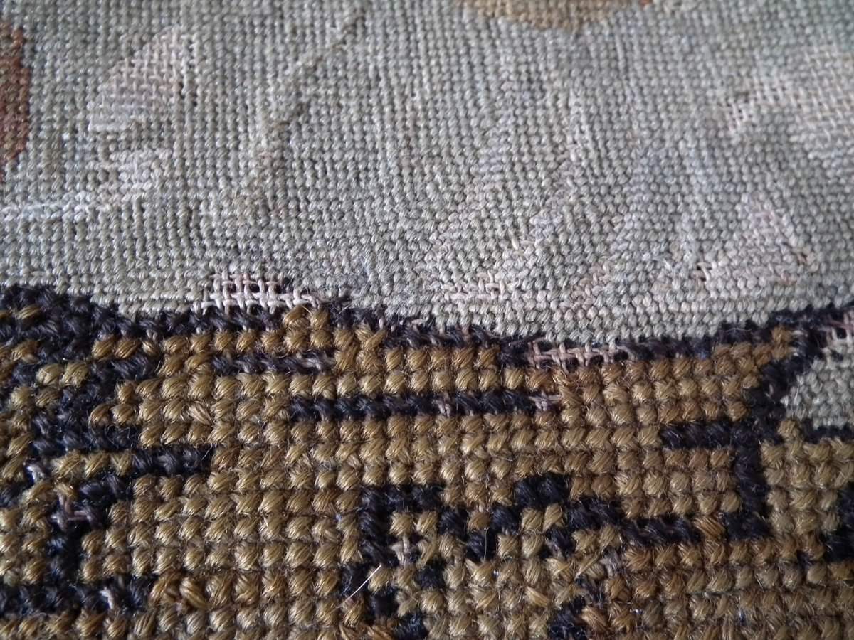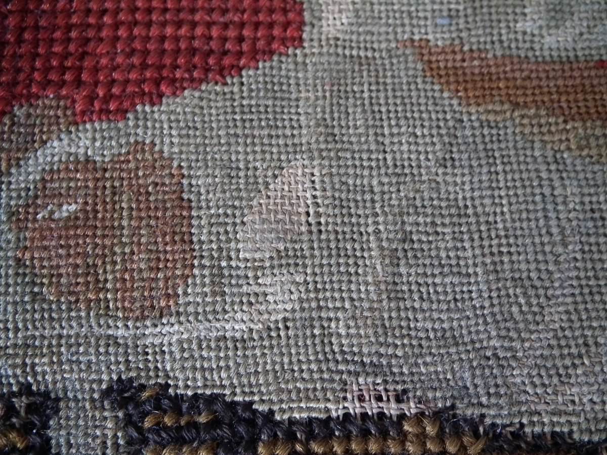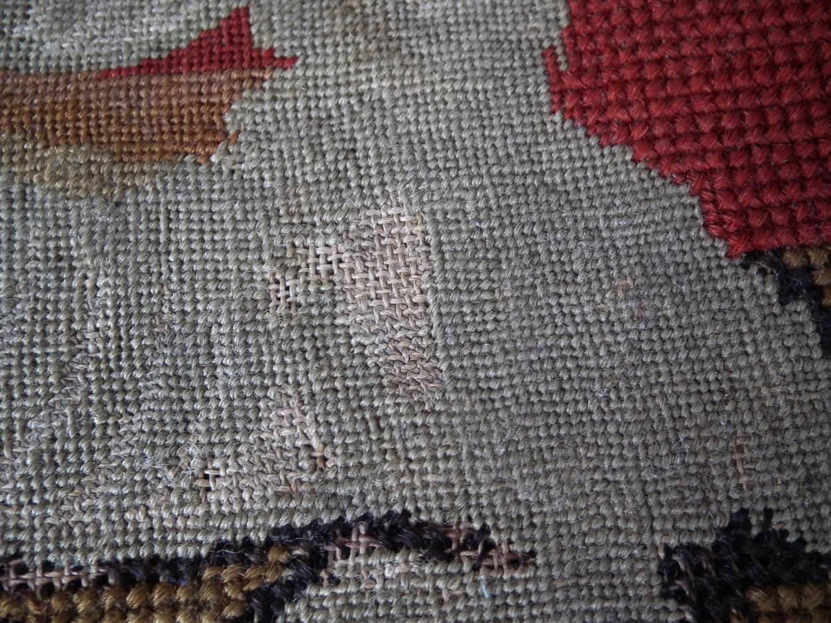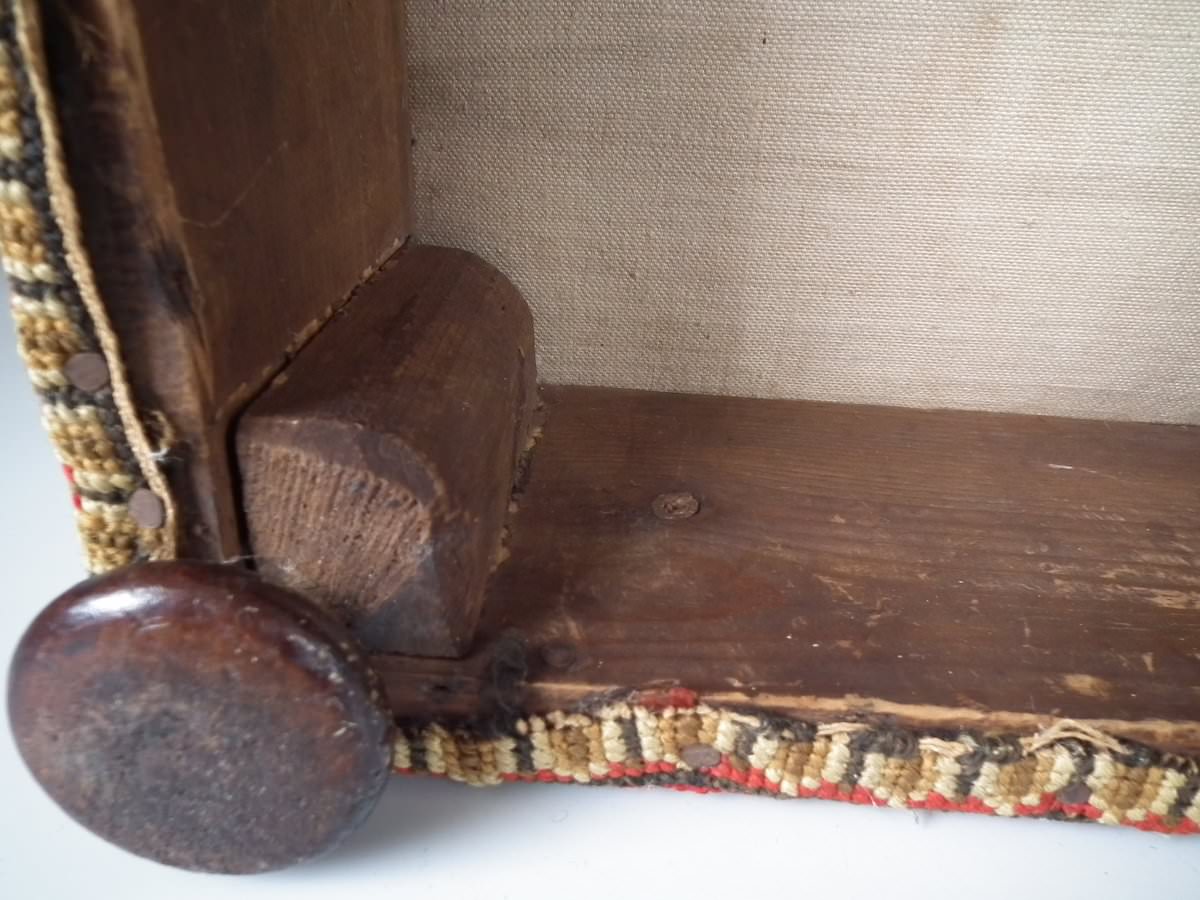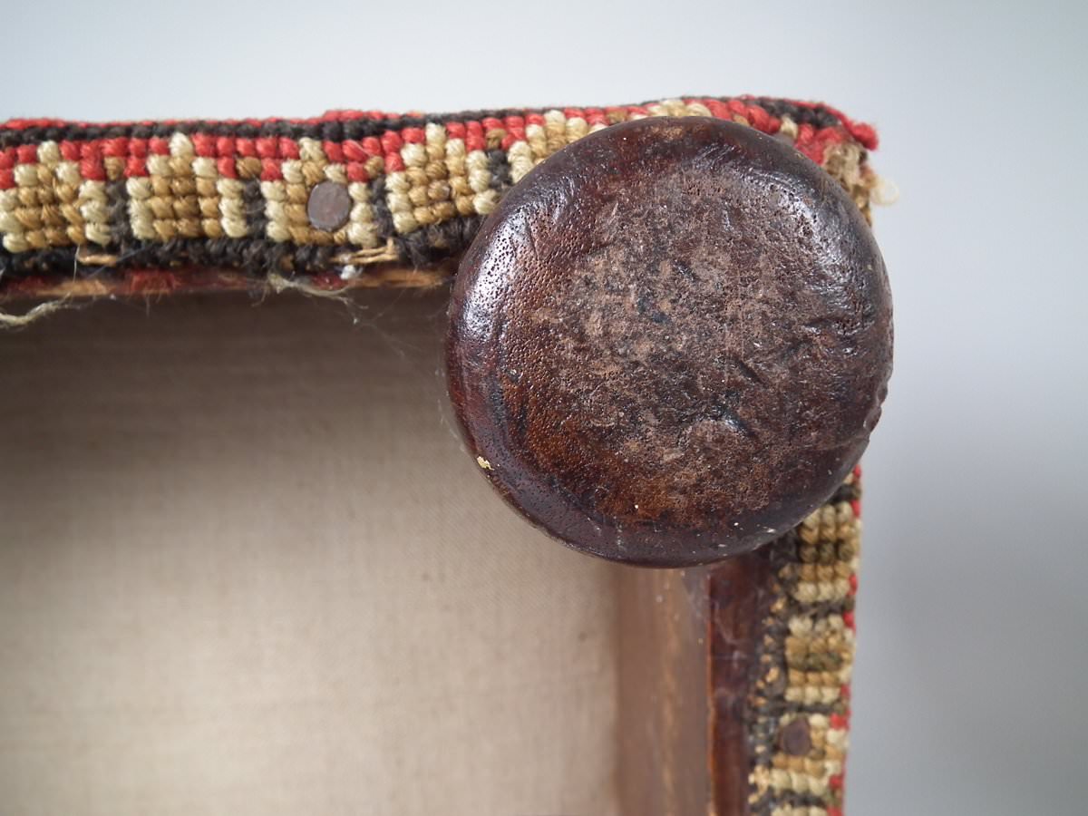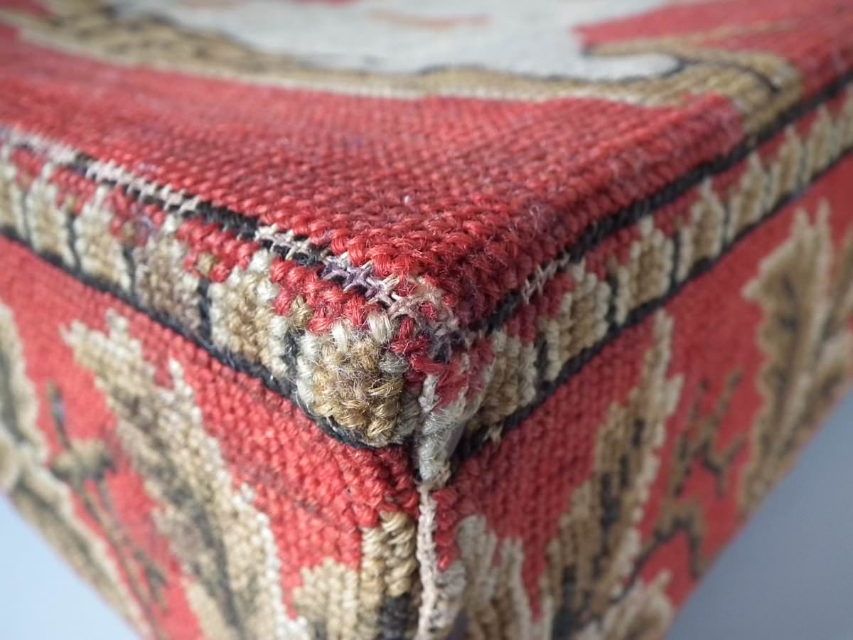 Victorian, circa 1870. 6.3ins high, 12.6ins wide, 13.4ins deep. Victorian Footstool with Embroidered Picture of Dogs Upholstery. The stitchwork is in wool on a canvas ground.