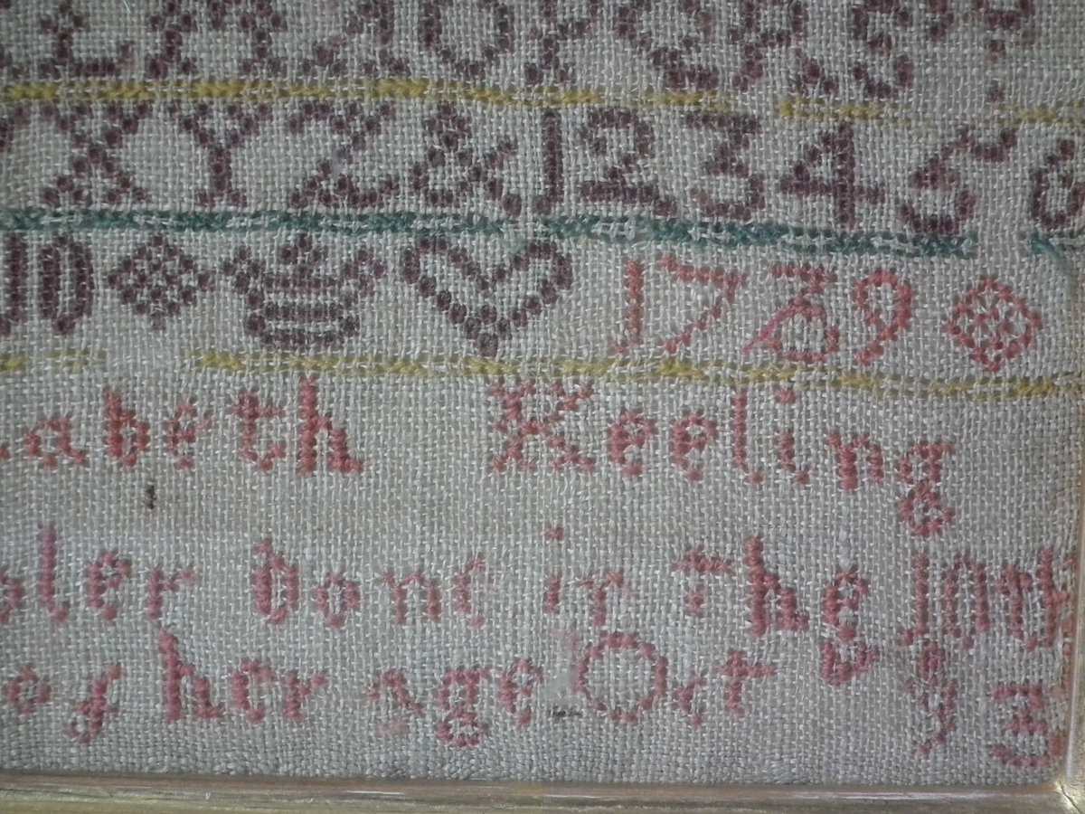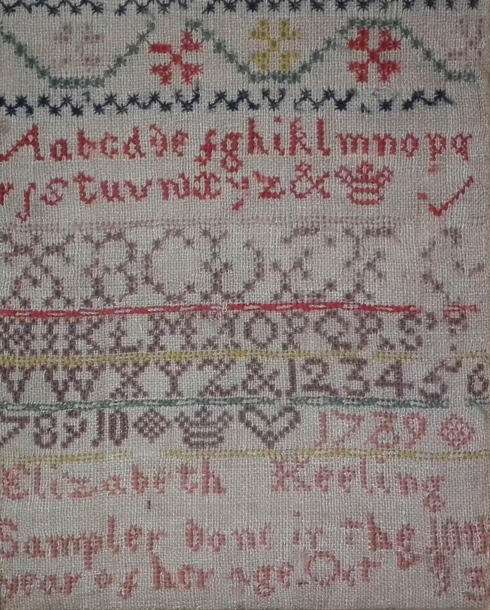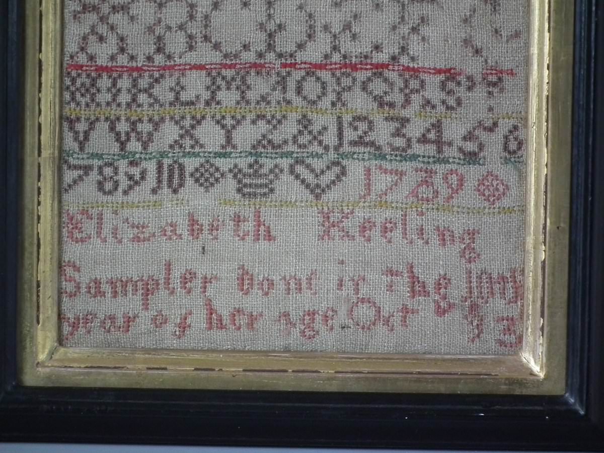 Signed and dated, '1739 Elizabeth Keeling Sampler done in the 10th year of her Age Oct 13'.
