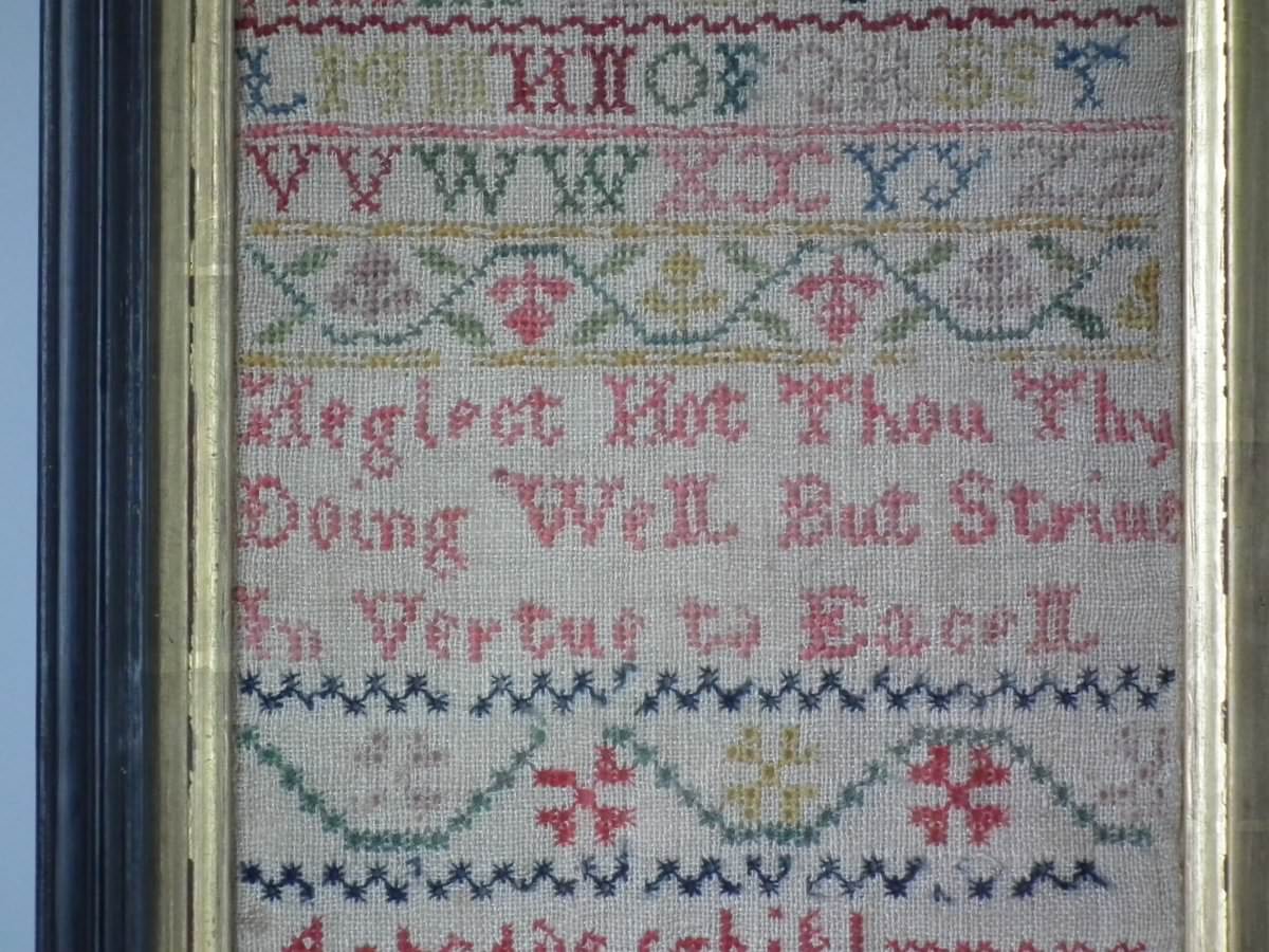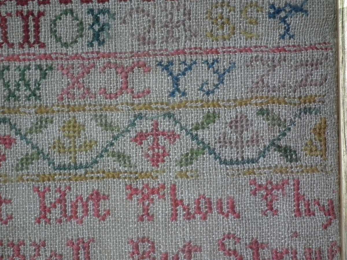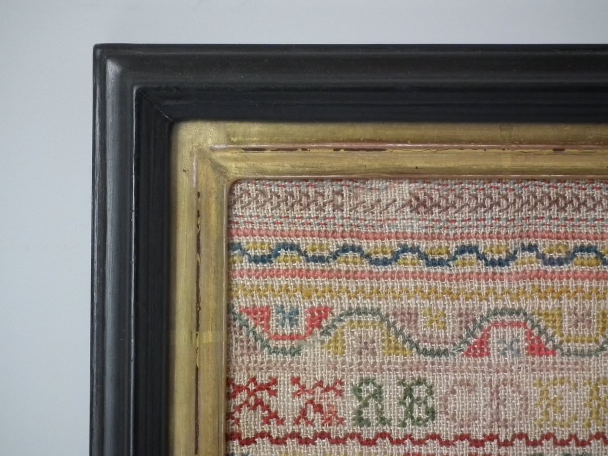 Mounting: The sampler is fixed to card. Frame backed with chipboard and brownpaper.