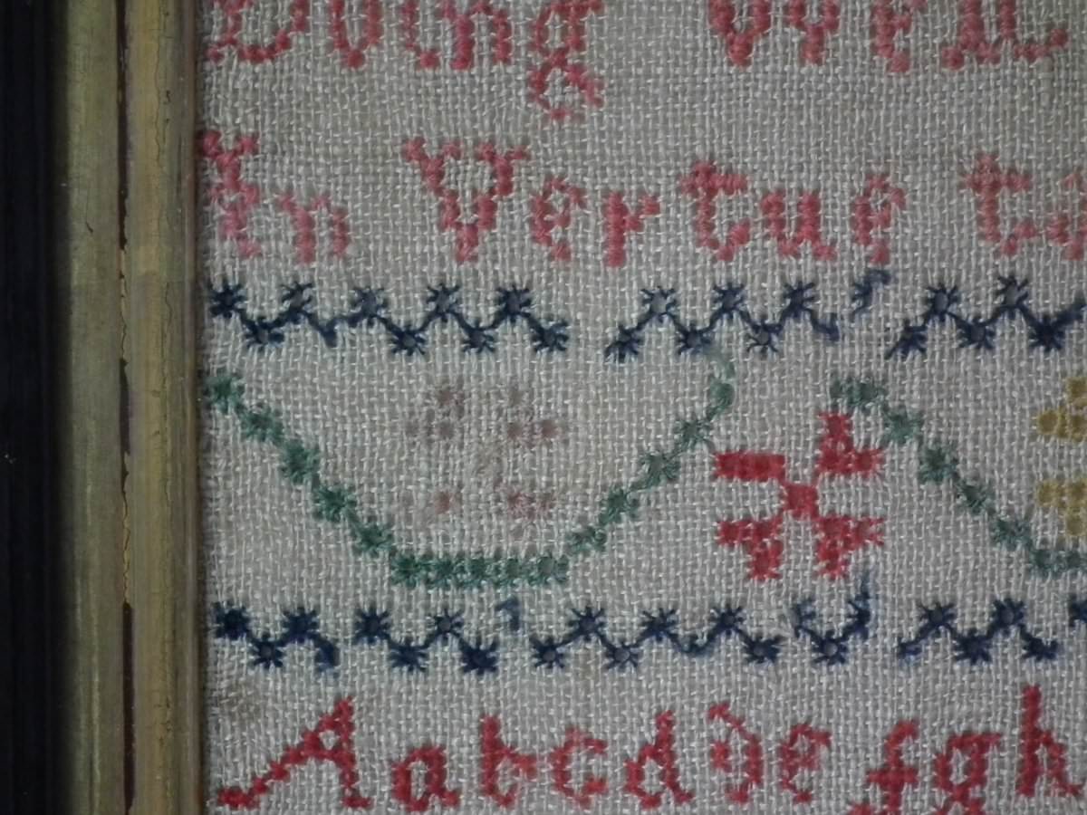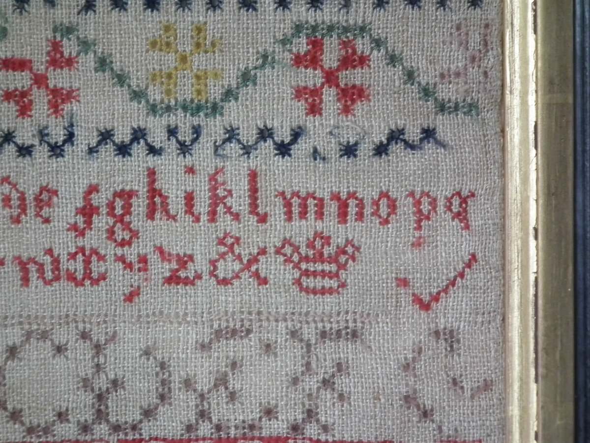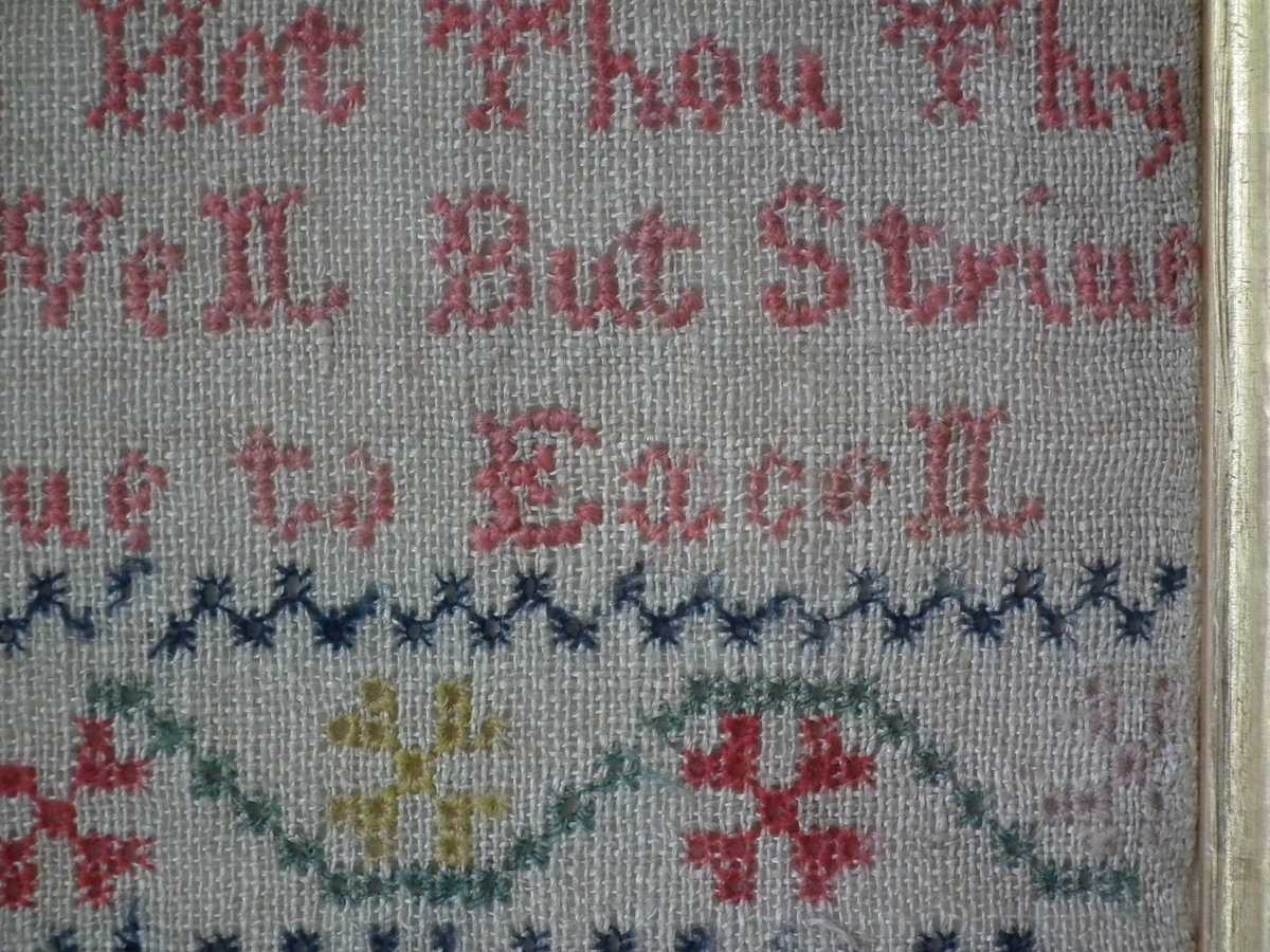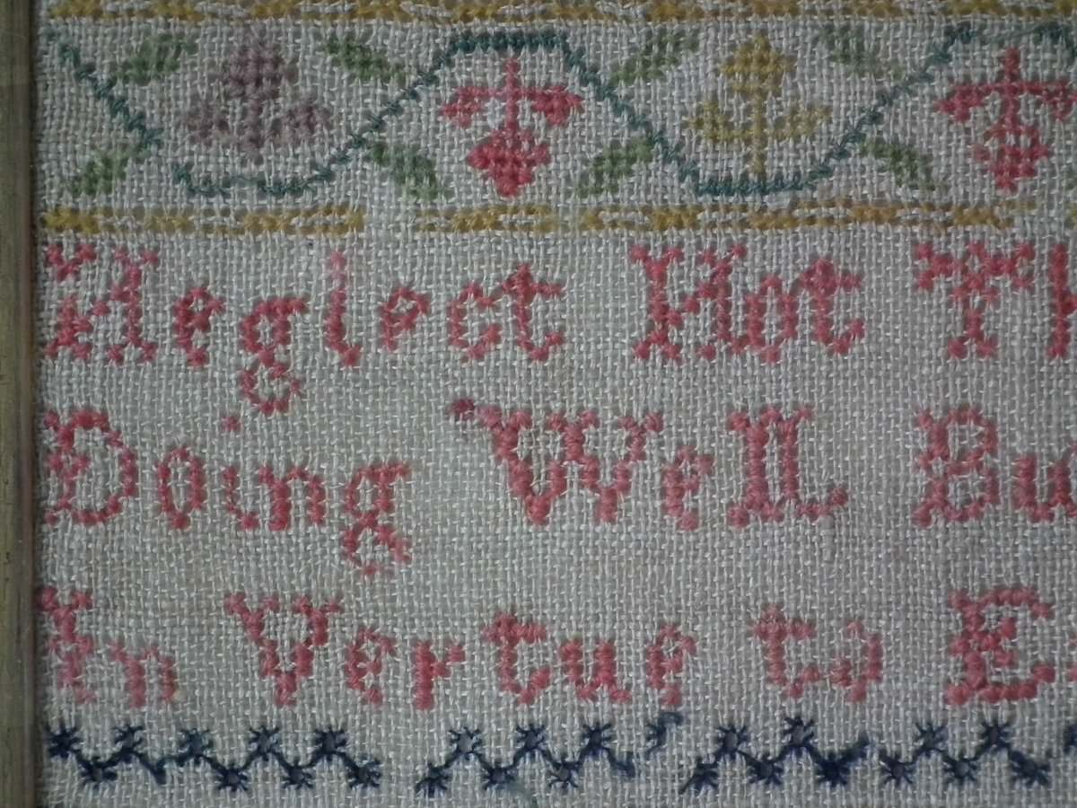 Mounting: The sampler is fixed to card. Frame backed with chipboard and brownpaper.