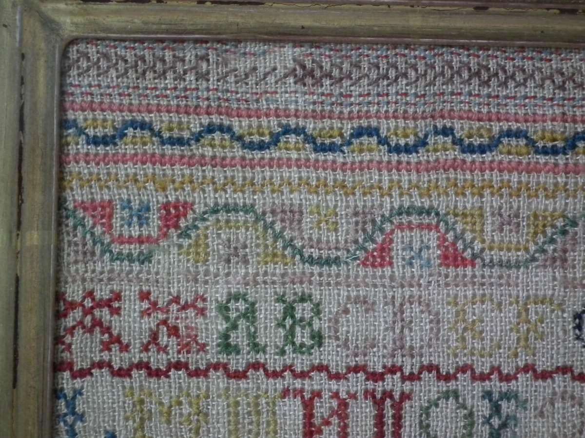 The sampler is worked in fine wool on canvas ground, in a variety of stitches including Algerian eye.