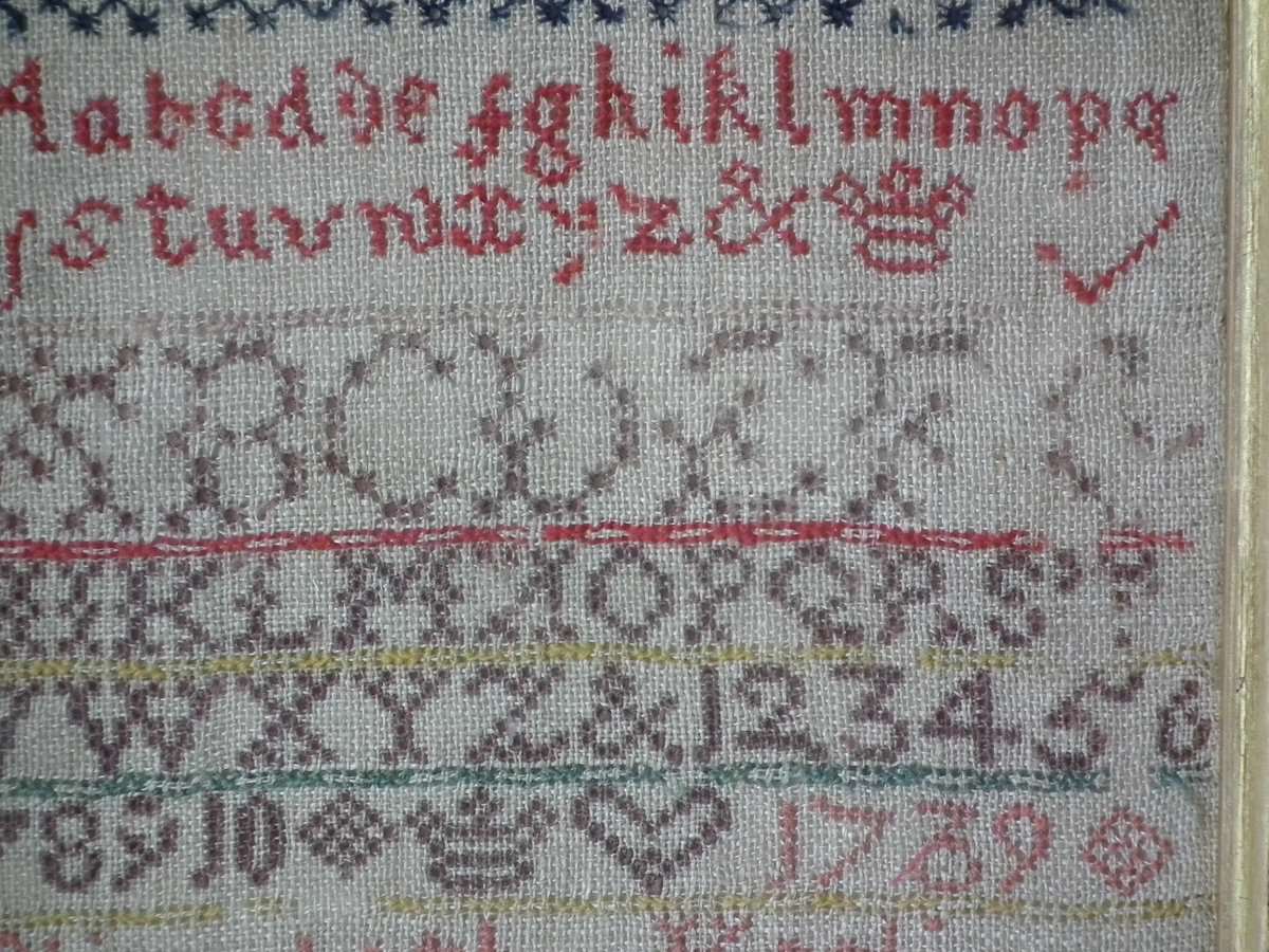 George II, dated 1739. 16.5ins high, 7.1ins wide, 1ins deep. 1739 Sampler by Elizabeth keeling.