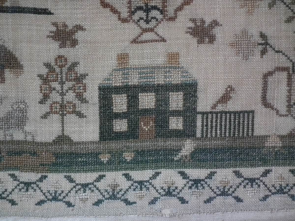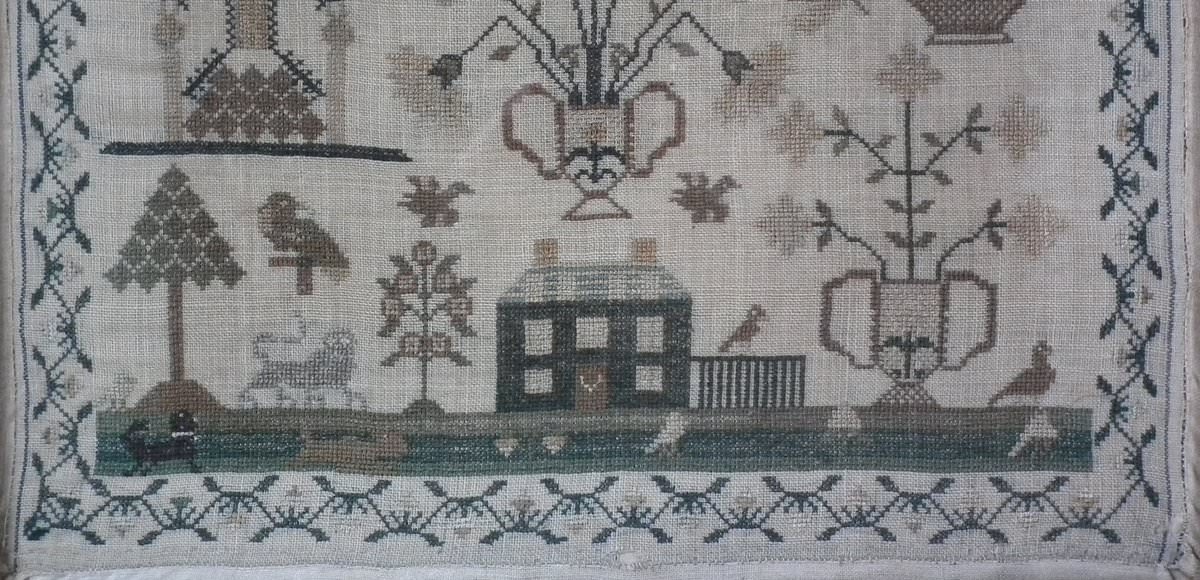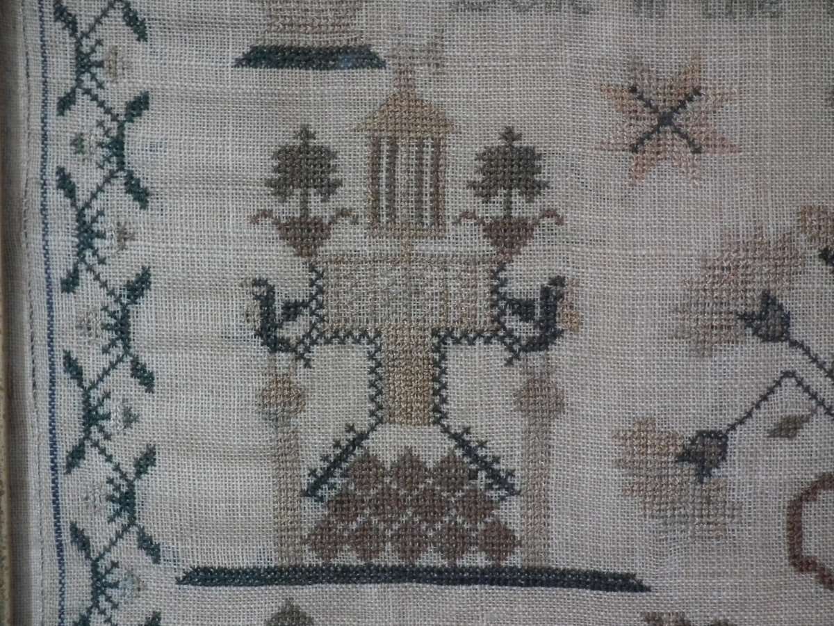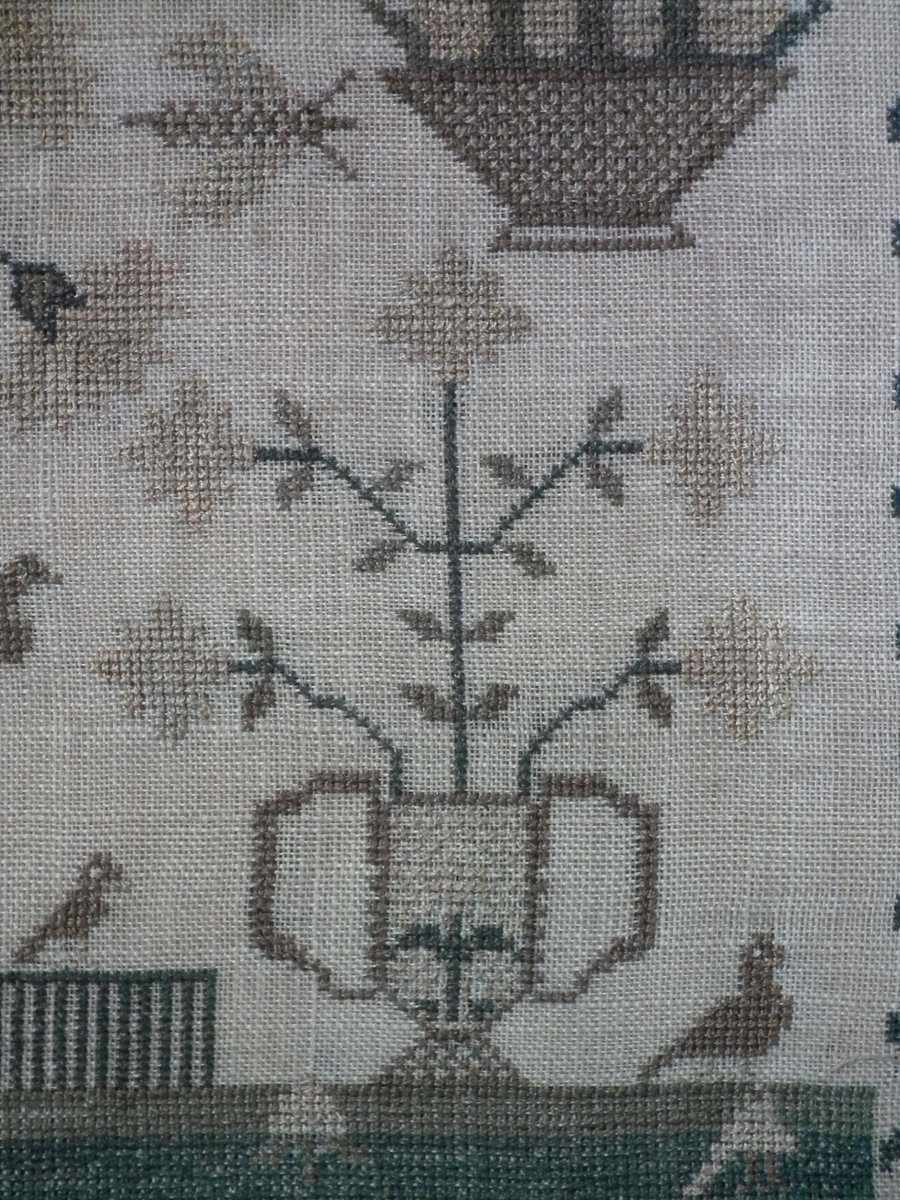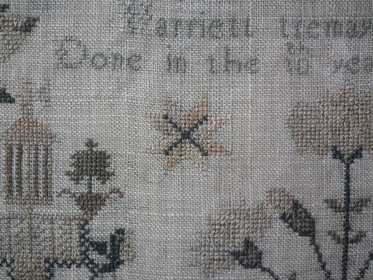 The sampler is worked in silk on linen ground.